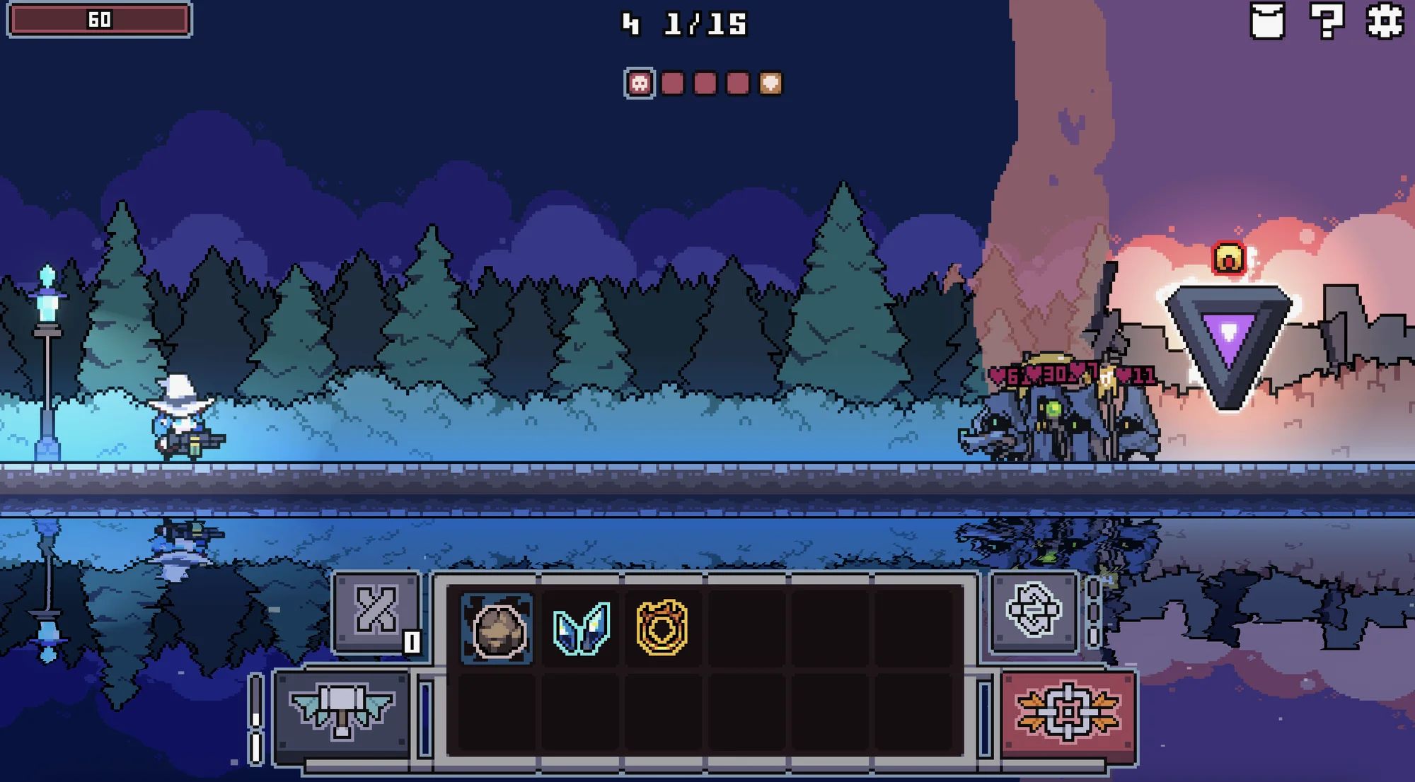 整个游戏中一共有六种元素的子弹,而每个角色只能够得到四个元素的子弹。这些元素各自的属性特点和相互之间的联动都很直接,几乎都是以数值为核心。例如:火元素对应“灼烧”——每回合扣除敌人血量、冰元素对应“寒冷”——降低敌人移动速度,而这些都是可以叠加层数的效果,有些时候你也会获得冰与火之间的联动效果,火属性和冰属性将相辅相成。所有策略性几乎都沉淀在弹匣的排序和子弹选择当中,但这些决策的代价极低,玩家可以随心所欲的选择尝试自己想要的构筑,一旦有所错误也能够轻松用**“熔金术”**(剔除子弹和刷新子弹选项的通用资源)改正。玩家只需要考虑如何培养出更高伤害的子弹。局外成长上: