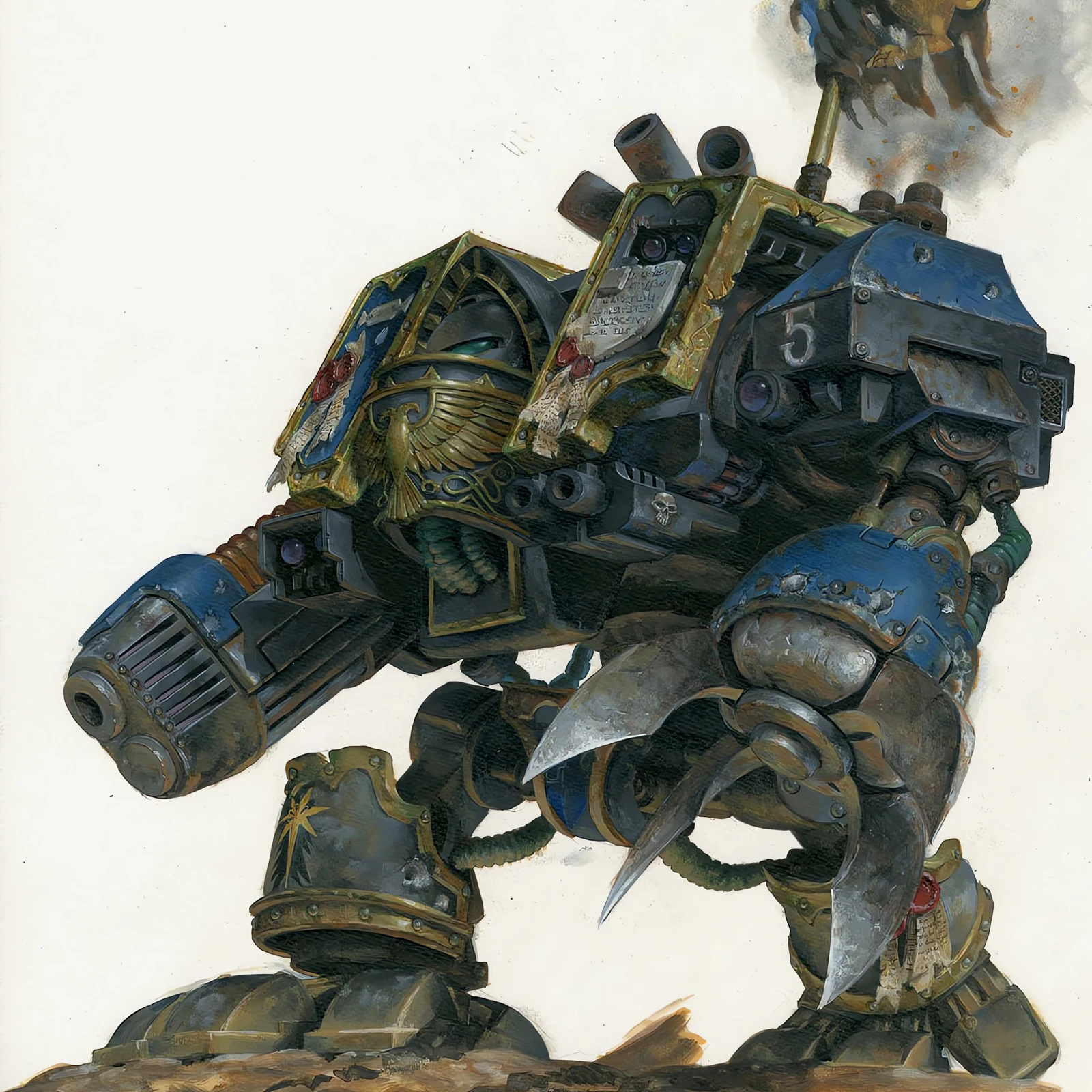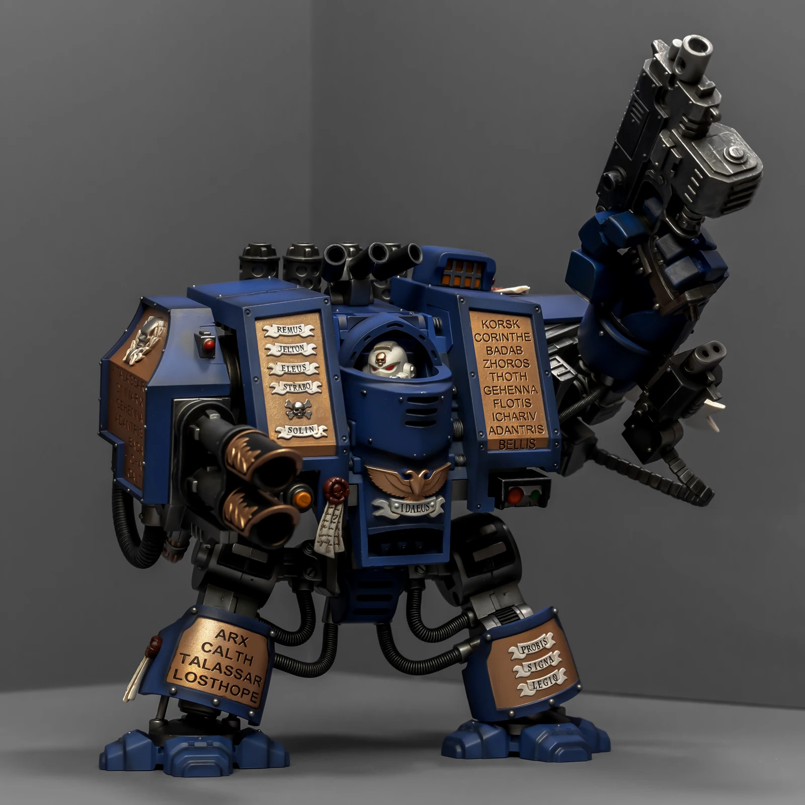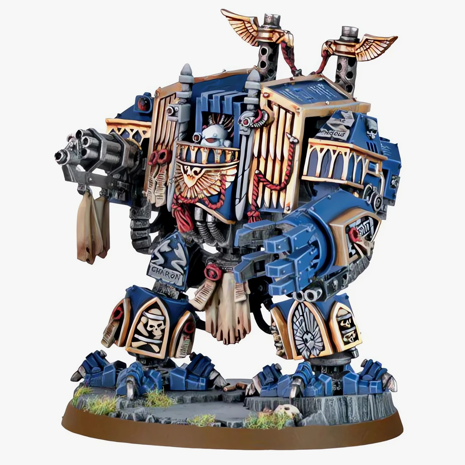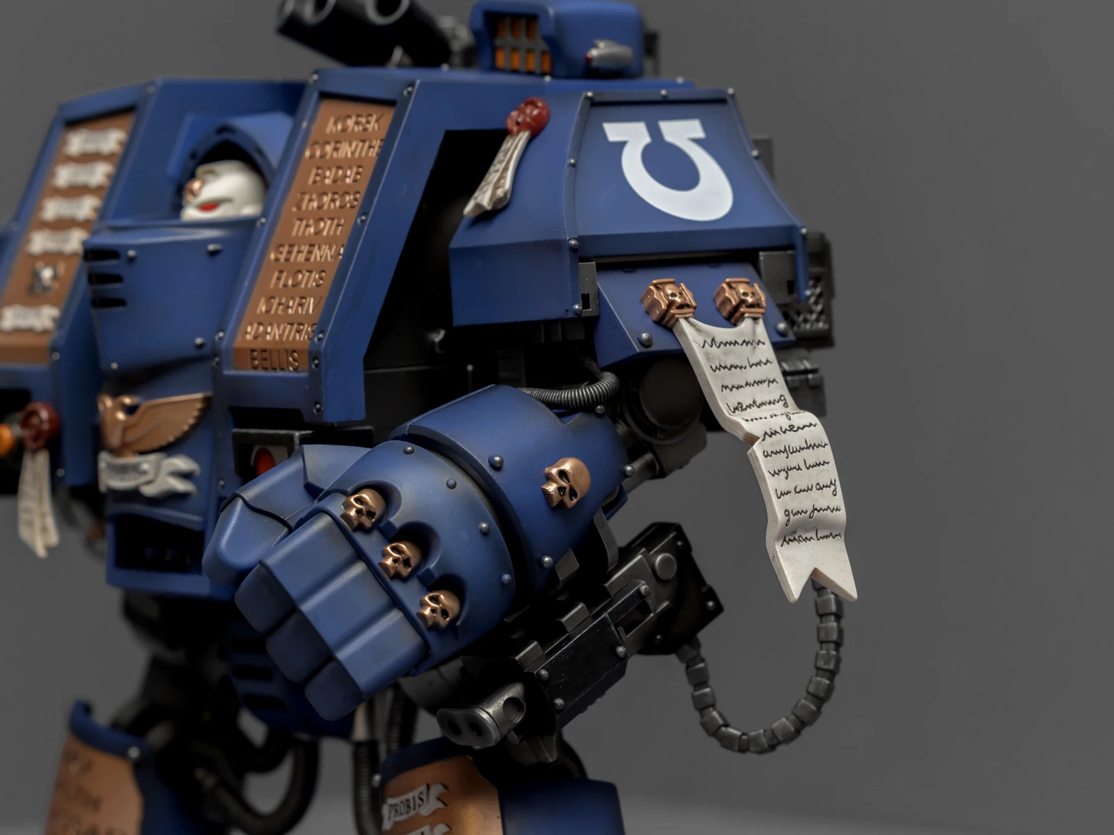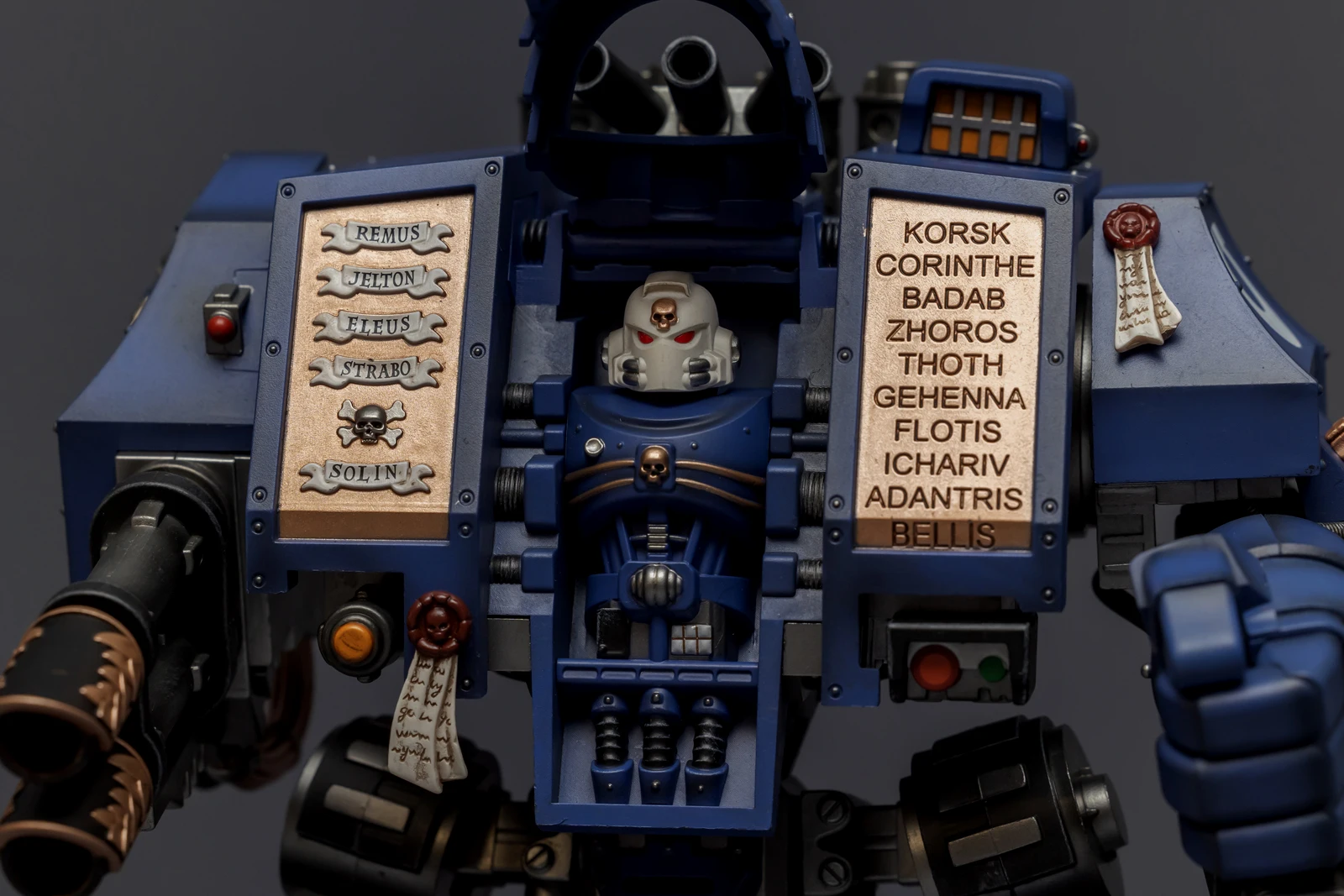 神圣无畏是铸铁型无畏机甲的变体,这些活动棺材里存放的都是各个战团最年长、最睿智的星际战士的残躯。虽然这些古老的战士受到其他阿斯塔特的尊敬,但也被认为易受混沌腐化,因此机甲上覆盖着大量纯洁印记与反恶魔纹章。