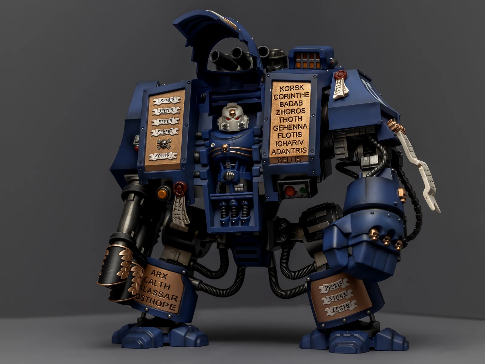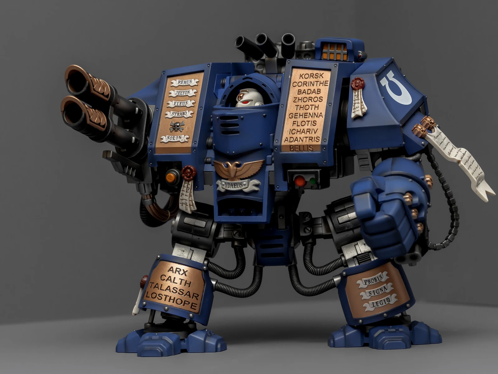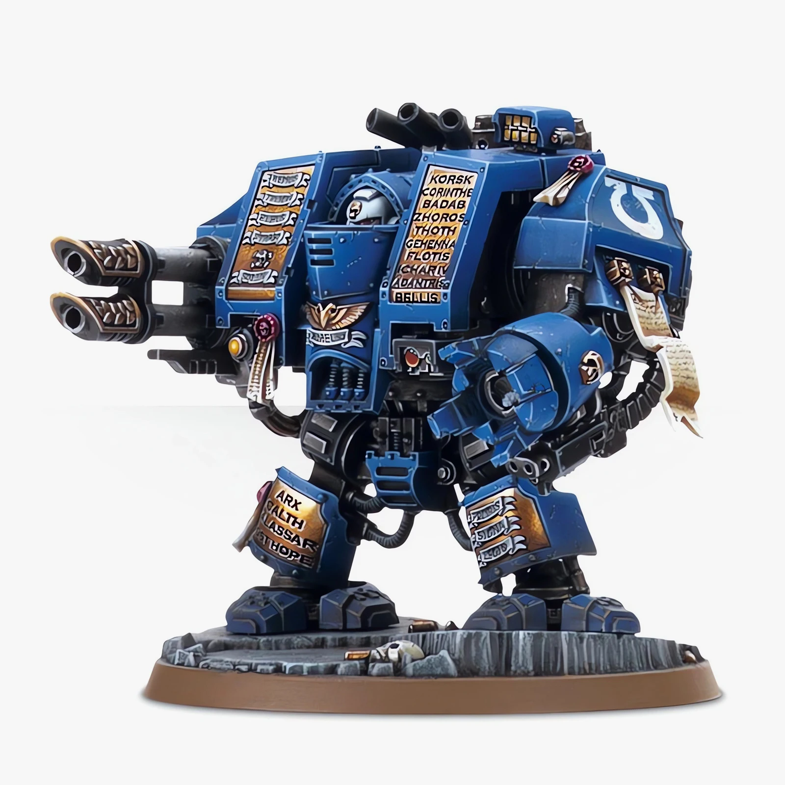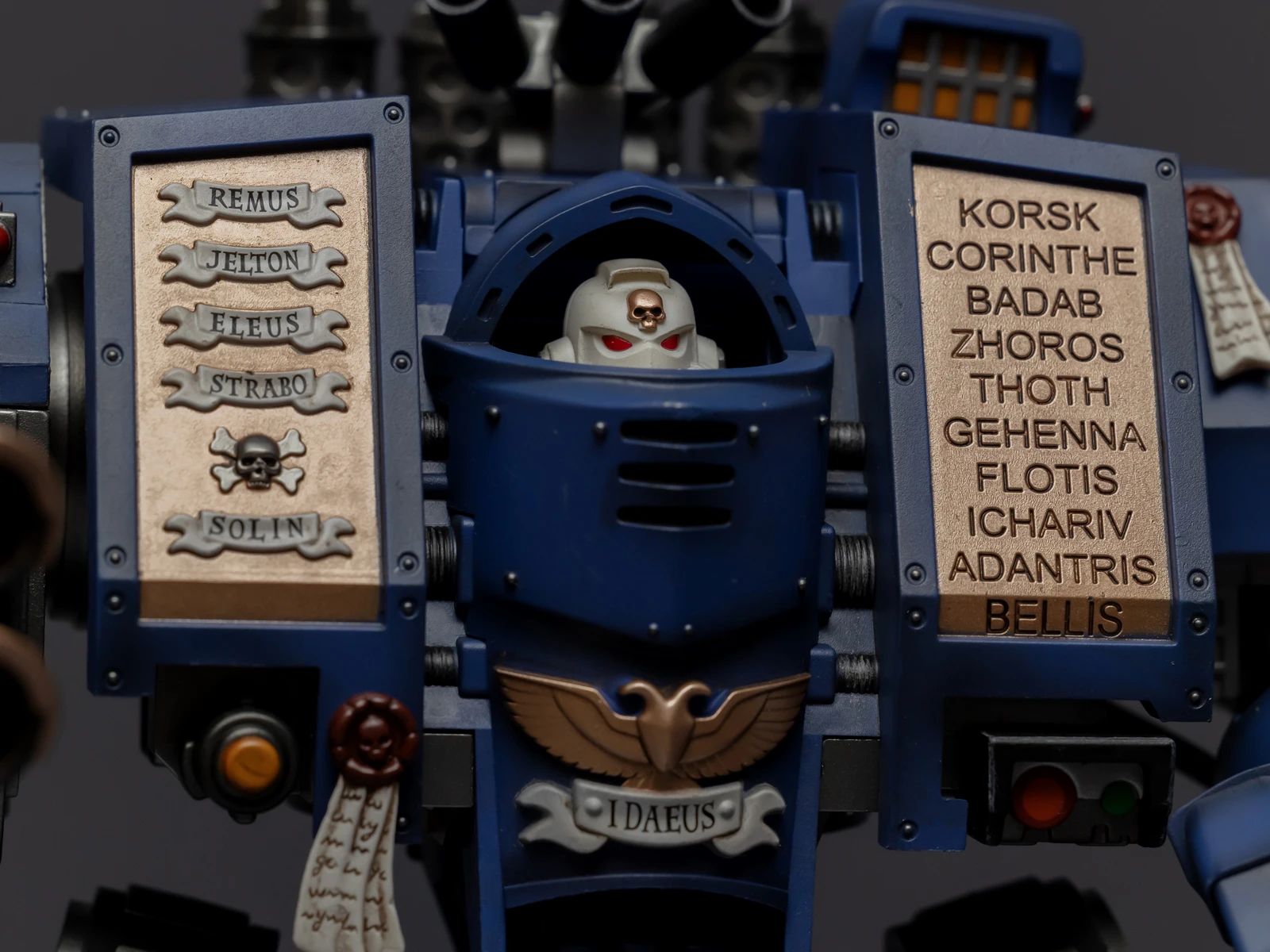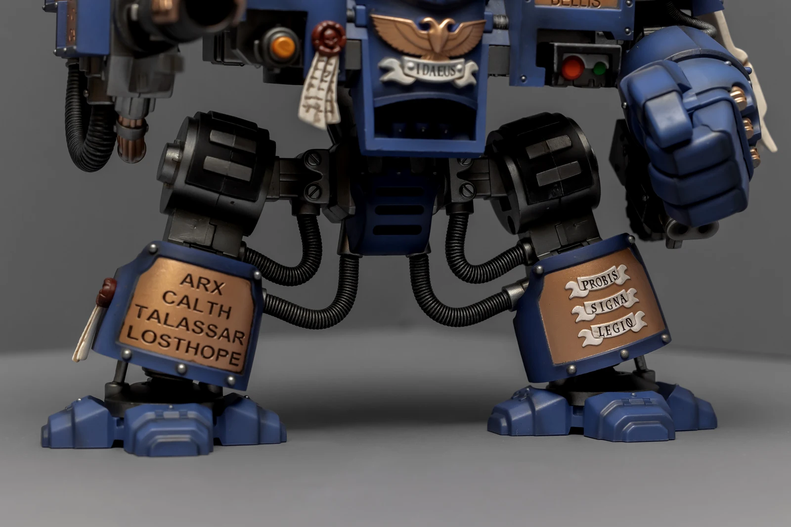 神圣无畏是铸铁型无畏机甲的变体,这些活动棺材里存放的都是各个战团最年长、最睿智的星际战士的残躯。虽然这些古老的战士受到其他阿斯塔特的尊敬,但也被认为易受混沌腐化,因此机甲上覆盖着大量纯洁印记与反恶魔纹章。