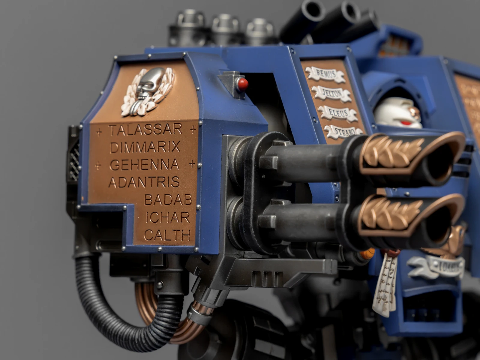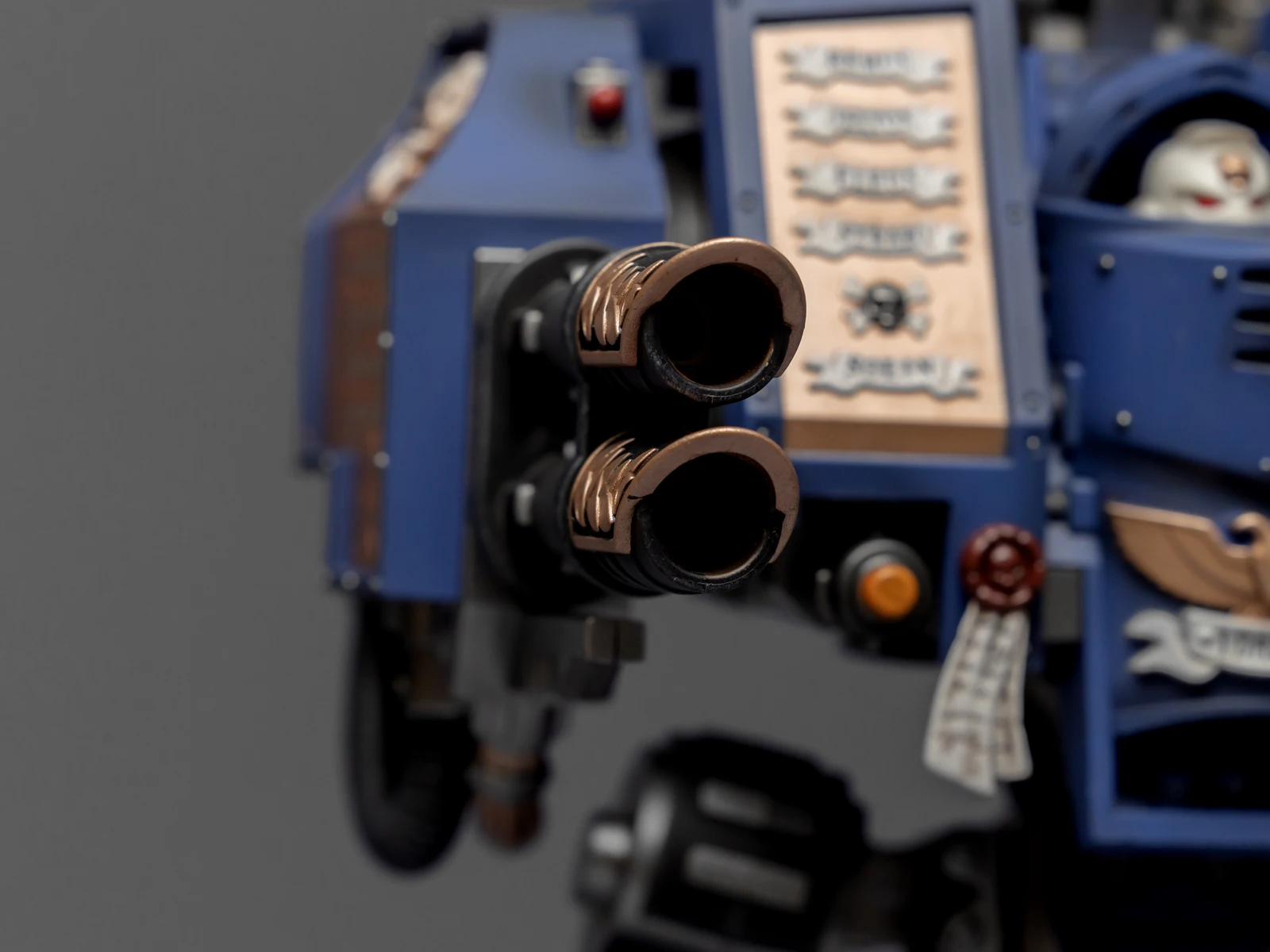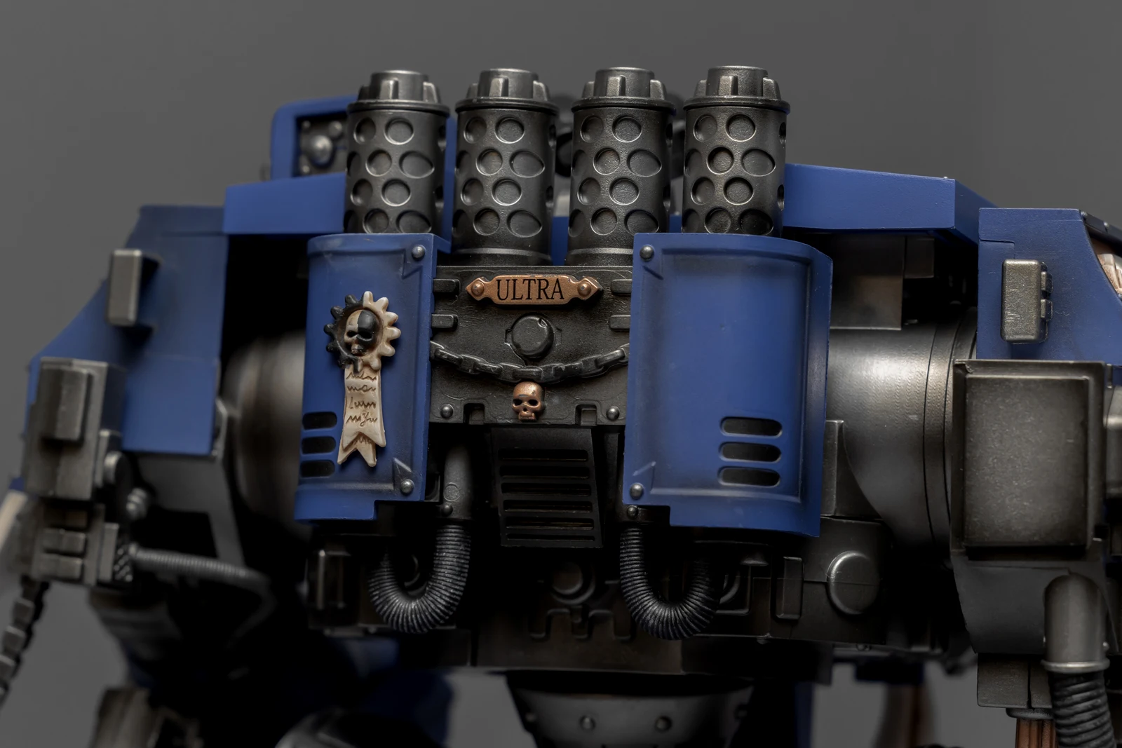 极限战士的神圣无畏机甲动力应该很强劲,背后有四根排气管,顶部的三管小炮是烟雾弹发射器。机甲正中的维生舱外甲露出白色老兵头盔,舱盖能向上翻开。舱盖上的双头鹰鹰头线条非常简单,鹰头更像是鸭子头。我原本以为这是暗源一贯的偷懒行为,后来发现GW棋子上就是这样的,暗源只是忠实还原。