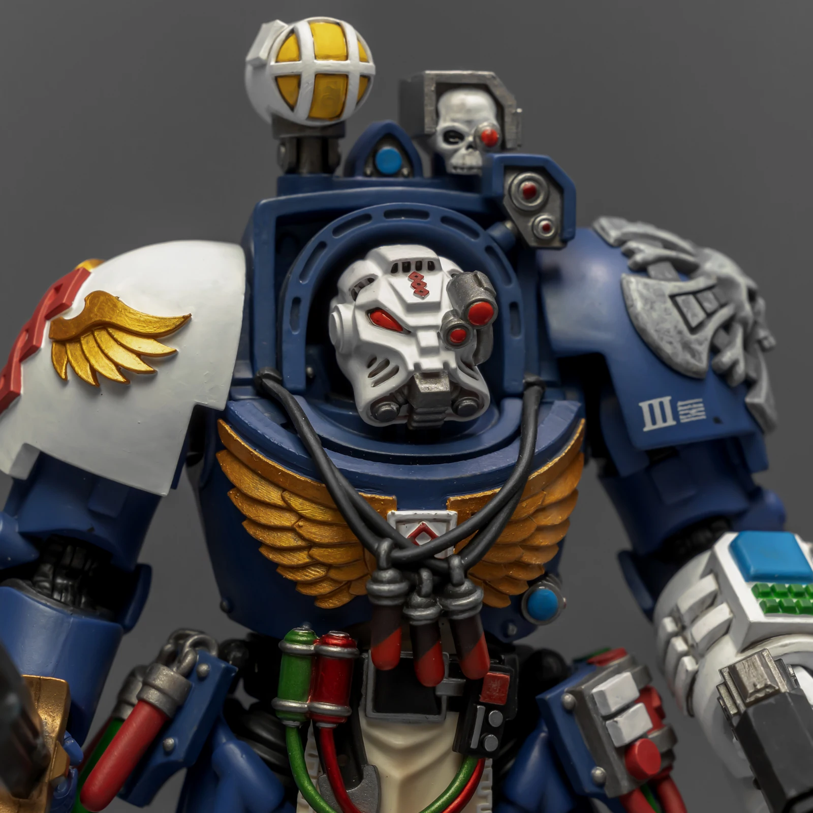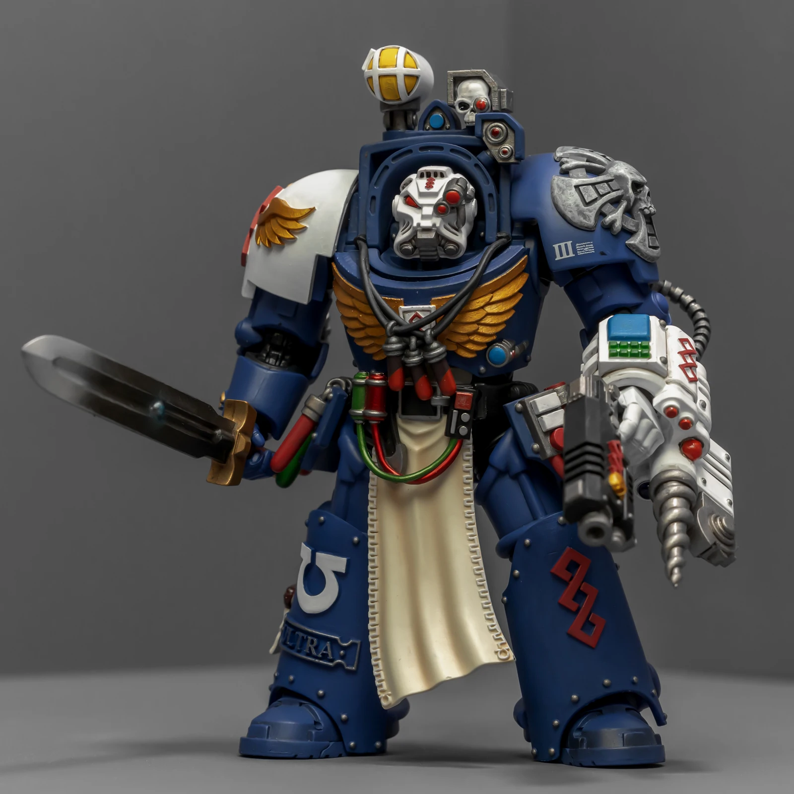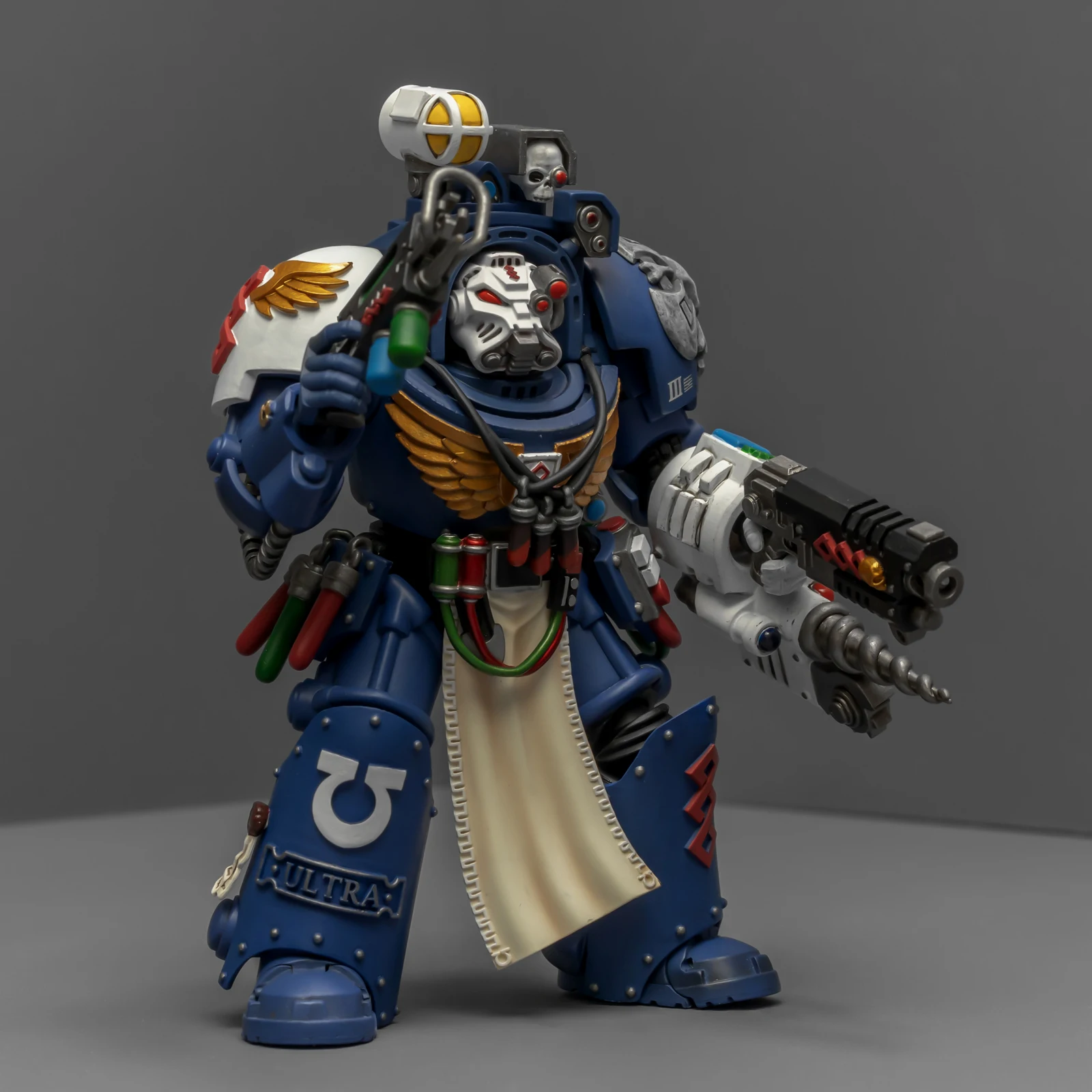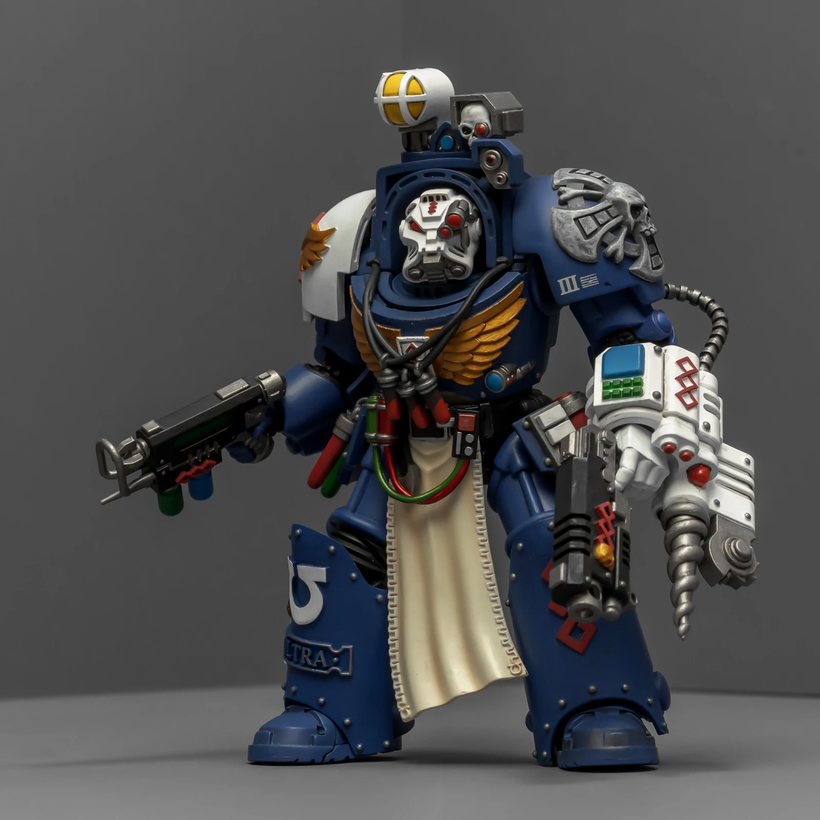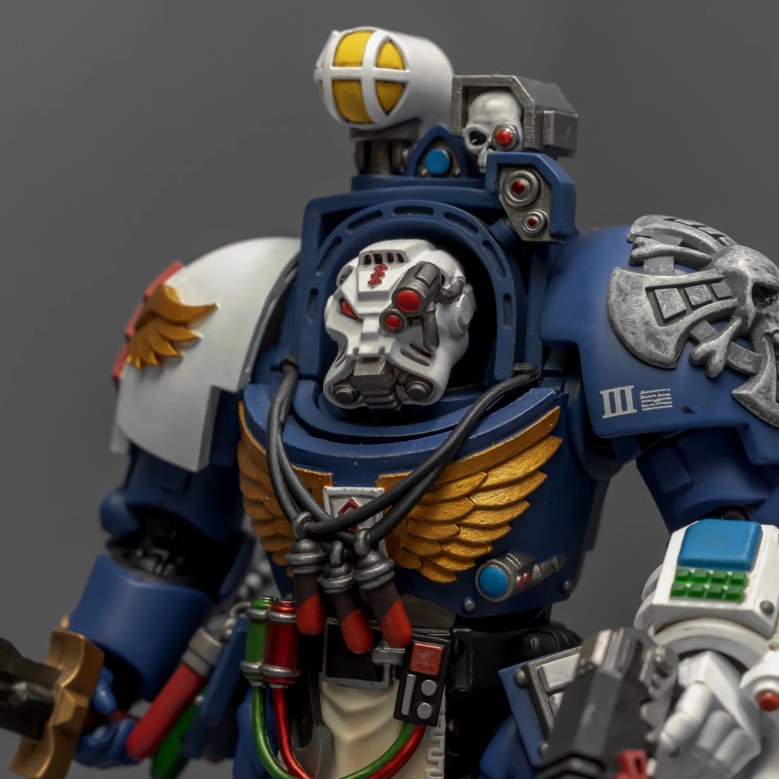 左臂的医疗套件能辅助药剂师完成本职工作,除了一些急救功能,作为以保存战死星际战士身上基因种子为主要职责的药剂师,医疗套件上更显眼的部分是基因回收器,包括可以破开动力甲的金刚石钻头和单分子锯。