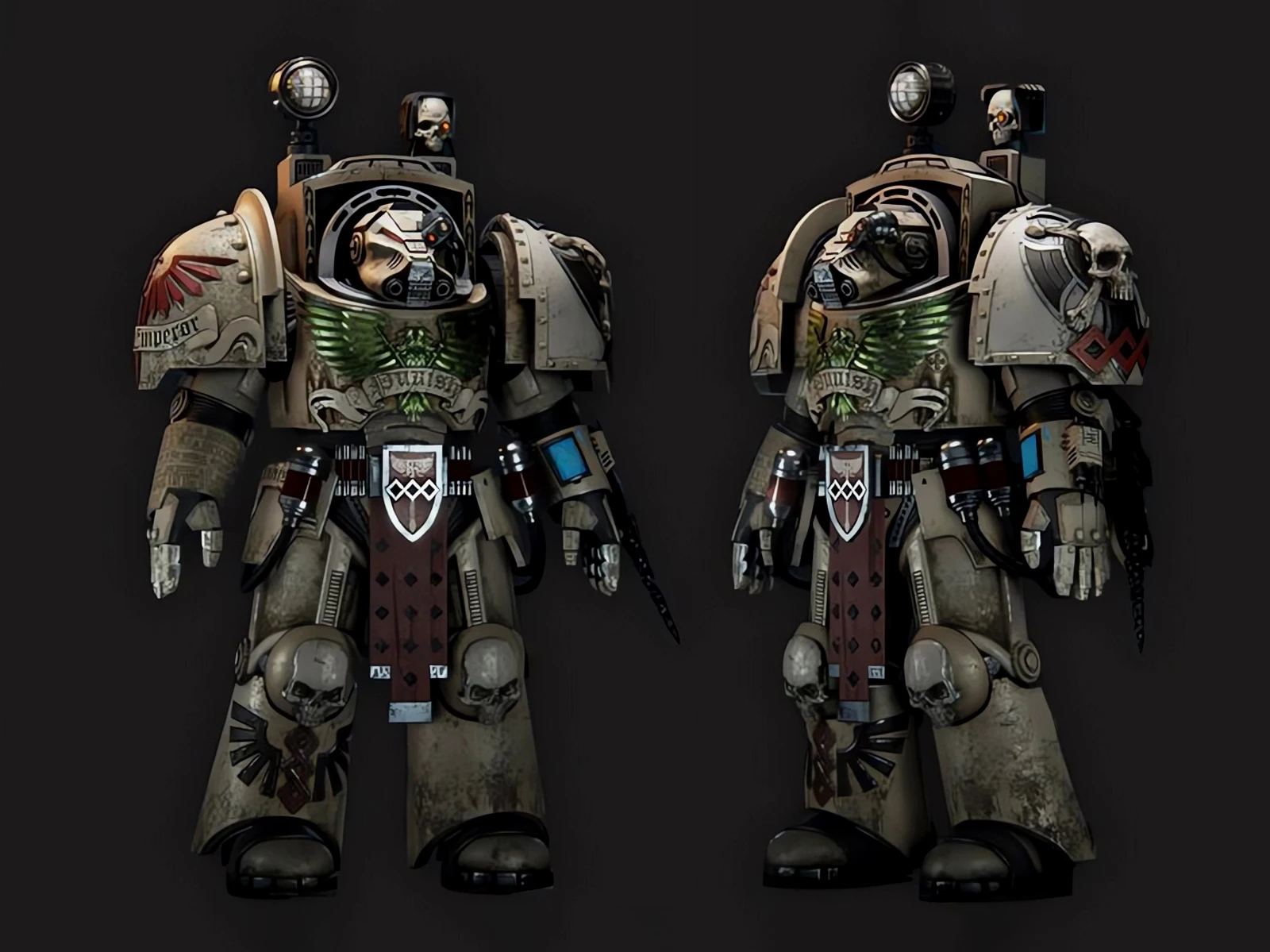 药剂师的标志是红色的“正螺旋”,乍一看很像是三个连接在一起的菱形,在改造成品的肩甲、头盔以及胸甲这些显眼位置上,这个标志都有醒目的体现。这个终结者头盔设计很有意思,除了正螺旋,额头还附带了醒目的诊断装置,配合肩背部的两件诊疗辅助配件,让药剂师能在战场上快速确认伤势、治疗伤员。