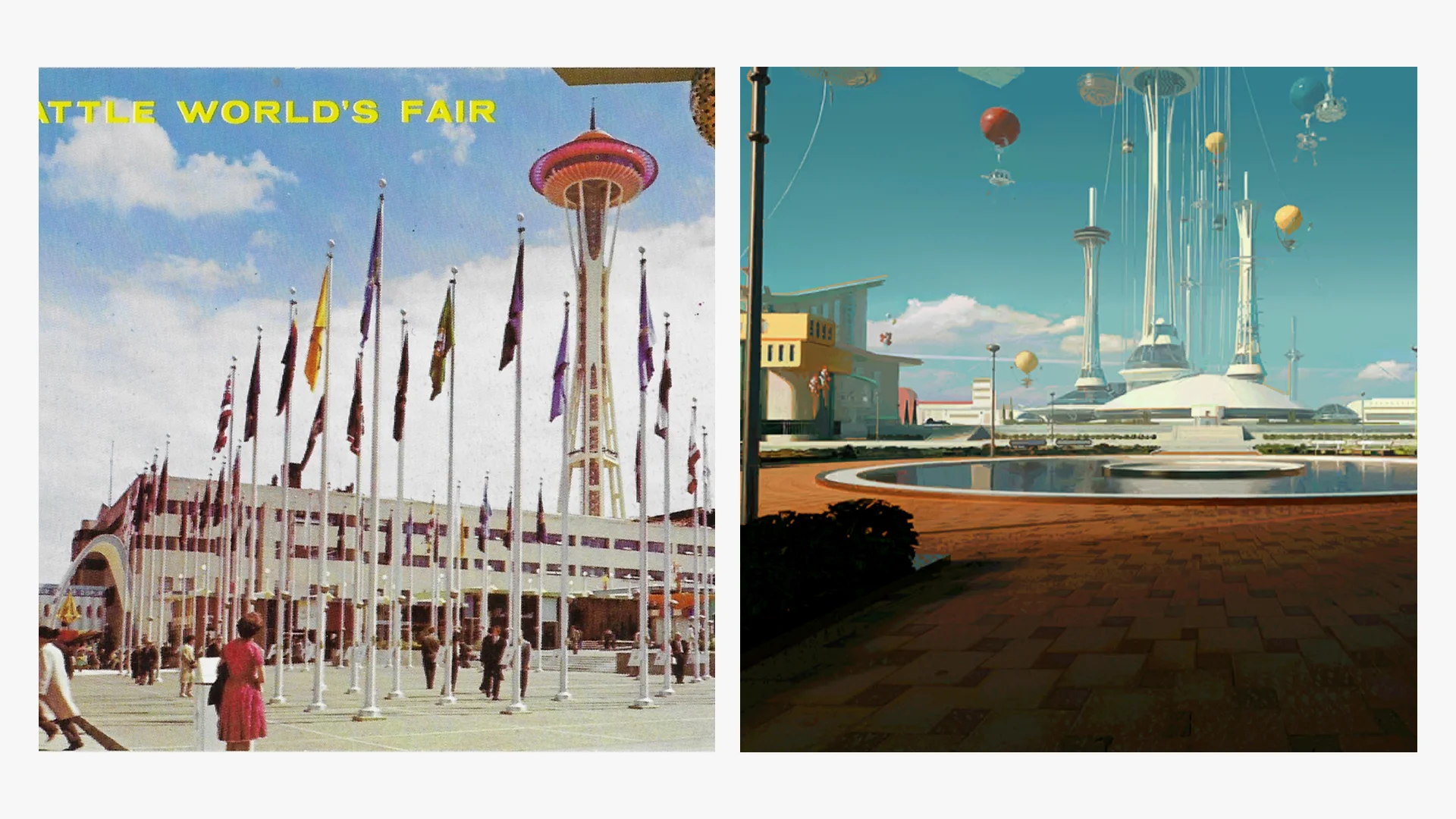 在“太空时代的人类(Man in the Space Age)”这一主题下,太空针塔、未来家庭、云端城市轮番登场。