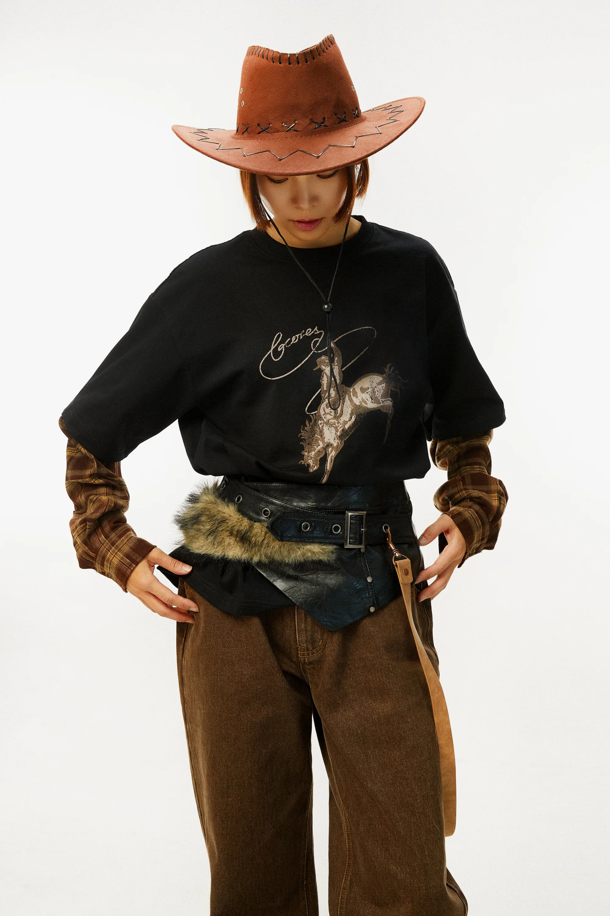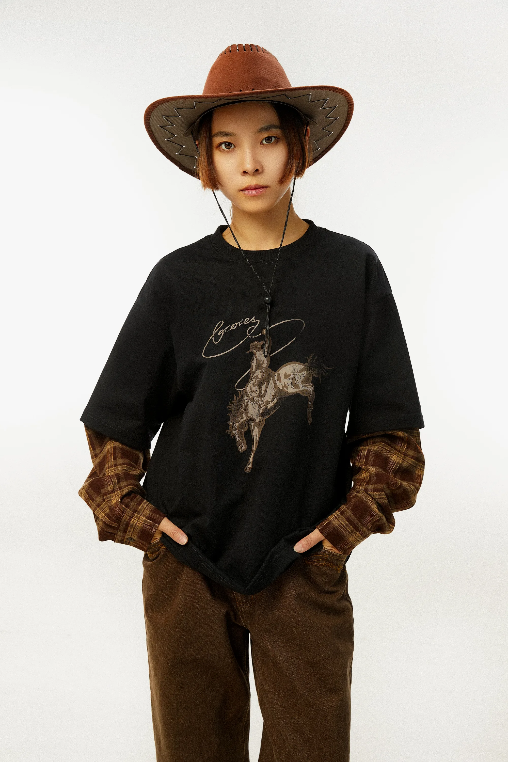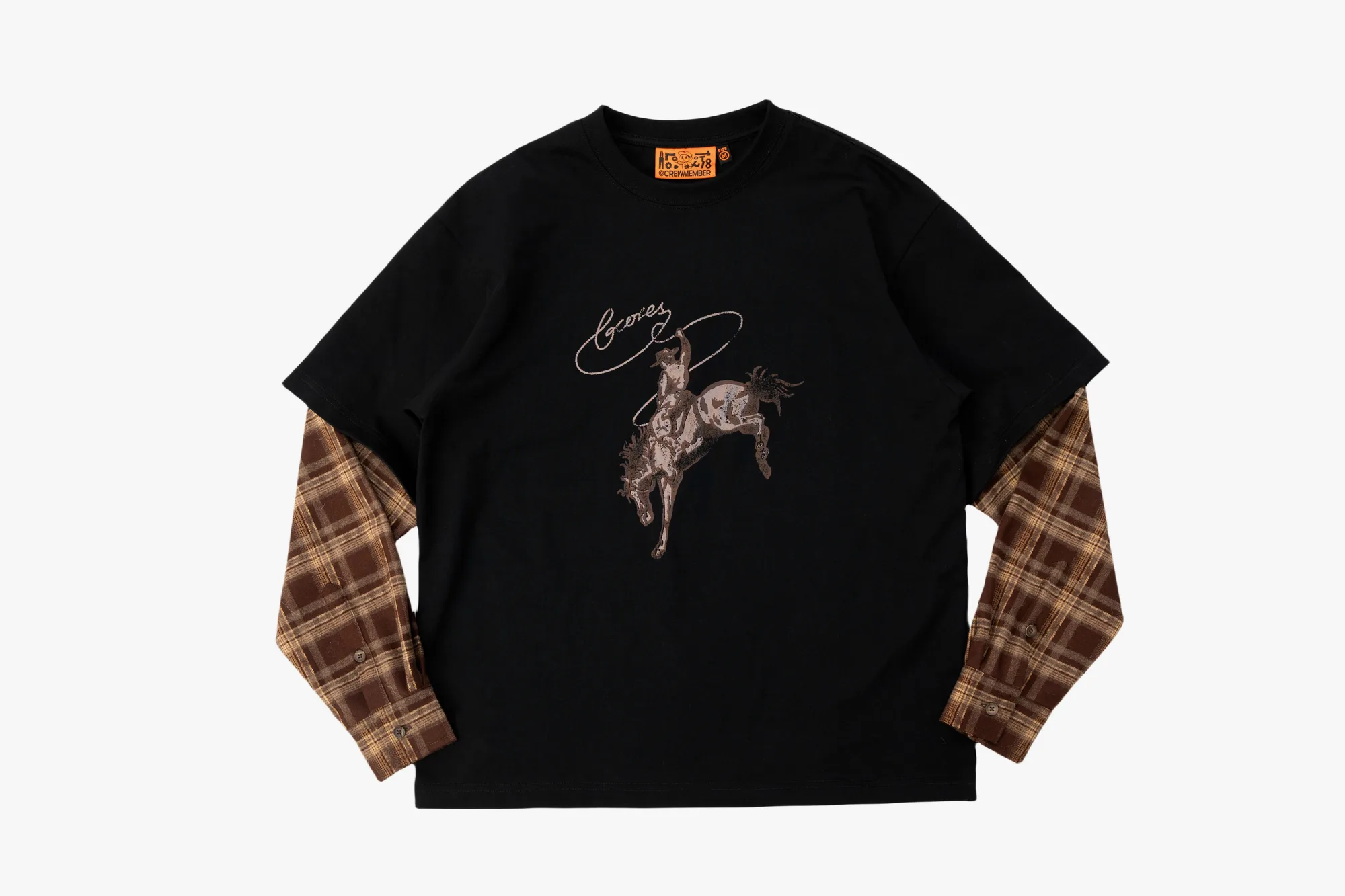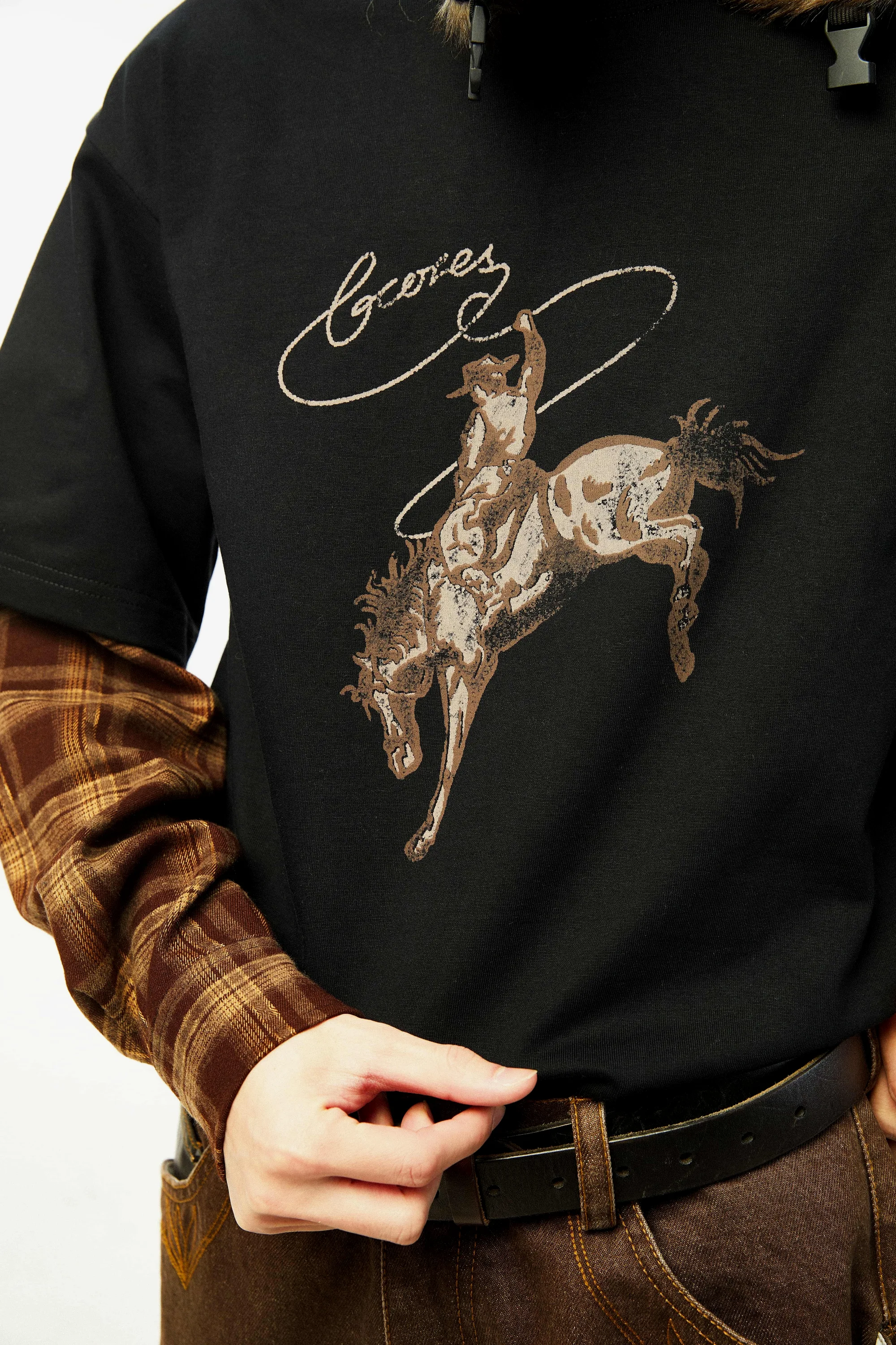 马年系列假两件长袖 T恤,巧妙融合了美式西部风情与现代叠穿美学,在沉稳的深色系中更添几分层次细节。