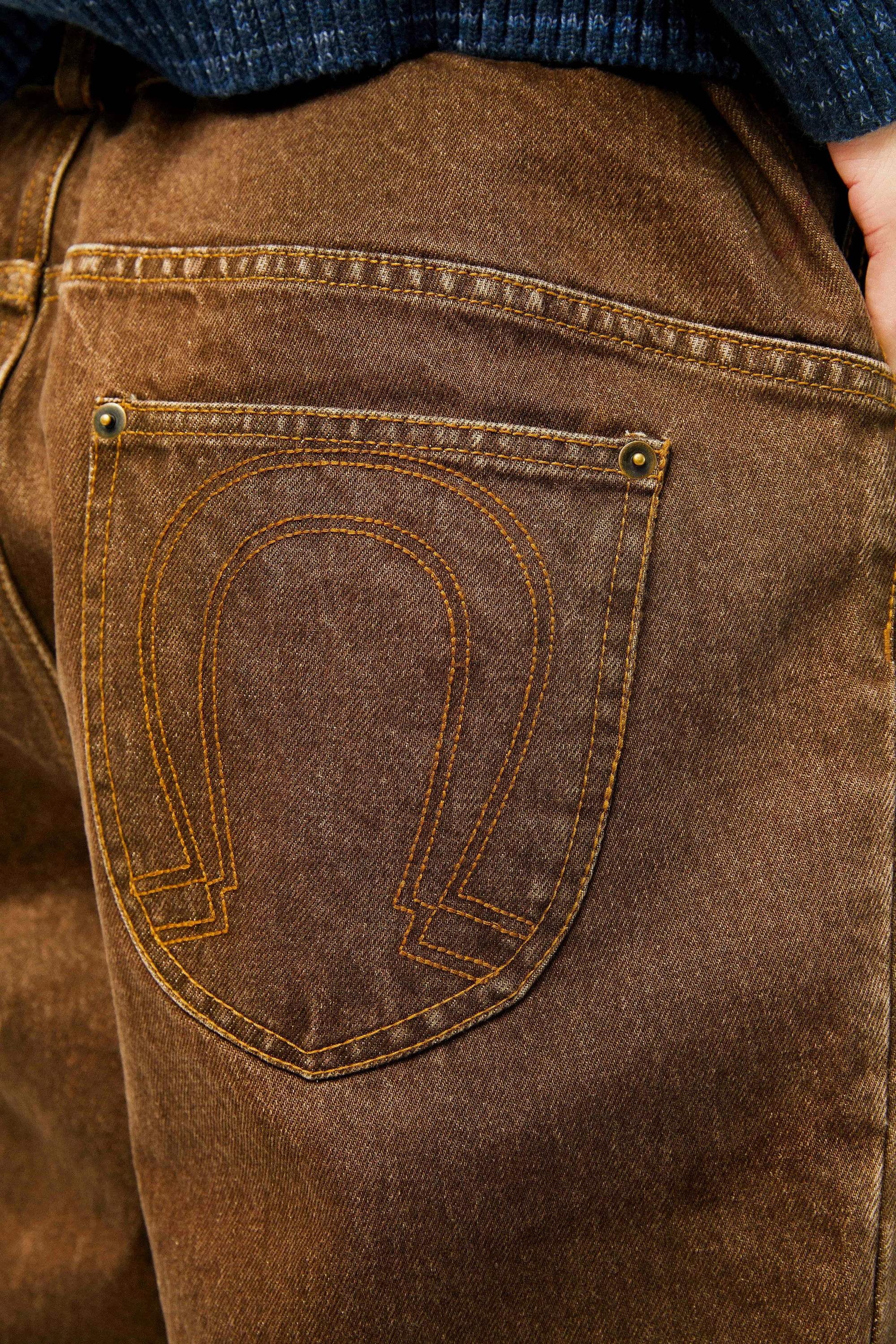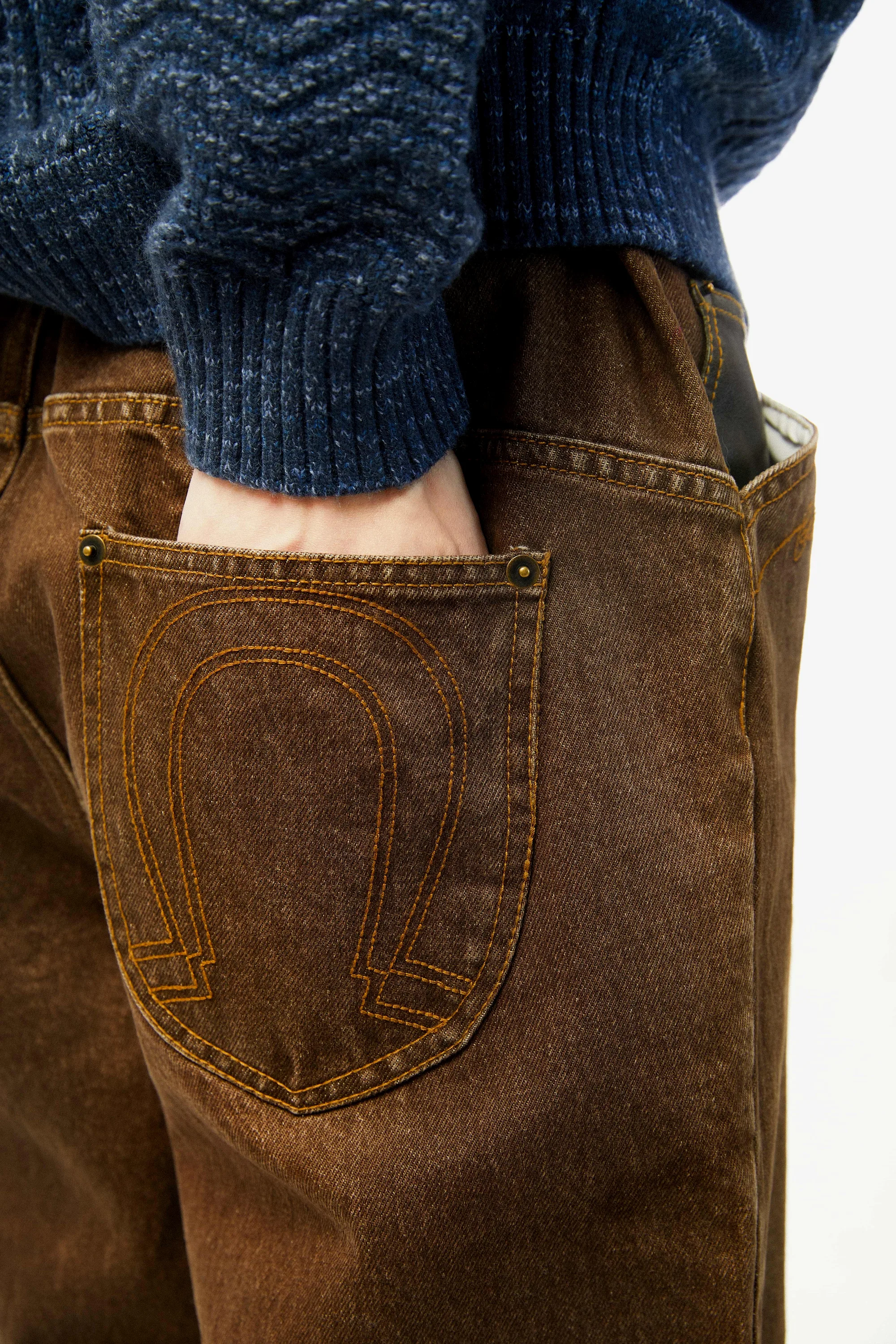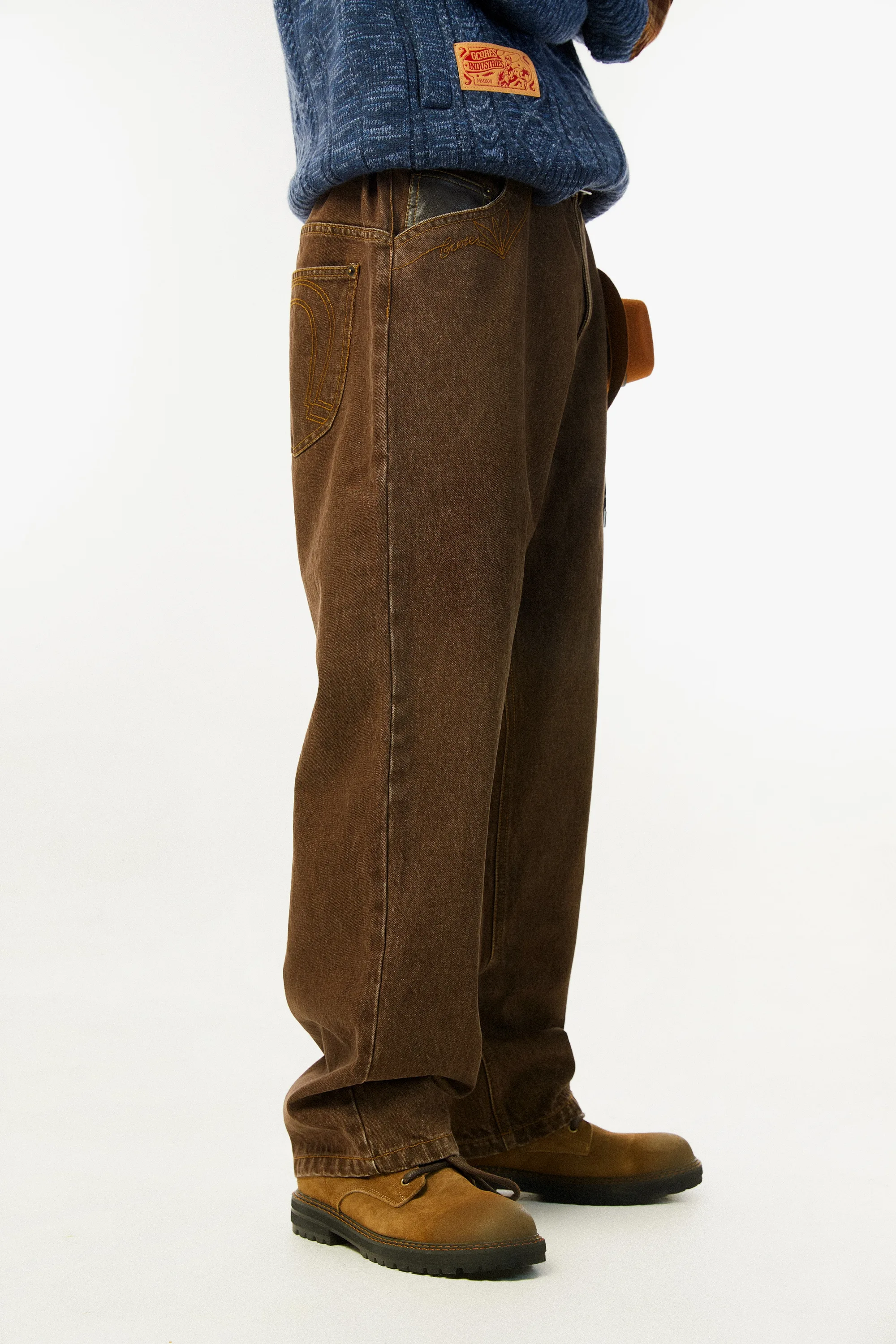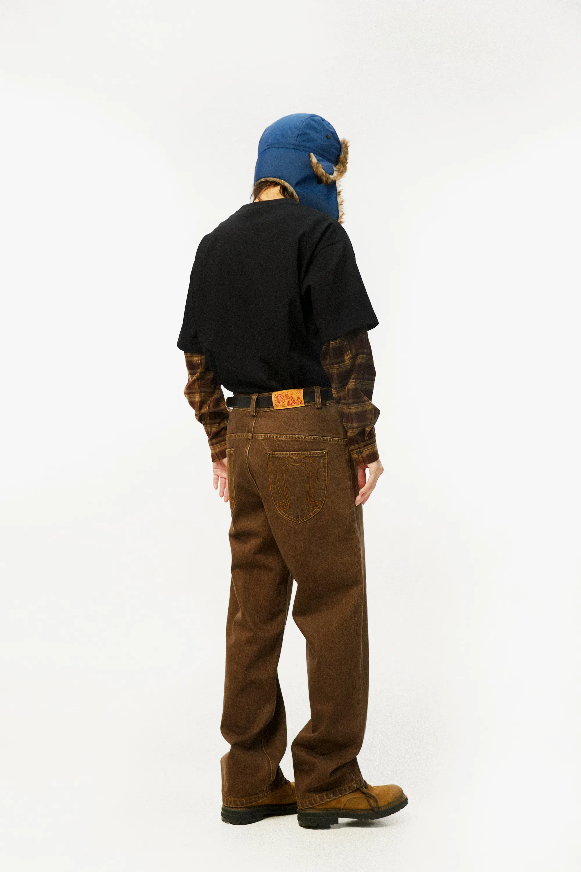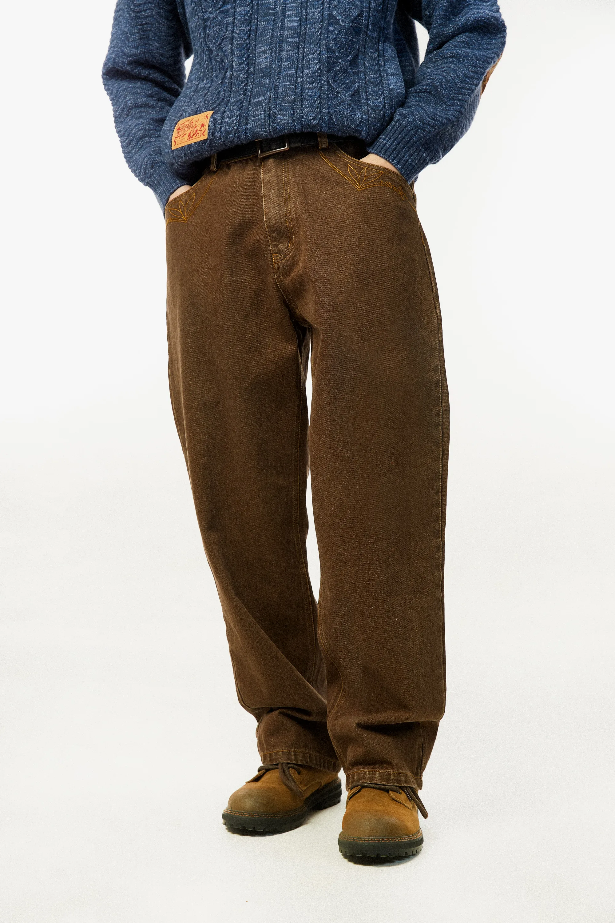 马年系列牛仔裤以醇厚的咖色调重塑经典丹宁美学,兼具复古主张与实穿主义。甄选 430g 高克重 100%纯棉面料,经成衣水洗工艺处理,在保持扎实挺括版型的同时,呈现出自然的复古肌理与舒适触感。