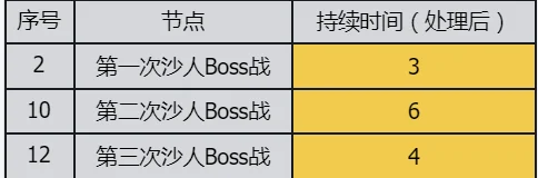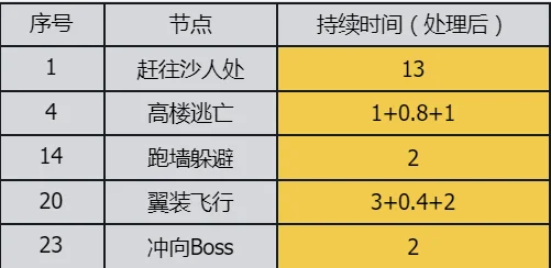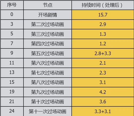 以游玩顺序为轴,不同的游玩区域以及过场动画演出为节点,同时加上各个节点的持续时间(时间结为中间插入的QTE或是过场动画),得到表格如下: