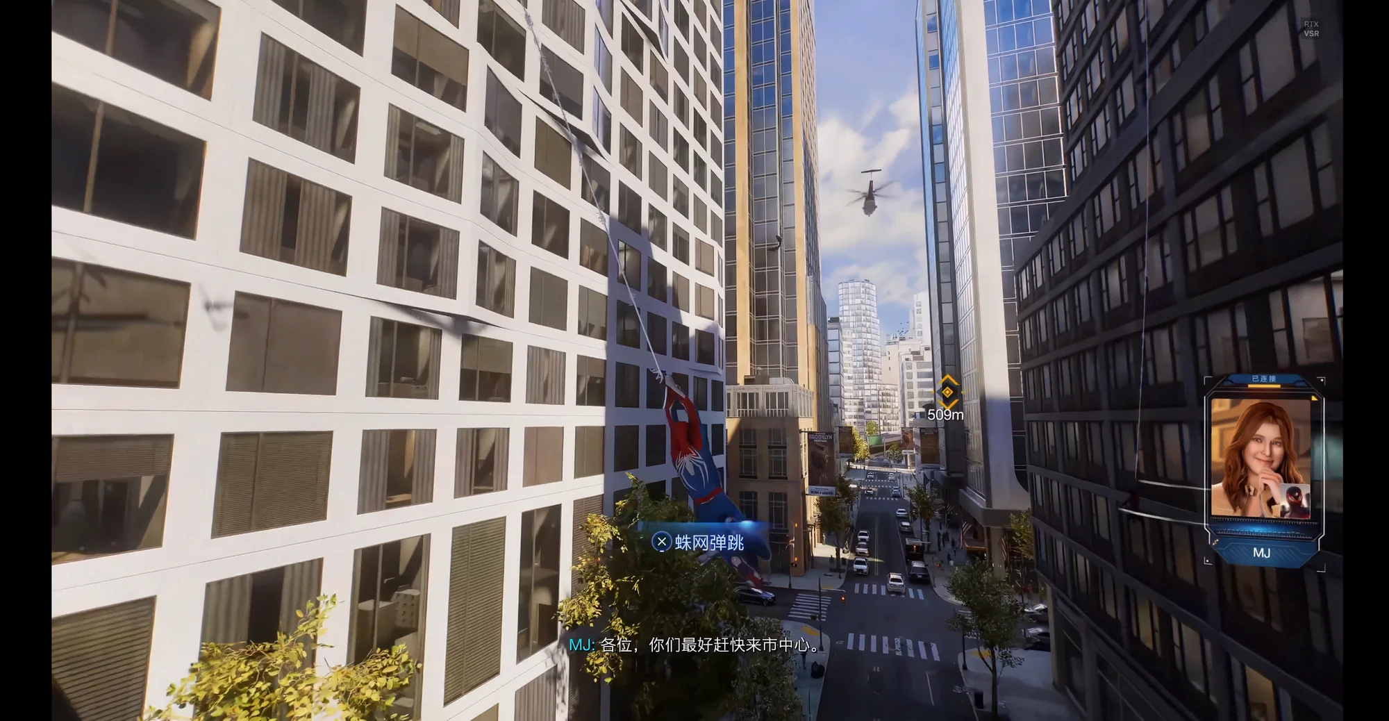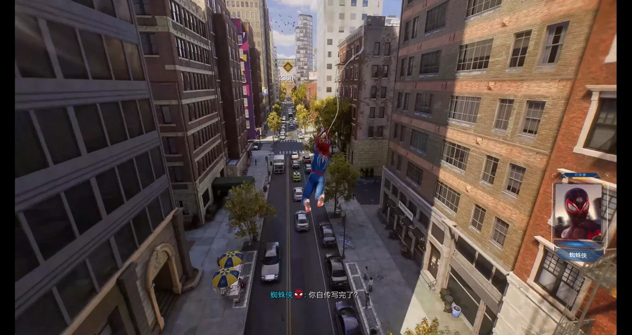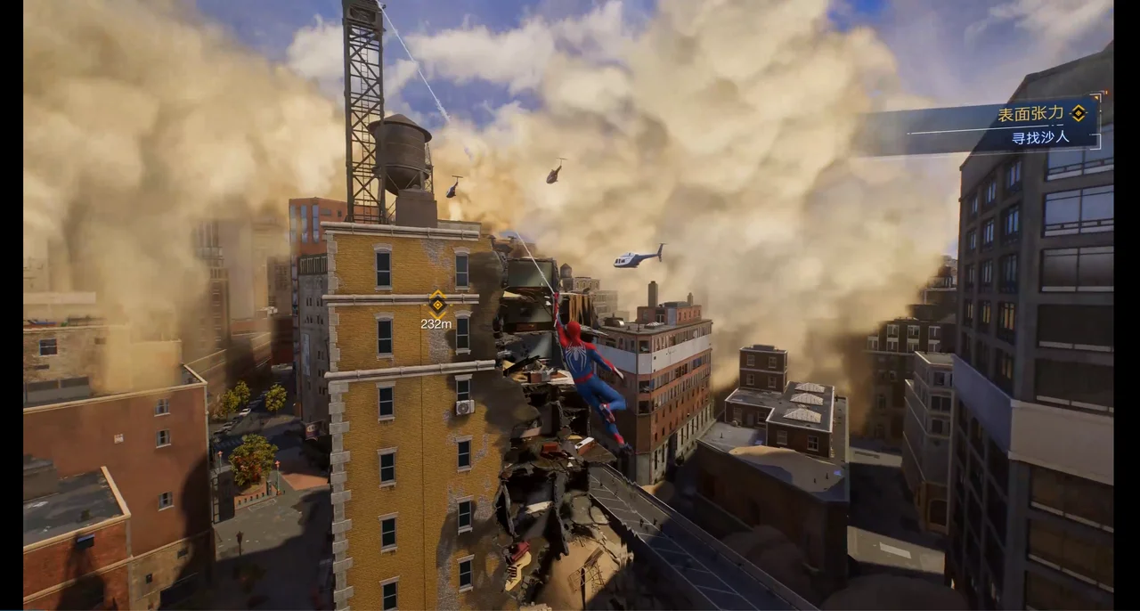 然后是弱引导。《漫威蜘蛛侠2》的城市区域设计上就天然具有强线条感,这不仅对于序章一开始的引导以及后续开放世界的探索、穿梭城市体验的塑造等起到很重要的作用,同时强线条感也能够在动线的分布划定上起到重要作用。然后是序章中的直升机、警车、警用船只等等,它们始终都在引导玩家前进的方向。