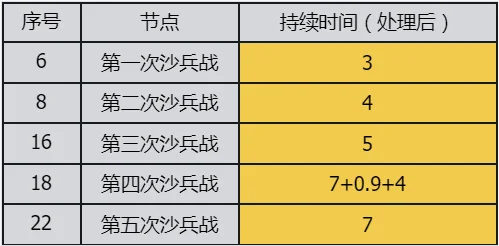 以节奏点分析中的持续时间为原始数据,每个数据进行1:10的等比例缩小,同时非剧情环节的持续时间以四舍五入的方式约去小数点,得到下表: