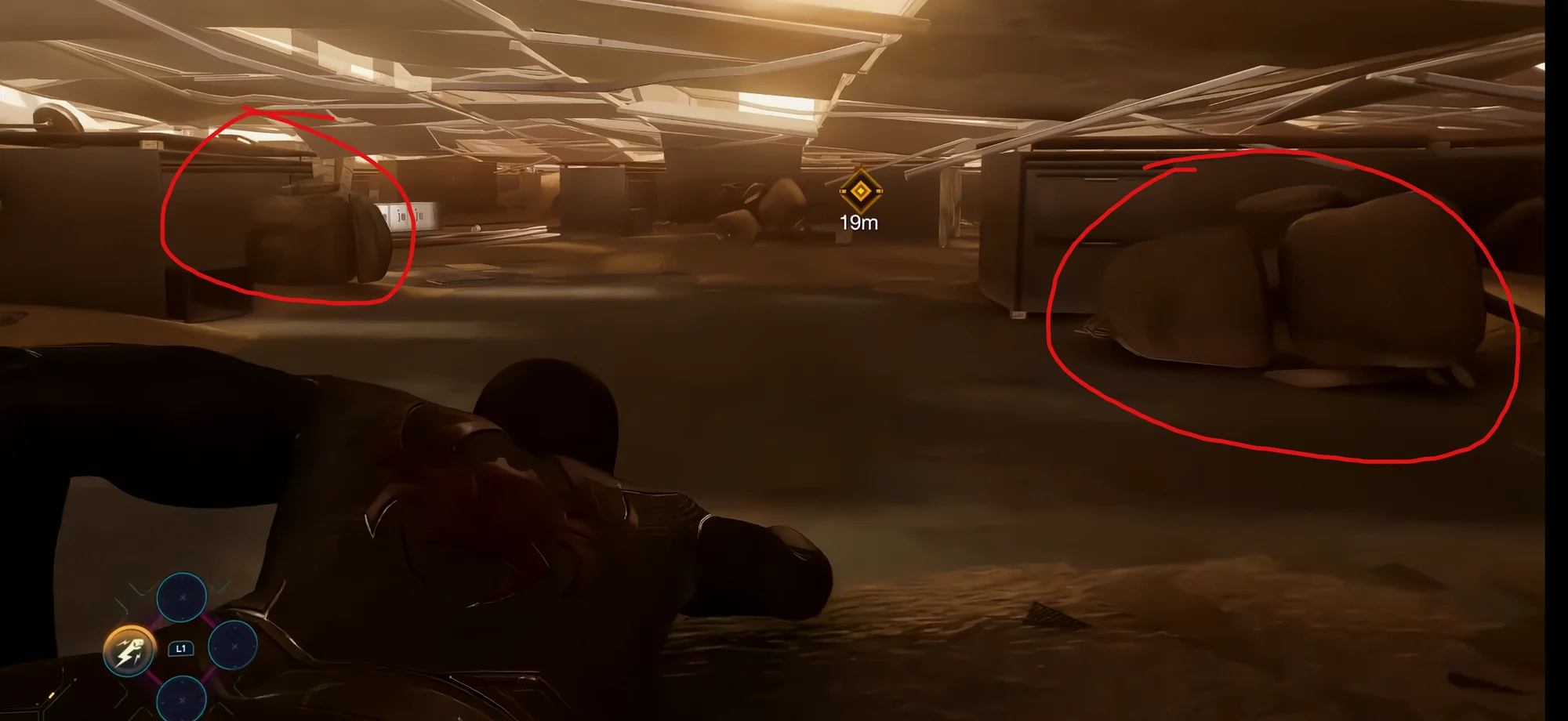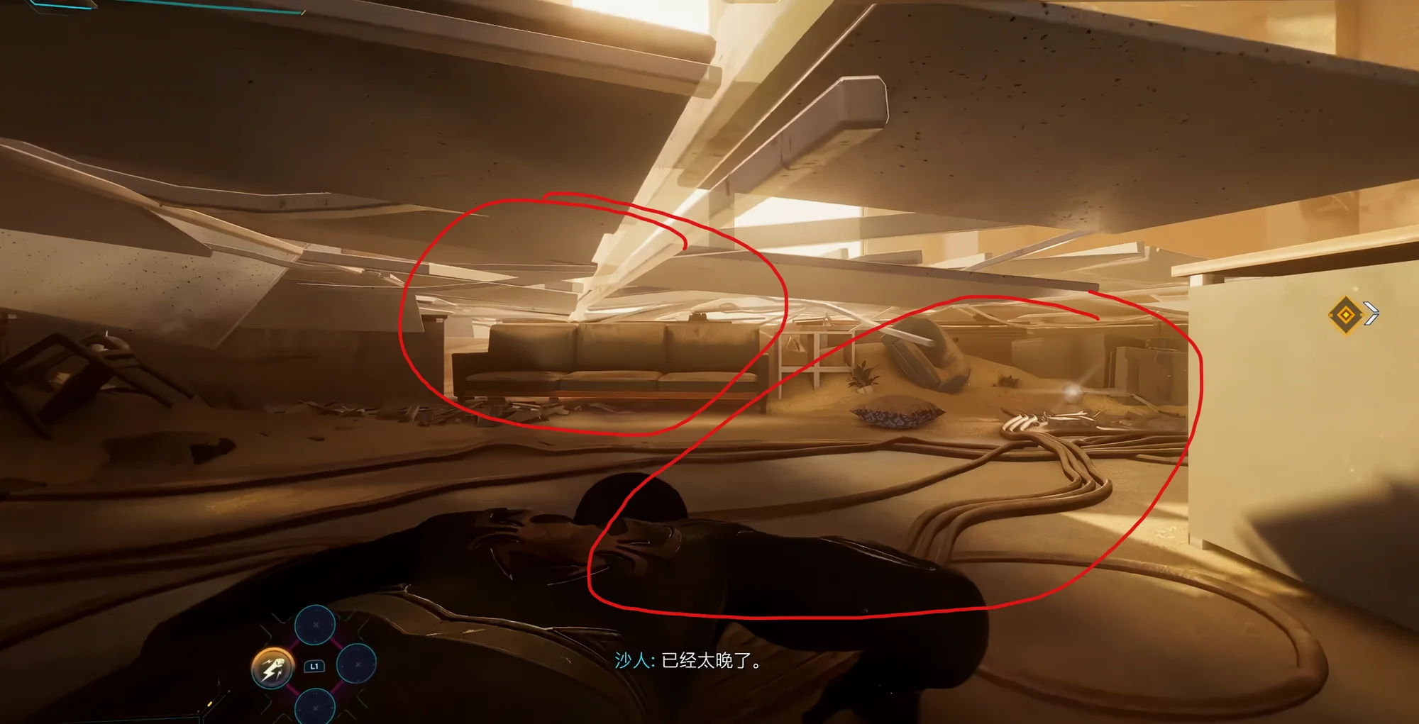 而在倒塌爬行的环节,也不难看出此处用了比较常见的场景引导。具体来说,首先头顶的地板的破损程度是逐渐增加的,突然处于被压迫状态的玩家自然而然地会去想要将被压迫状态转化为自由状态;其次是场景杂物的数量是一个从无到多到少的过程,无与多的数量主要是利用对比来吸引玩家注意力,后续更少的杂物则是暗示场景的结束,新阶段的开始;然后是杂物的朝向趋势是向着主路的,例如椅子、罐子、柜子、自动贩卖机、电缆、沙发等等。