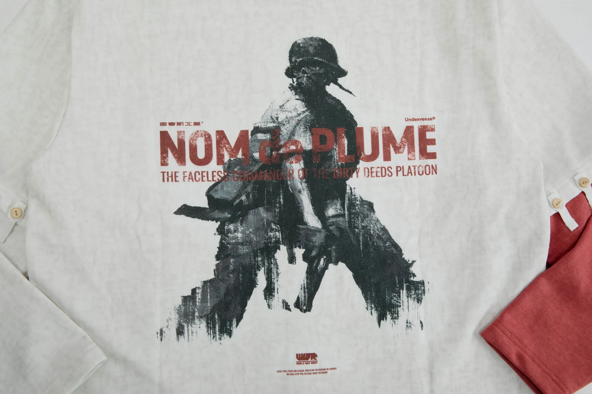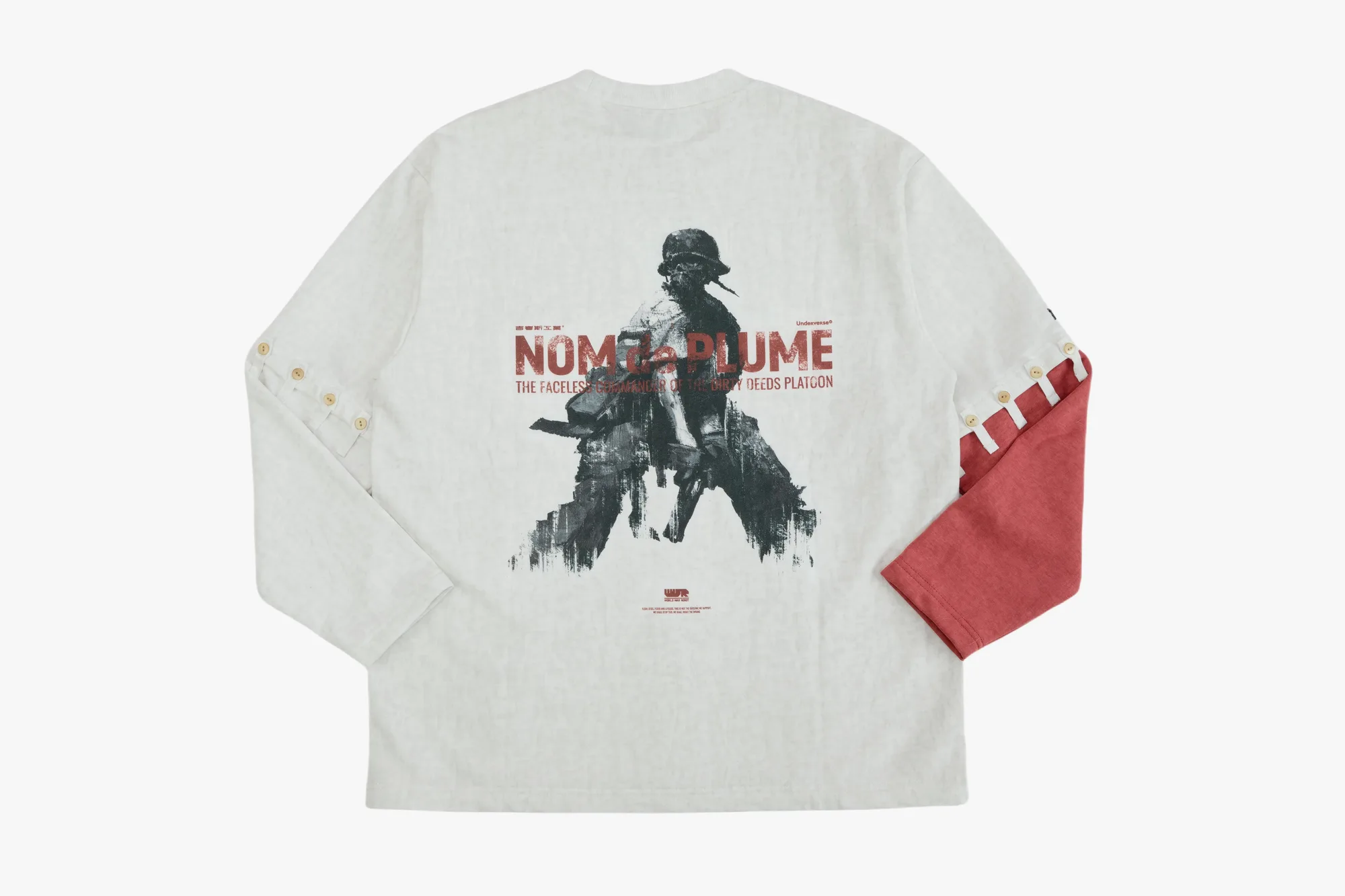 特有的红色单臂撞色拼接袖口,正是延续「NOM DE PLUME」精神烙印的基因。独特的单袖可拆卸设计通过系扣实现左右袖自由切换,并额外附赠右臂替换袖,完美还原「单鼻」角色的战损造型。