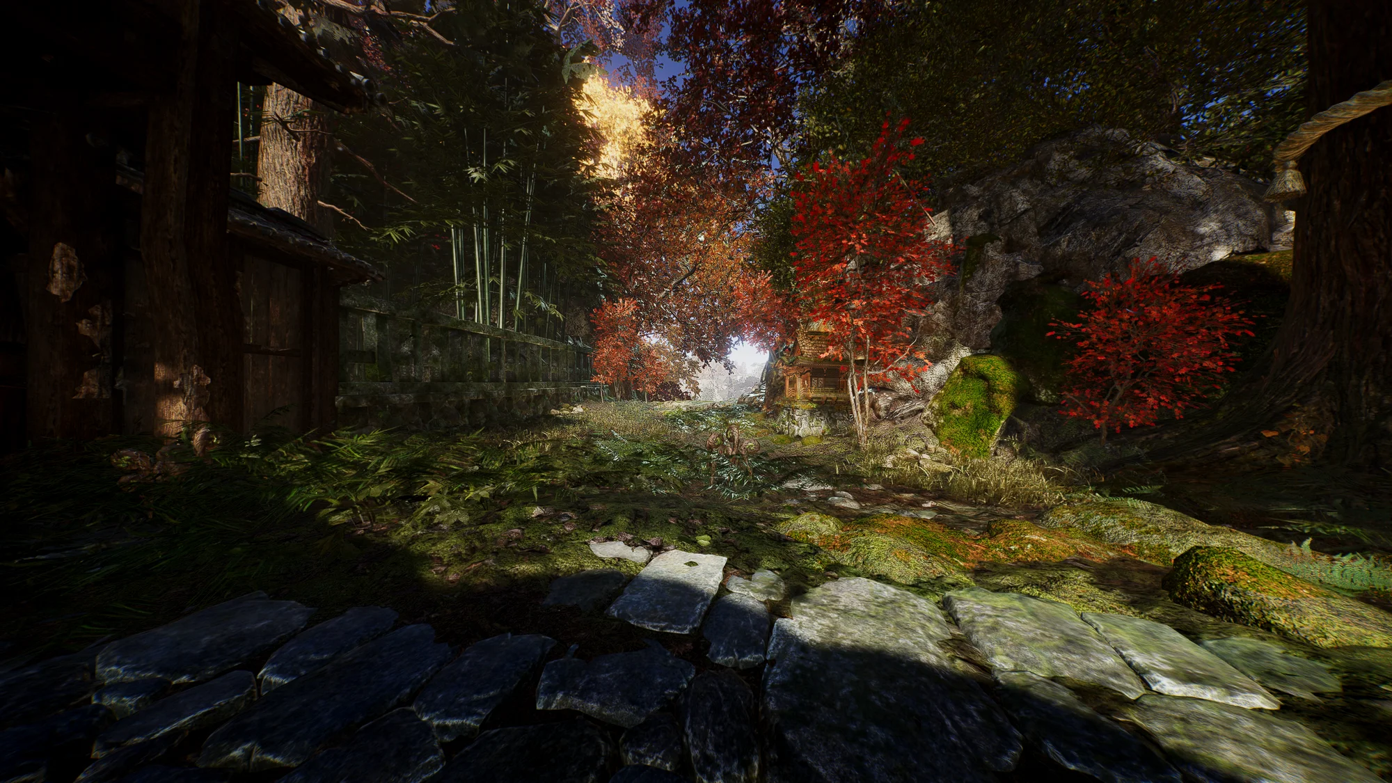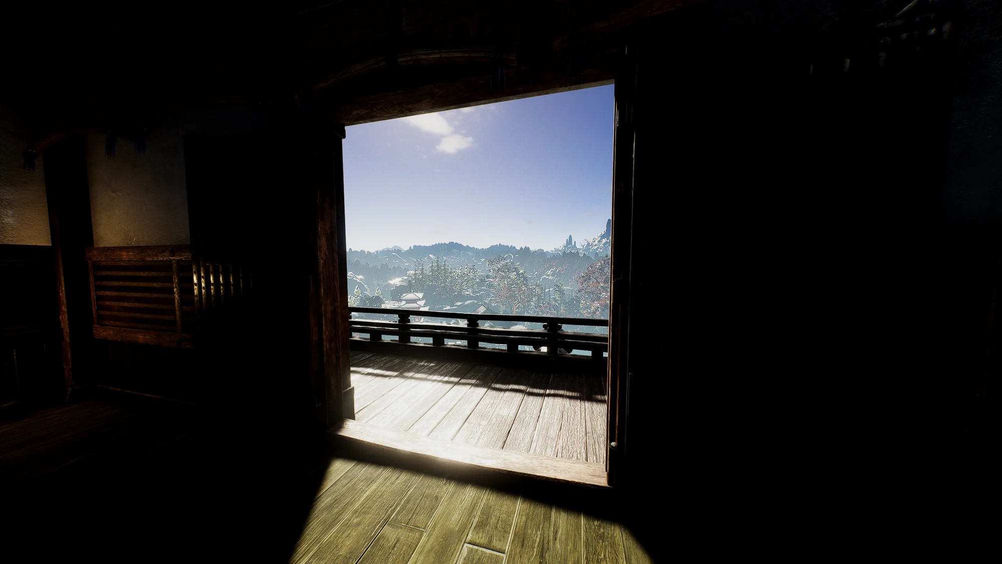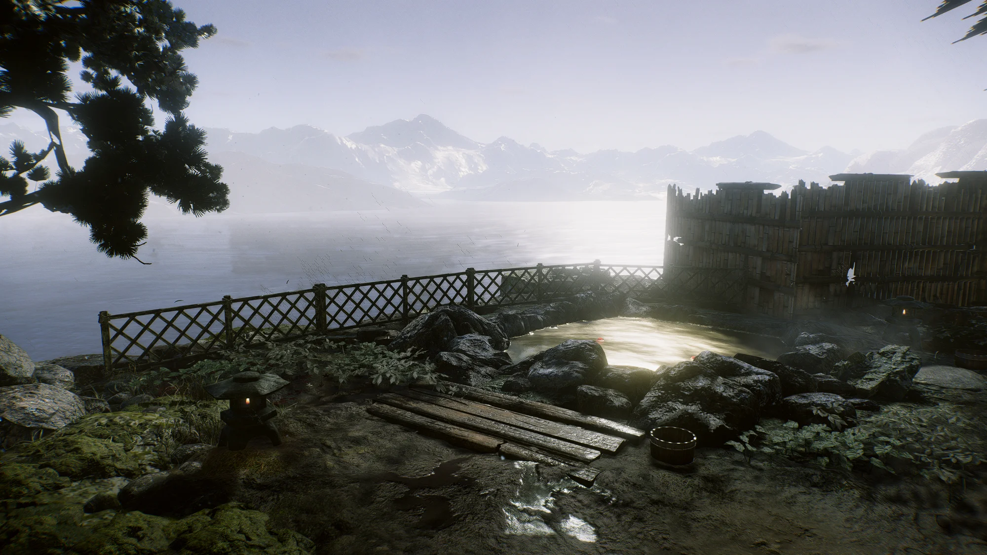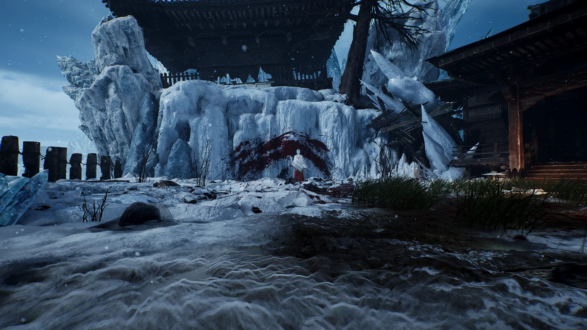 场景美术方面,忍组曾在《浪人崛起》中证明了自己并不只能做“红黑紫”的暗黑风格地图,即便稍显稚嫩,但也能制作像模像样的街景市镇和自然风光。随着开放世界引入《仁王3》,忍组将这些经验运用到了这部作品中,战国作为在游戏早期就登场的第一张大世界地图,忍组对其的设计非常上心,在布景的多样性上下足了功夫:原野、山林、湖景、红叶、鲜花都被包含其中;游戏中期竹千代来到的平安时代的京都,因为地狱的影响则是一袭雪国风光。一望无际的银白初见倒是优美,然而一成不变的景象在长时间探索的后期极易引起玩家的审美疲劳;至于幕末的京都,则回归了《仁王》系列传统的的奇幻黑暗风格,虽说不出意料,但还是让人感觉有一点偷懒的感觉。就我个人而言,内心还是会期待能够在作品中看到忍组如何在《仁王》世界观下描绘出一个拥有更多城镇与聚落,充满人文气息的幕末日本。值得一提的是,《仁王3》的光影表现在纯户外的场景也有了长足的进步。遗憾的是或许因为调校不足的原因,在某些明暗交加的场景,容易出现暗的部分极暗,亮的地方极亮的问题。就总体而言,本作在场景上突破了系列历代的固有印象,在色彩和光影部分为《仁王》系列的场景艺术打开了一条新的道路。