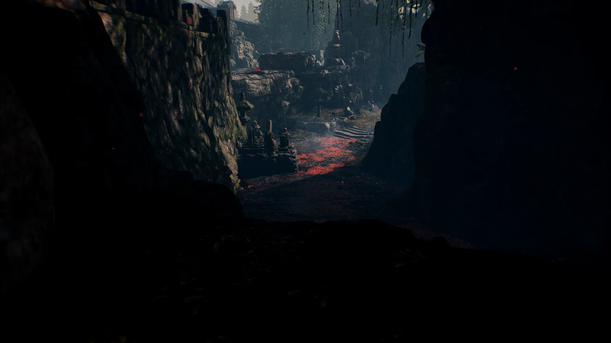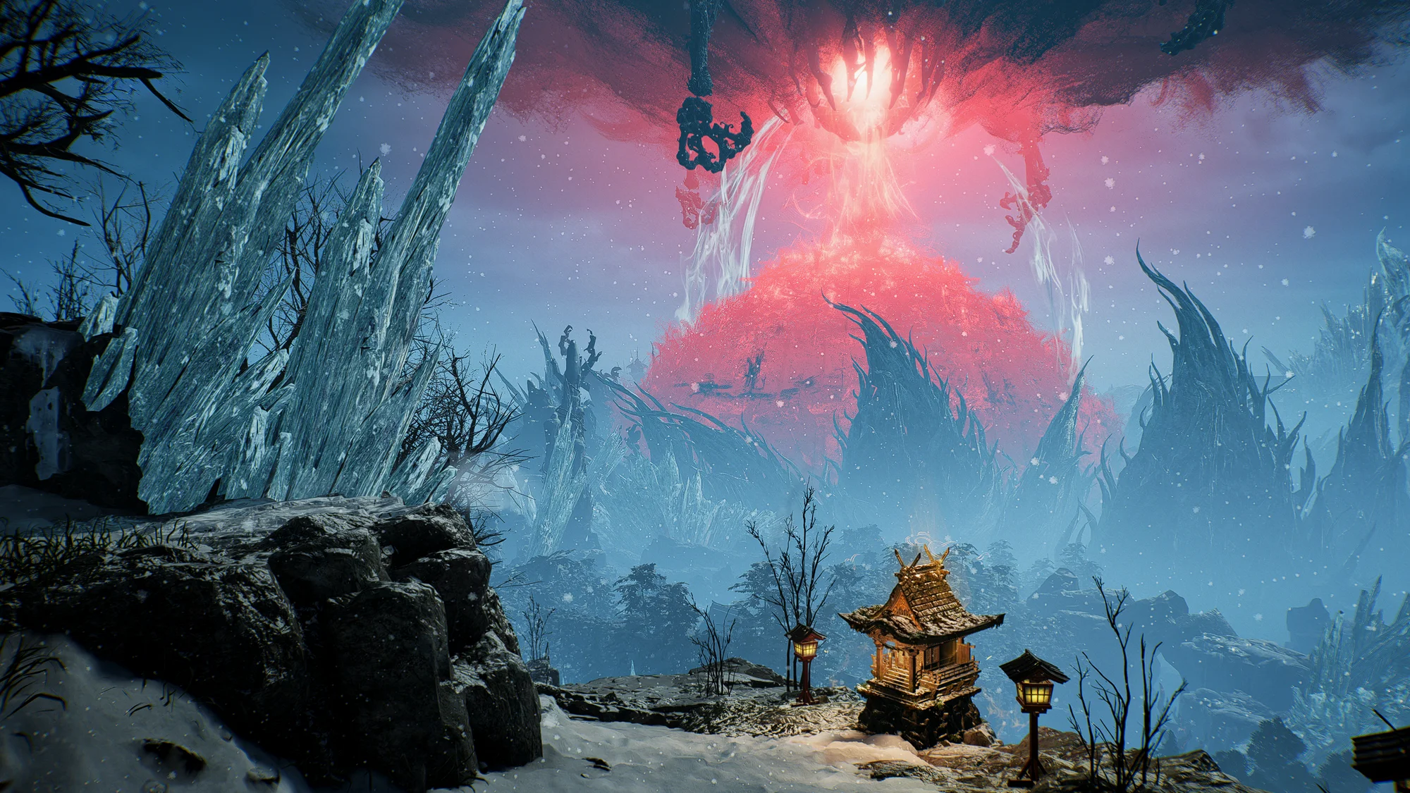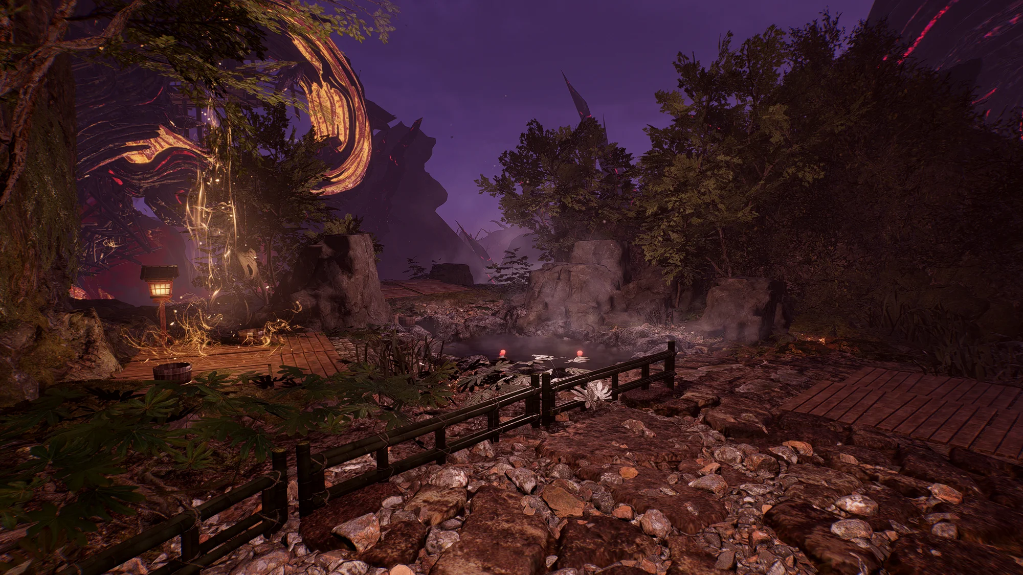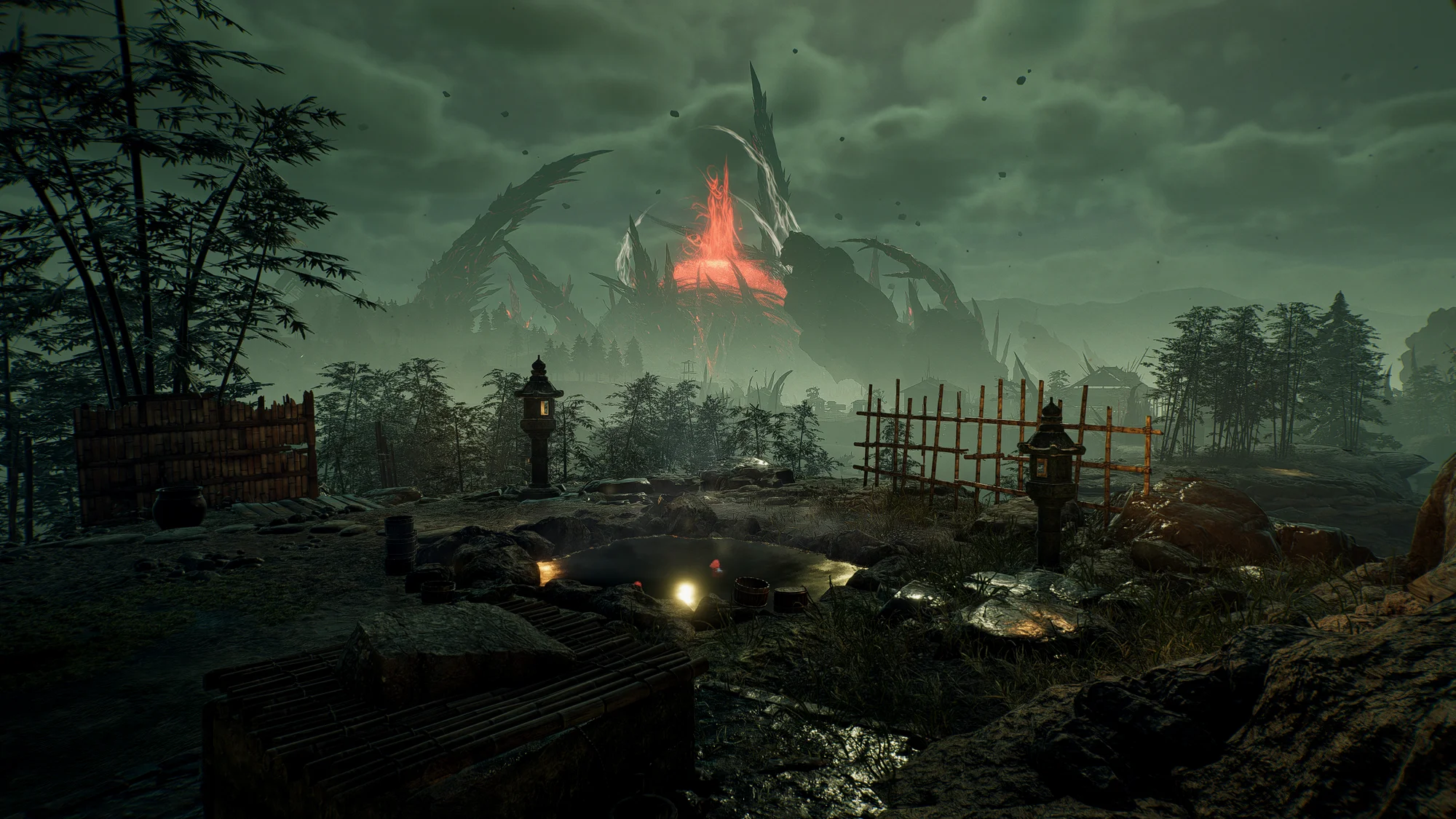 场景美术方面,忍组曾在《浪人崛起》中证明了自己并不只能做“红黑紫”的暗黑风格地图,即便稍显稚嫩,但也能制作像模像样的街景市镇和自然风光。随着开放世界引入《仁王3》,忍组将这些经验运用到了这部作品中,战国作为在游戏早期就登场的第一张大世界地图,忍组对其的设计非常上心,在布景的多样性上下足了功夫:原野、山林、湖景、红叶、鲜花都被包含其中;游戏中期竹千代来到的平安时代的京都,因为地狱的影响则是一袭雪国风光。一望无际的银白初见倒是优美,然而一成不变的景象在长时间探索的后期极易引起玩家的审美疲劳;至于幕末的京都,则回归了《仁王》系列传统的的奇幻黑暗风格,虽说不出意料,但还是让人感觉有一点偷懒的感觉。就我个人而言,内心还是会期待能够在作品中看到忍组如何在《仁王》世界观下描绘出一个拥有更多城镇与聚落,充满人文气息的幕末日本。值得一提的是,《仁王3》的光影表现在纯户外的场景也有了长足的进步。遗憾的是或许因为调校不足的原因,在某些明暗交加的场景,容易出现暗的部分极暗,亮的地方极亮的问题。就总体而言,本作在场景上突破了系列历代的固有印象,在色彩和光影部分为《仁王》系列的场景艺术打开了一条新的道路。