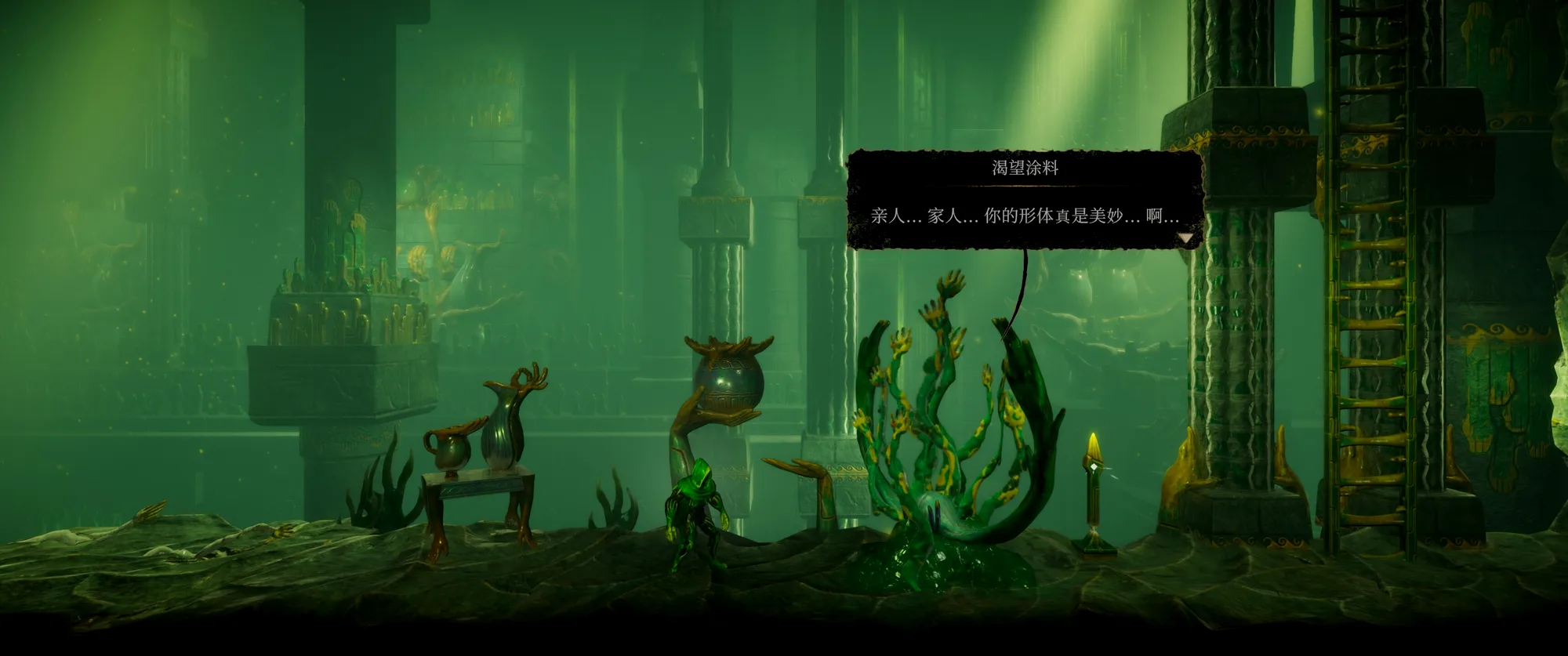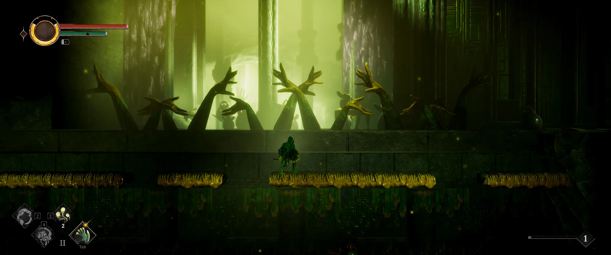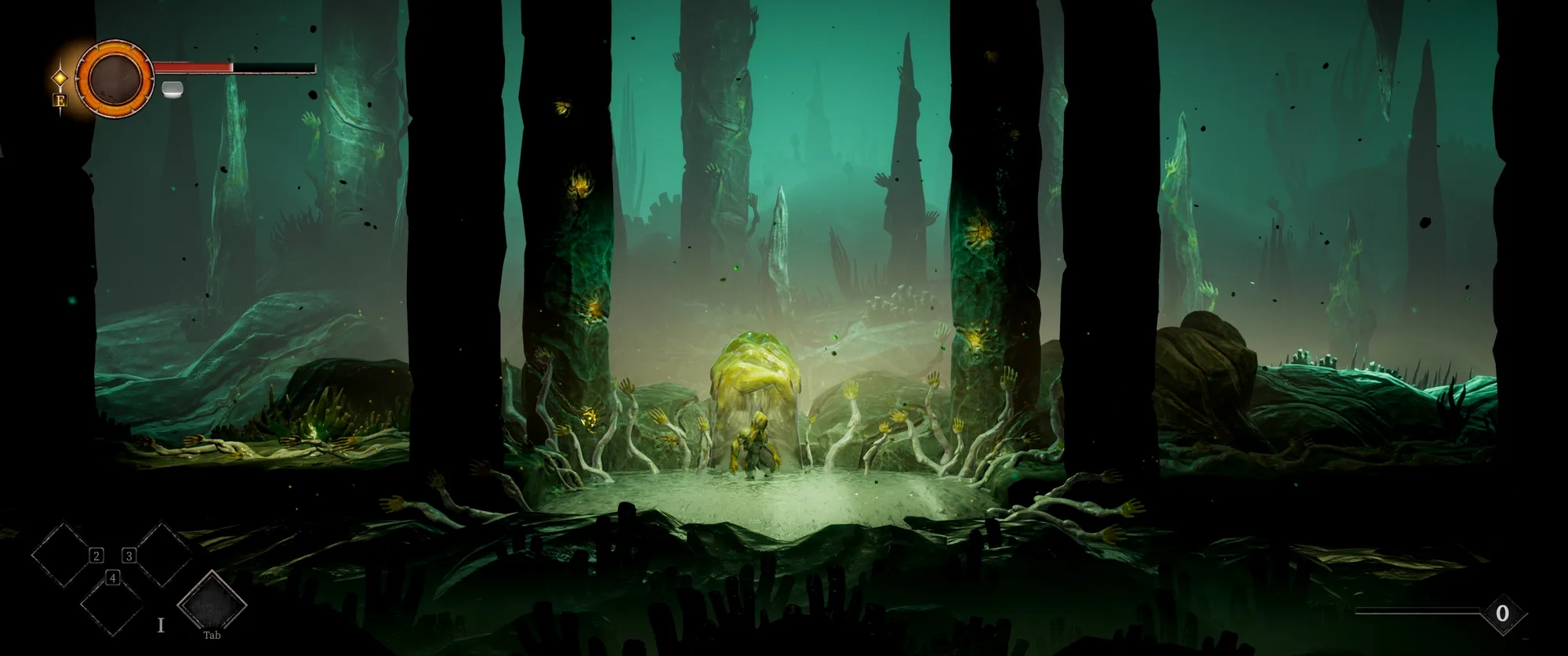 首先最亮眼的就是独一份的奇诡美术,从主角本身,到敌人形象,以及整个场景,都充斥着各种手指和手掌的意象,让人不禁怀疑制作人是某种恋手癖。好在手还算是日常比较常见而且确实有美感的元素,这要是把手全换成脚,那出现在如今的网络环境里我都不敢想……