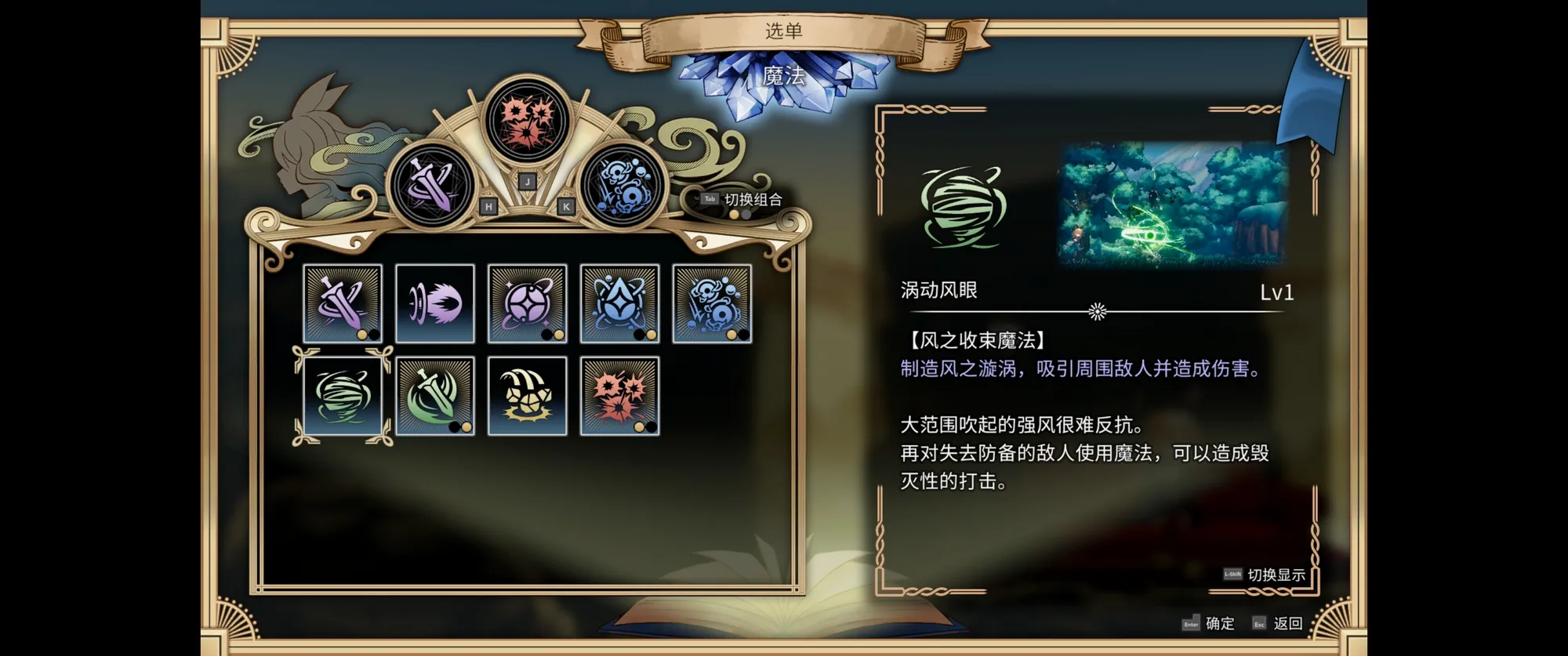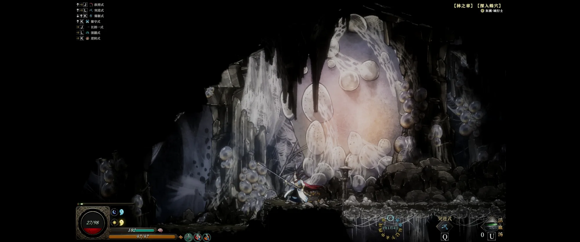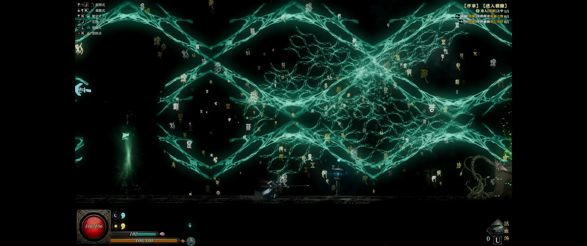 玩法就更一眼难尽了,前面那些游戏都可以说是吸取了某一个特点再加上银河城的基底,而这个款柔和了太多东西甚至一时半会难以梳理,光是教程就好多页物理就有各种状态,法术状态就更多,然后又有装备又有炼器还有源素,有武技有术法,面对敌人能格挡能闪避,boss还有的招不能挡有的招不能闪!大方向上既有类魂,又有刷宝,再加上修仙的题材,凸显一个什么都想要,但确实各方面都还没打磨好,满眼都很糙。