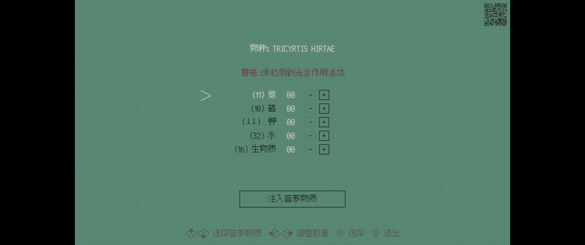 探索过程中能收集到氮磷钾和水资源,击败敌人能收集到生物质。当遇到研究所特定的培育设施时,能按照特定的组合来完成培育。而这种谜题每次的花样都不一样,有的是很简单的“管理员模式提示”,有的是扫描二维码查看线索,最离谱的是有一次是真人视频,拿着瓶子分别给桶里倒和拿勺舀不同元素的配比。