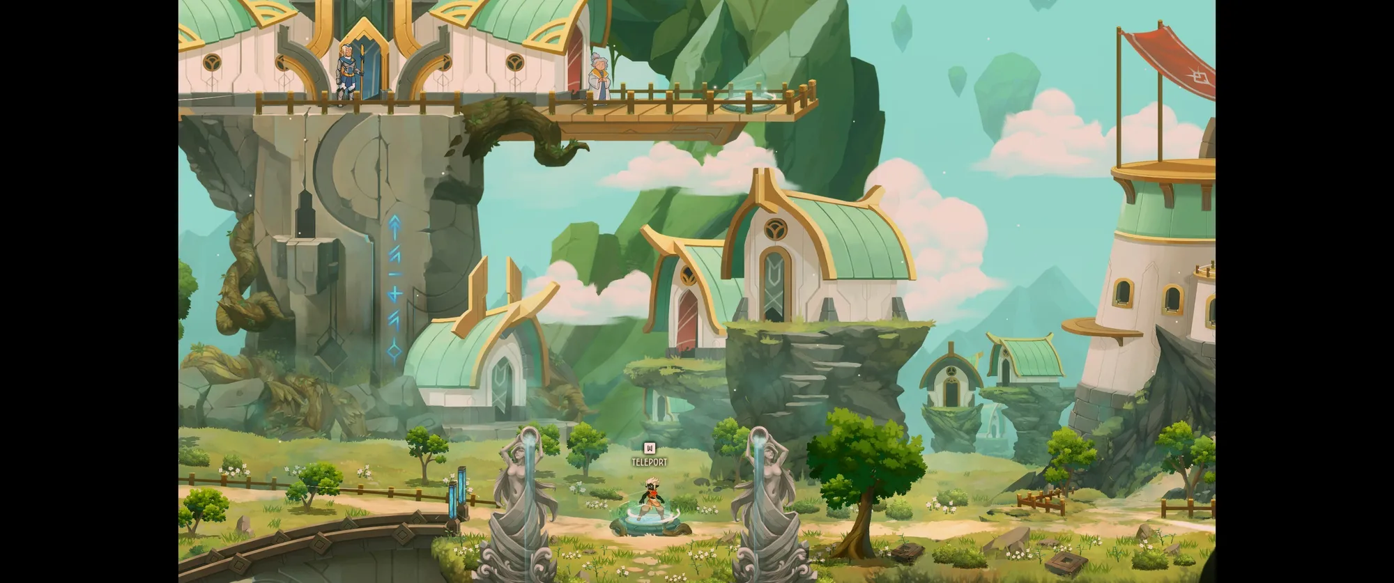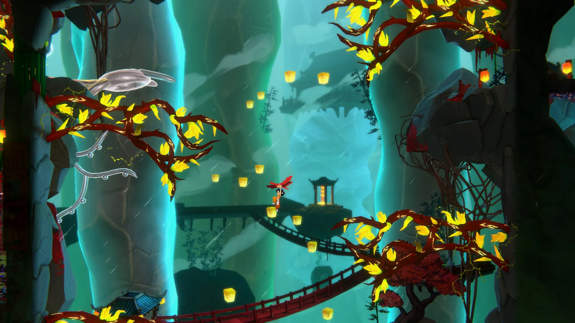 地形方面主打的是高速流畅的跑酷体验,地图上分布一些常规资源和需要冲刺才能激活的资源,还有大量高低差平台和障碍,经常需要一路保持冲刺连续跳跃再空中攻击特定障碍后刷新跳跃次数再向更高处连锁移动。其中也会有一些解谜但都不难,半路的杂兵战斗毫无威胁,大多只是跑酷途中移动的垫脚工具。
