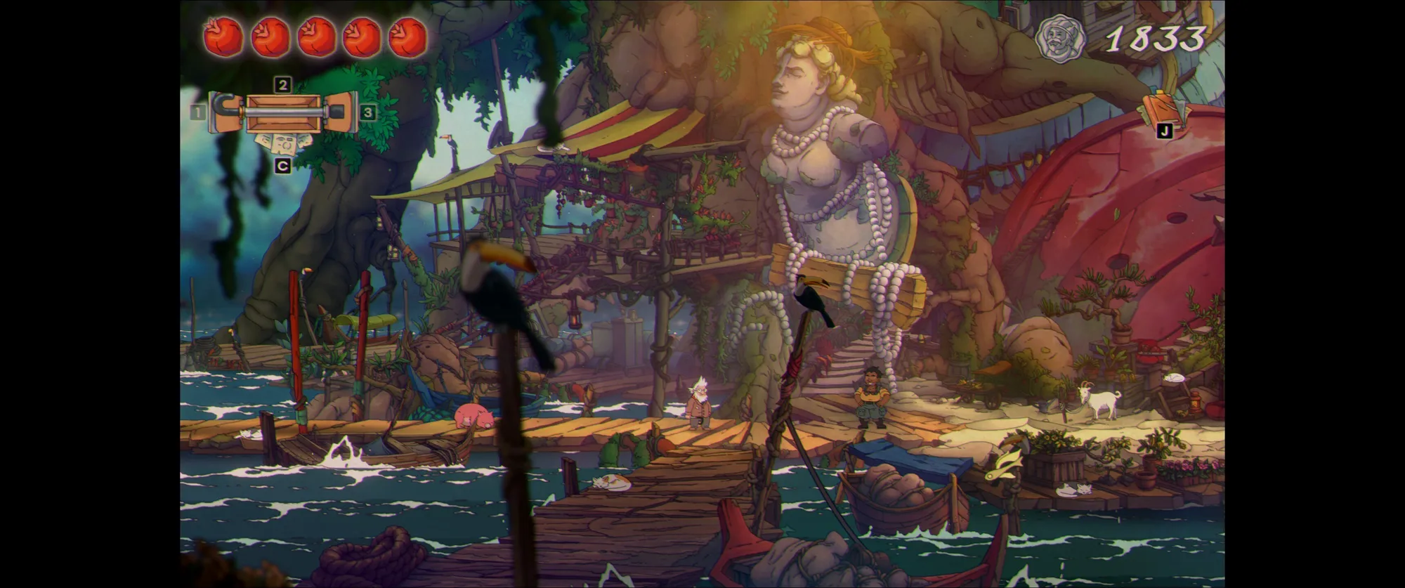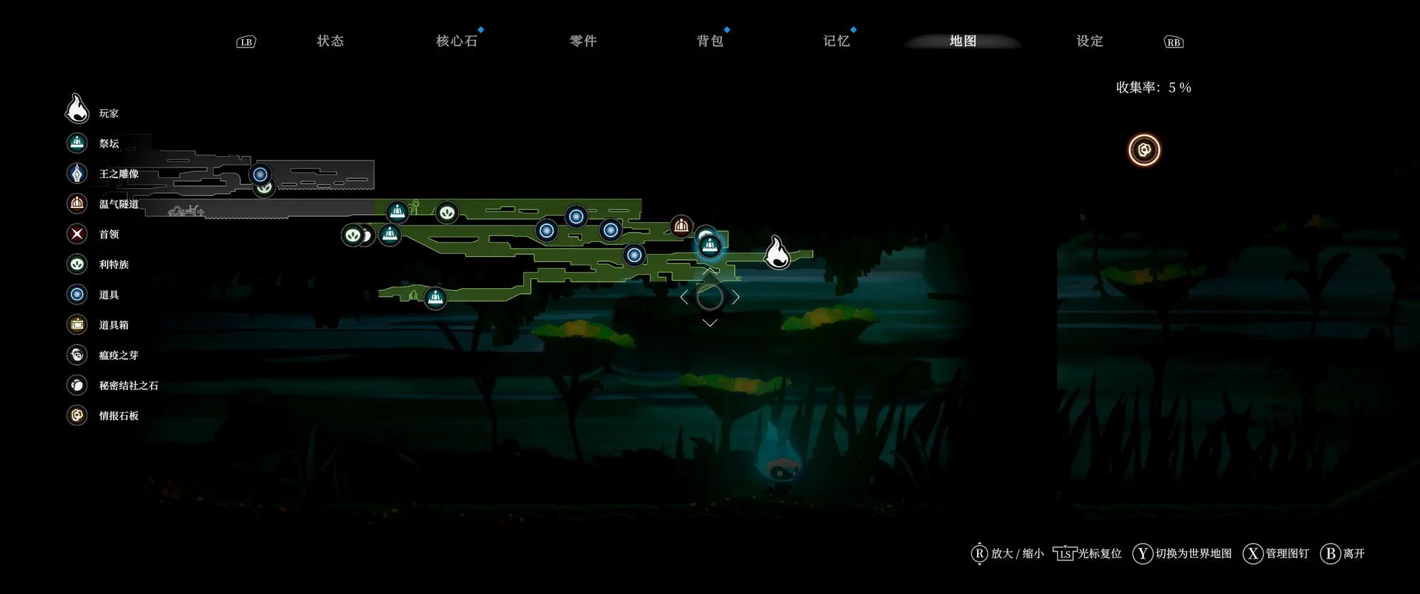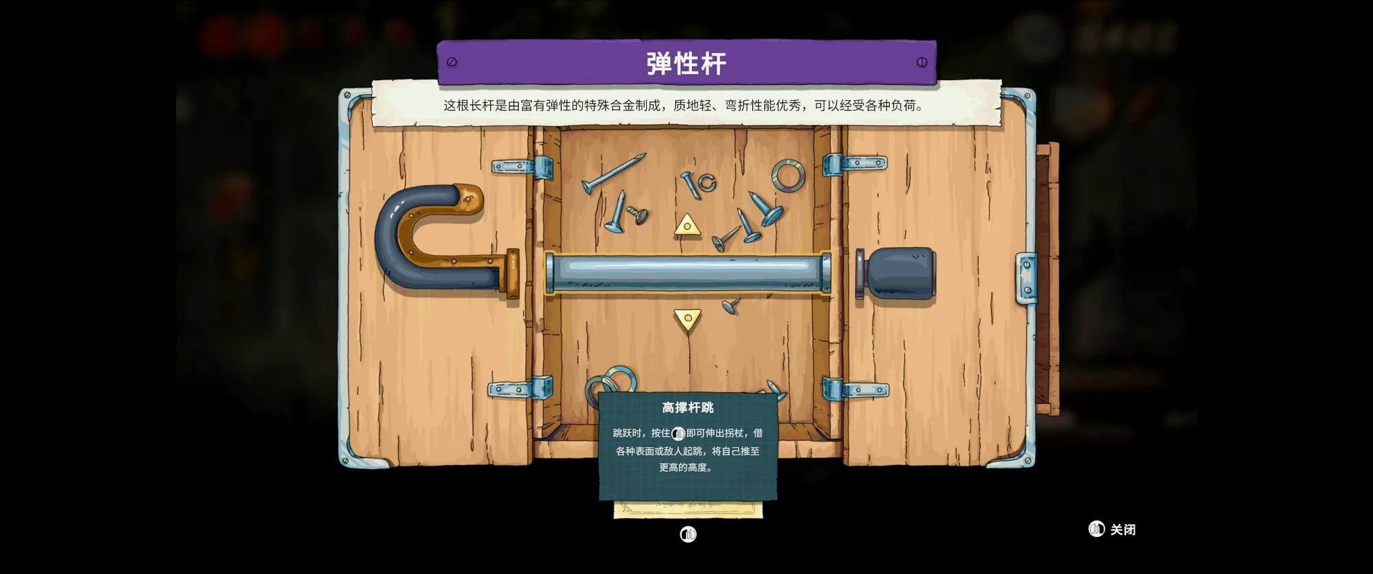 玩法方面主角只有一根拐杖,而且不能挥舞来攻击,只能拄着来弹跳,后续能拿到各种拐杖的配件来模块化定制,例如钩形的拐头能用来挂在环形机关上,也能用来拉扯;拐身有常规版也有更好弹力的高跳版,但也不是单纯的上位替代,部分顶部有刺的低矮地形反倒需要较低的弹跳。但除此之外就没什么成长维度了,一路就是跑跑跳跳,解机关,击败敌人,收集宝物。路线其实非常单一,没有什么频繁的倒插门和复杂的多分支探索,因此各方面都算不上是类银。
