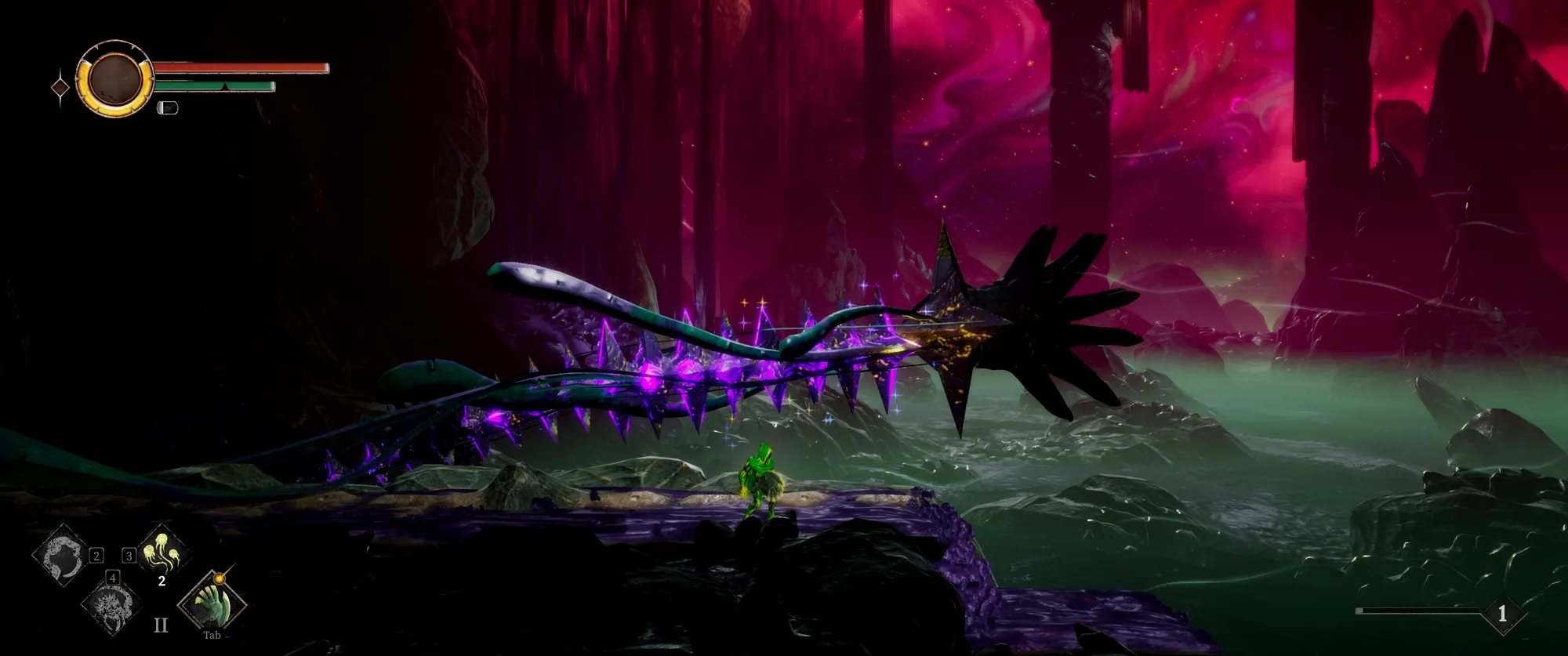 虽然也有魂系常见的精力限制,但grime2中做的温和很多,就是会有一个精力槽然后在大概2/3的位置有个标记,攻击和闪避都会消耗精力,但是精力跌落到2/3以下甚至空了之后都不会影响继续攻击和闪避,只是会让伤害数值有折损,这在敌人攻击的危急关头保命可轻松多了,不会出现耗尽精力眼瞅着攻击到脸上了没法躲的尴尬场面。