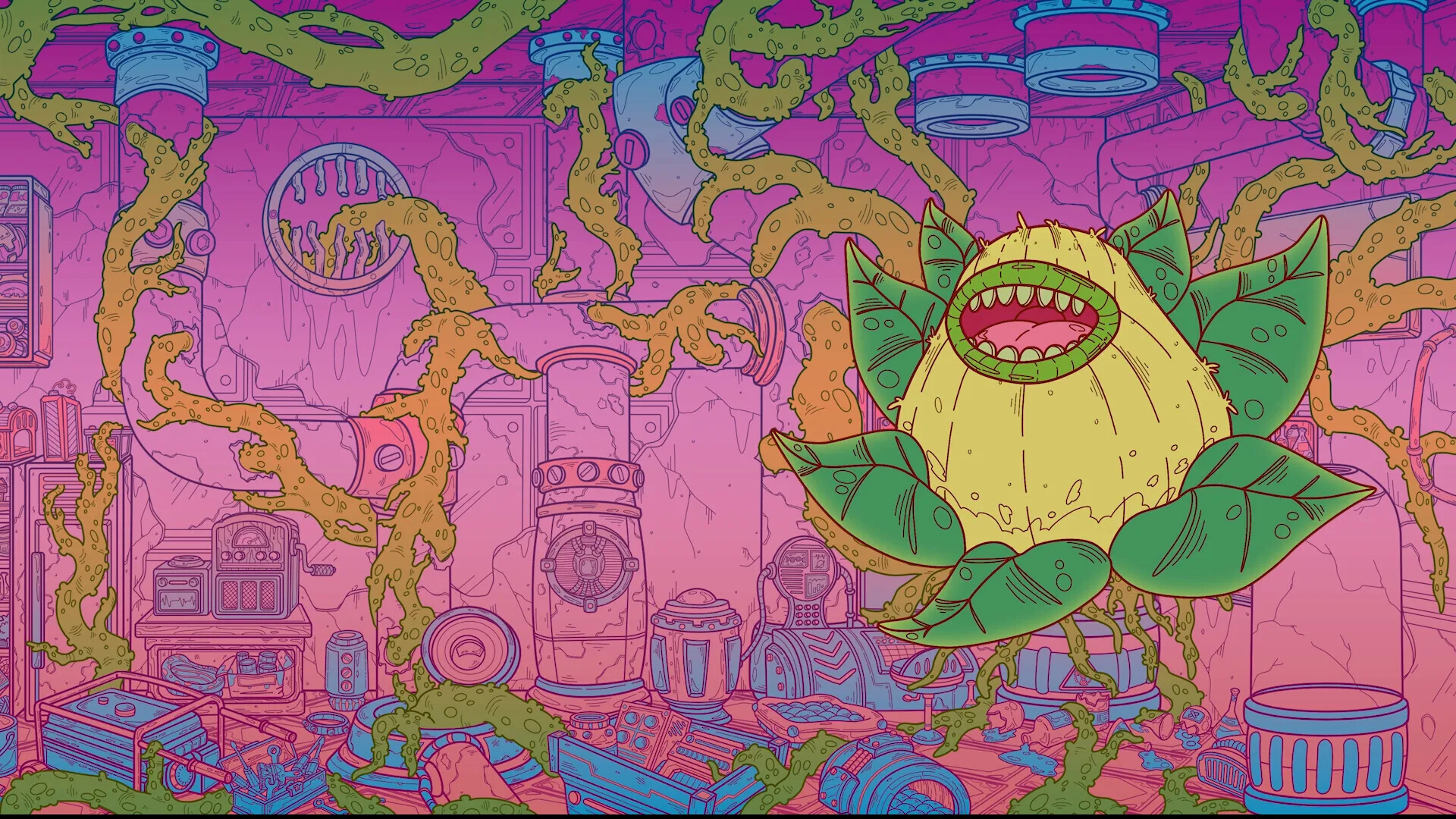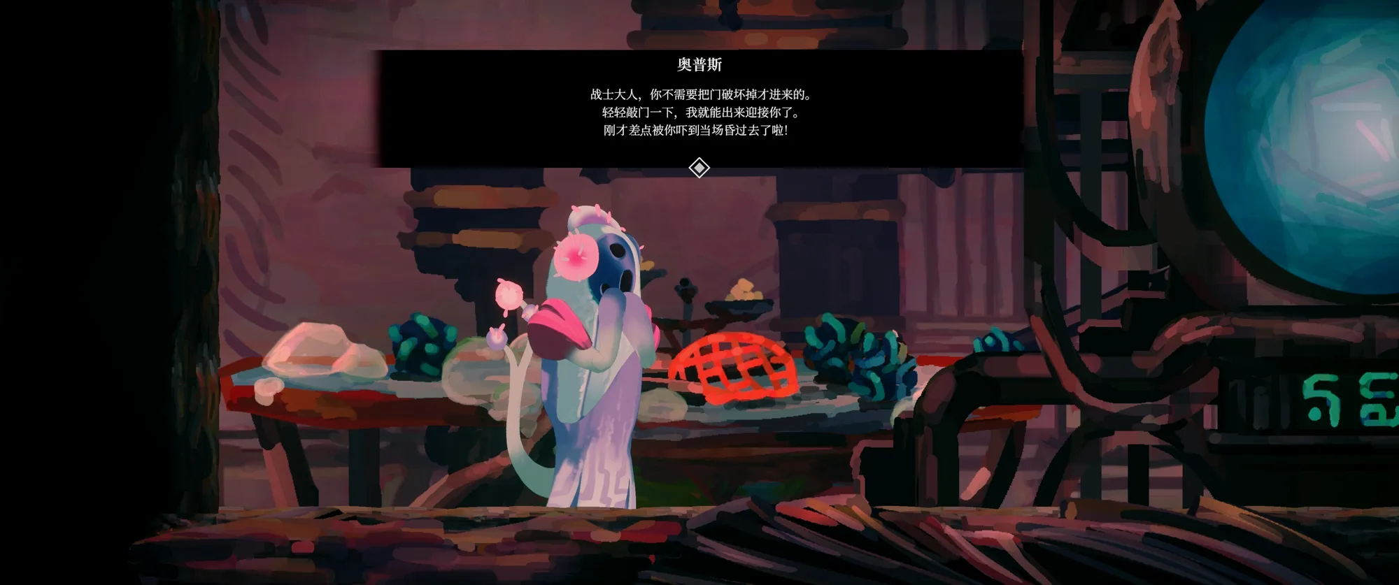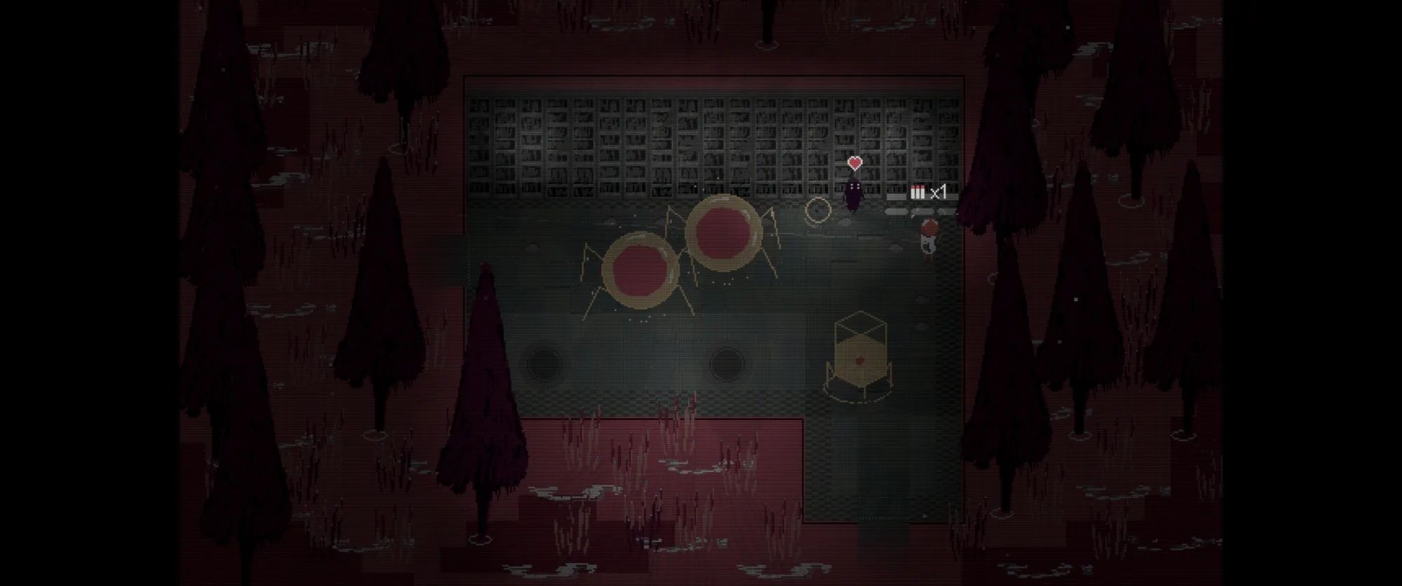 画面简单得就像《雨世界》的朴素像素游戏。似乎在某个人类消亡的末世,主角作为一个培养仓怪物醒过来,途中唤醒了一台能协助射击和收集元素物资的机器人,就这样一个怪物和一个机器随从探索这座城市。