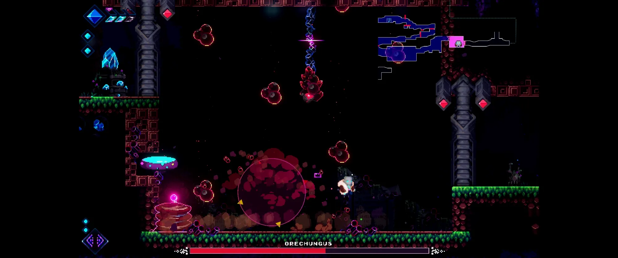 关卡设计不算特别出彩但是能达到及格线以上,分支较多并且有一些隐藏区域,路线终点也不会都塞没用的破资源,另外还有特色的前后多层地图(但目前还没看到基于多层的绝妙设计,说起来之前《曼陀罗》也做过这种多层地图,可惜也没深挖这个设计的可能性),总体来说探索体验还可以。