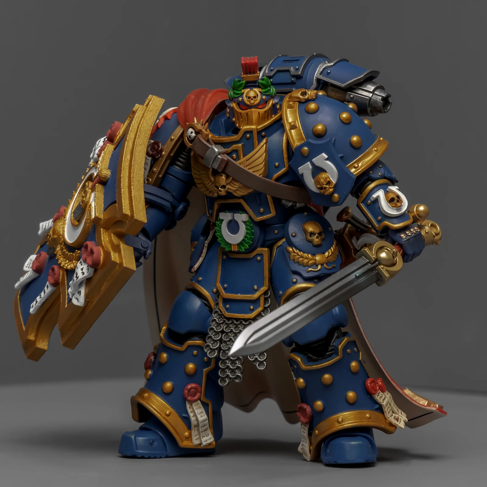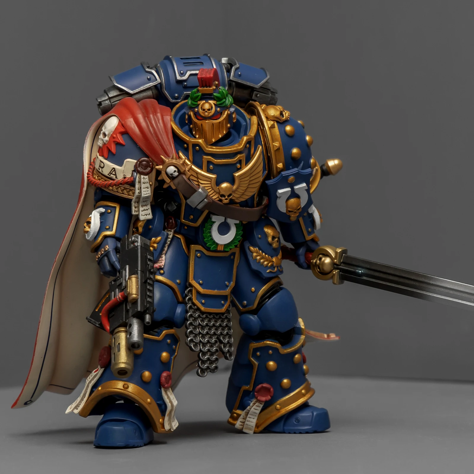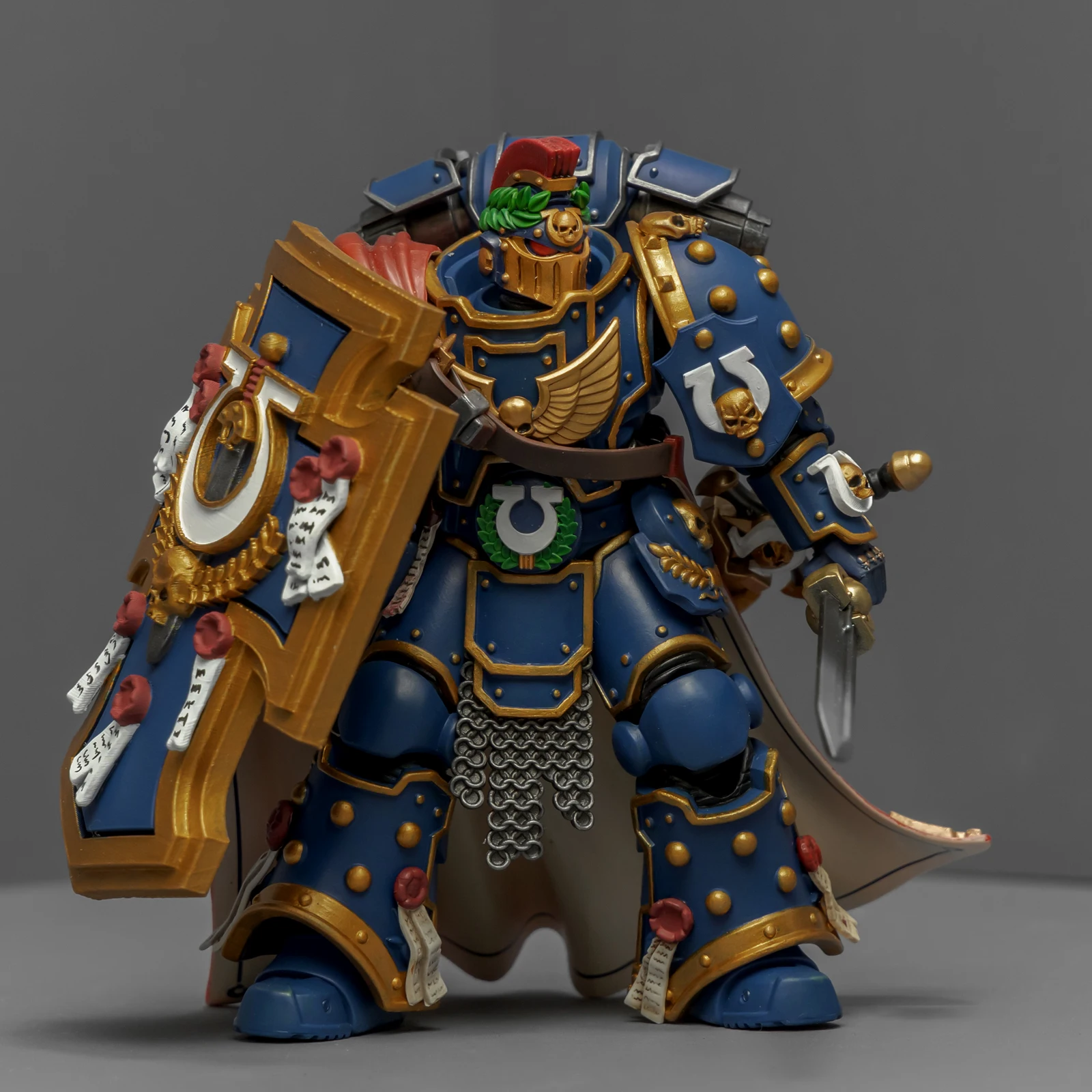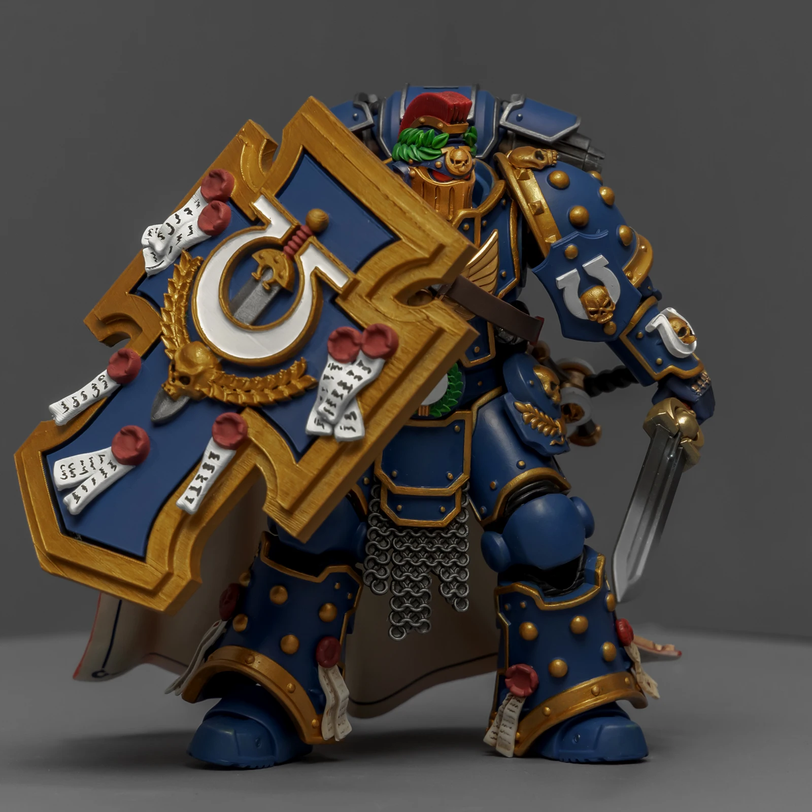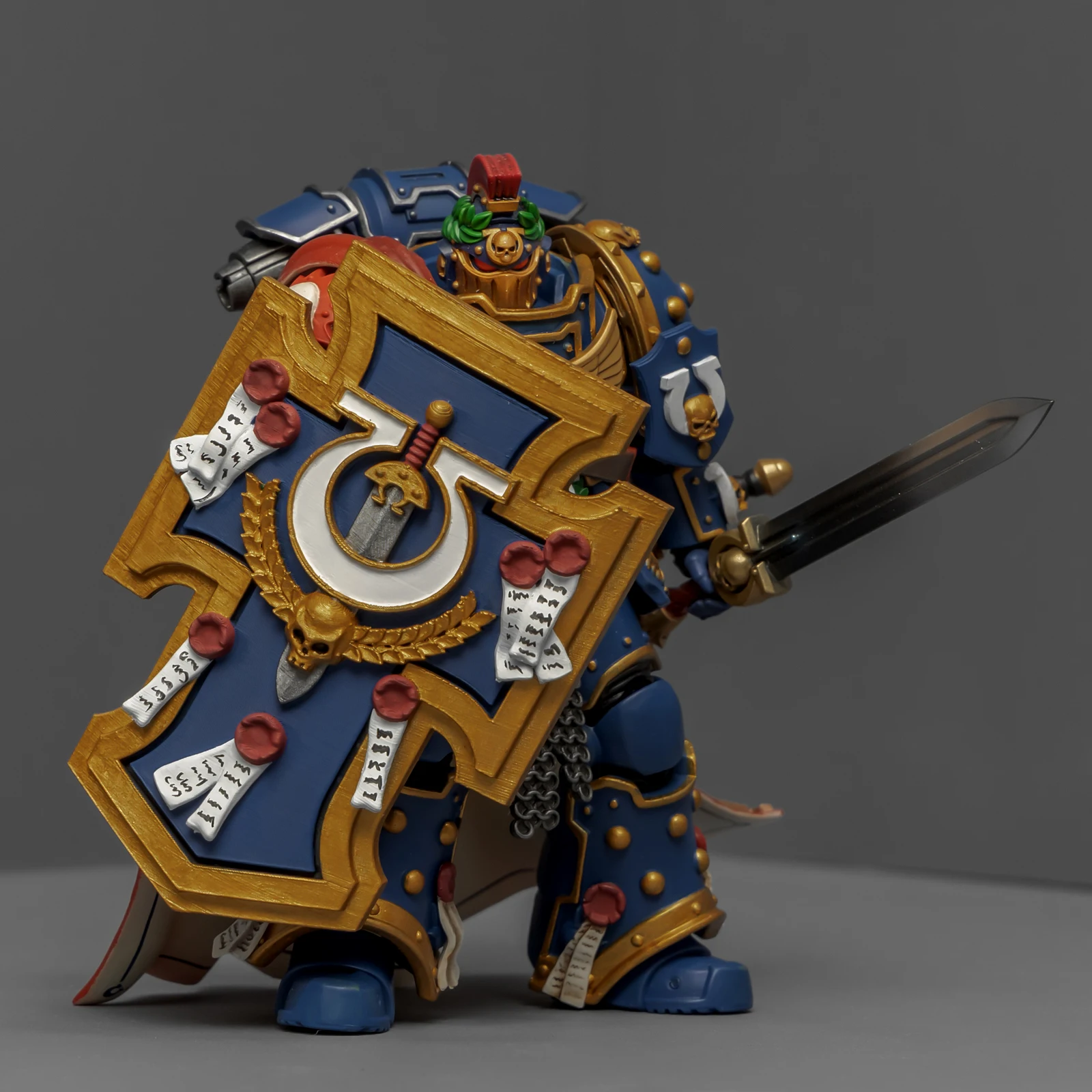 最后登场的是连队勇士,又是用暗源出的荷鲁斯之子军团冠军改的,荷鲁斯之子真是改造佳品。原版人偶身上还是带着不少鲜明的荷子元素,为了让它U团化以后不太违和,我又是削又是磨,折腾了半天。最后再加上双头鹰、骷髅标记和各种纯洁印记,才总算把那些痕迹给遮严实了。连带着佩剑也重新处理了一下,顺手又多配了一把极限战士剑卫的佩剑,主打一个武德充沛。头盔又用了以前涂的一只,原本是打算给那支二创的“庇护小队”用的,但怎么看这造型都更像是冠军专属,就直接挪过来了。