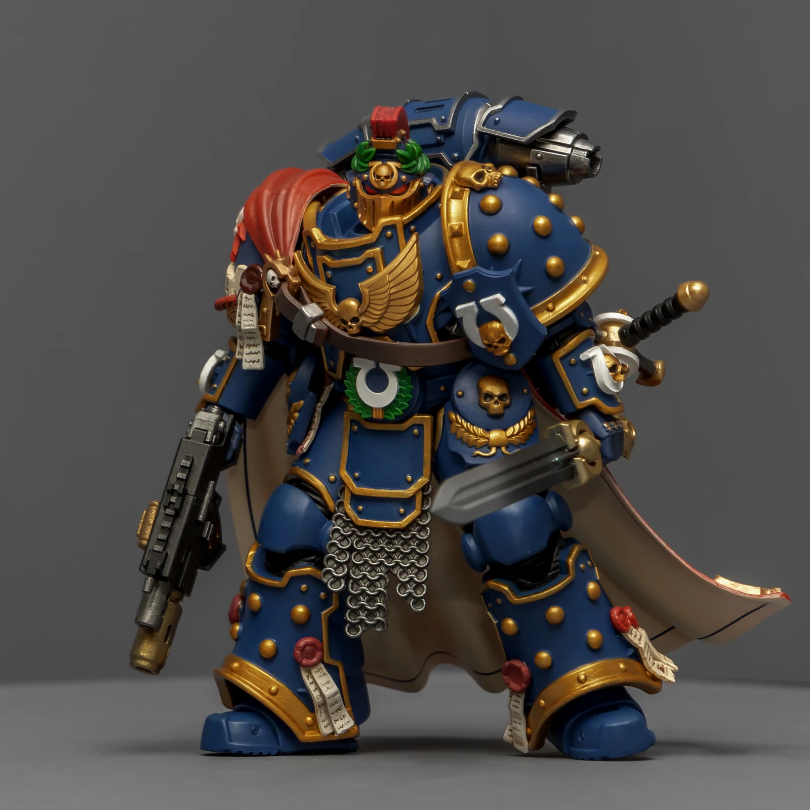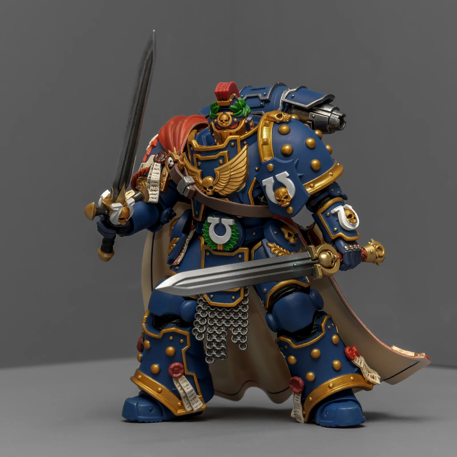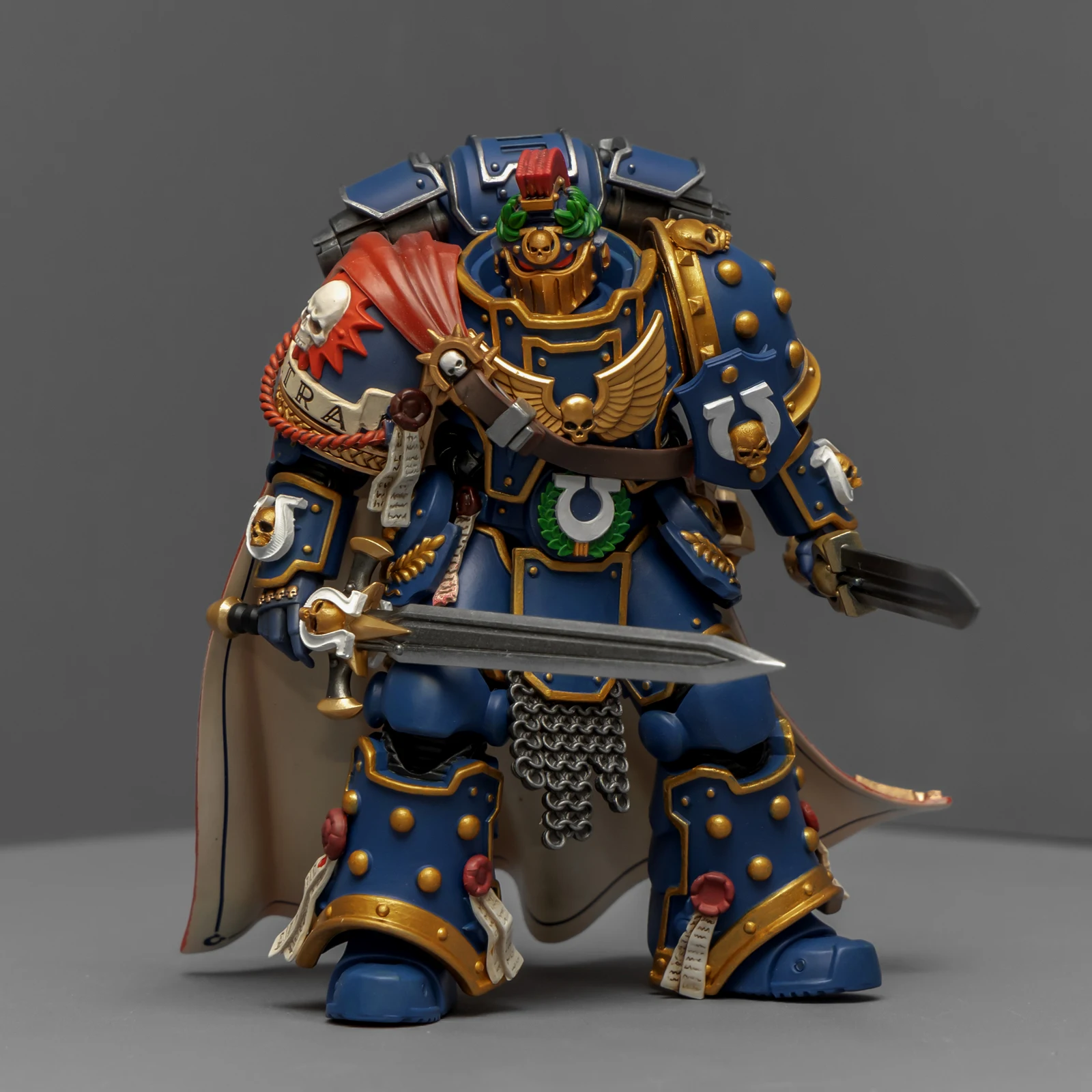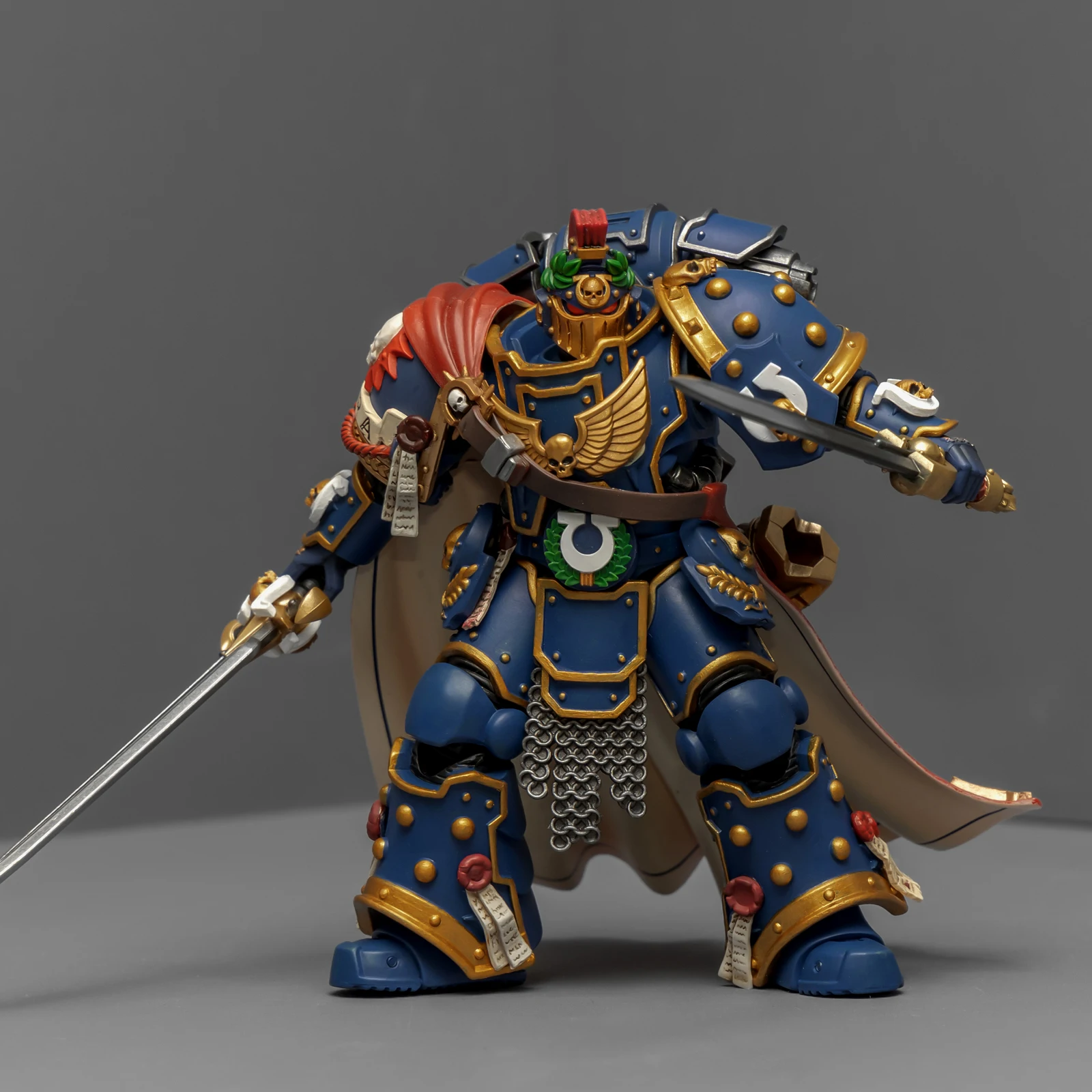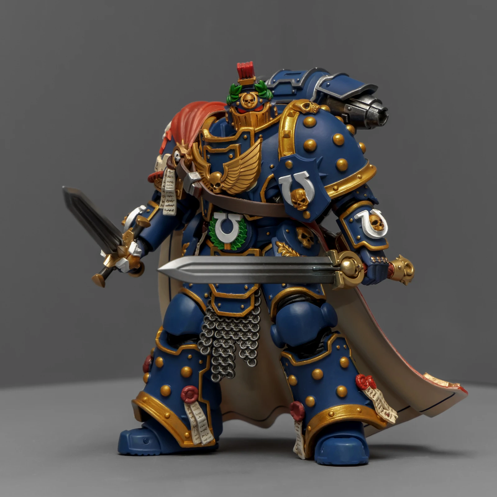 最后登场的是连队勇士,又是用暗源出的荷鲁斯之子军团冠军改的,荷鲁斯之子真是改造佳品。原版人偶身上还是带着不少鲜明的荷子元素,为了让它U团化以后不太违和,我又是削又是磨,折腾了半天。最后再加上双头鹰、骷髅标记和各种纯洁印记,才总算把那些痕迹给遮严实了。连带着佩剑也重新处理了一下,顺手又多配了一把极限战士剑卫的佩剑,主打一个武德充沛。头盔又用了以前涂的一只,原本是打算给那支二创的“庇护小队”用的,但怎么看这造型都更像是冠军专属,就直接挪过来了。