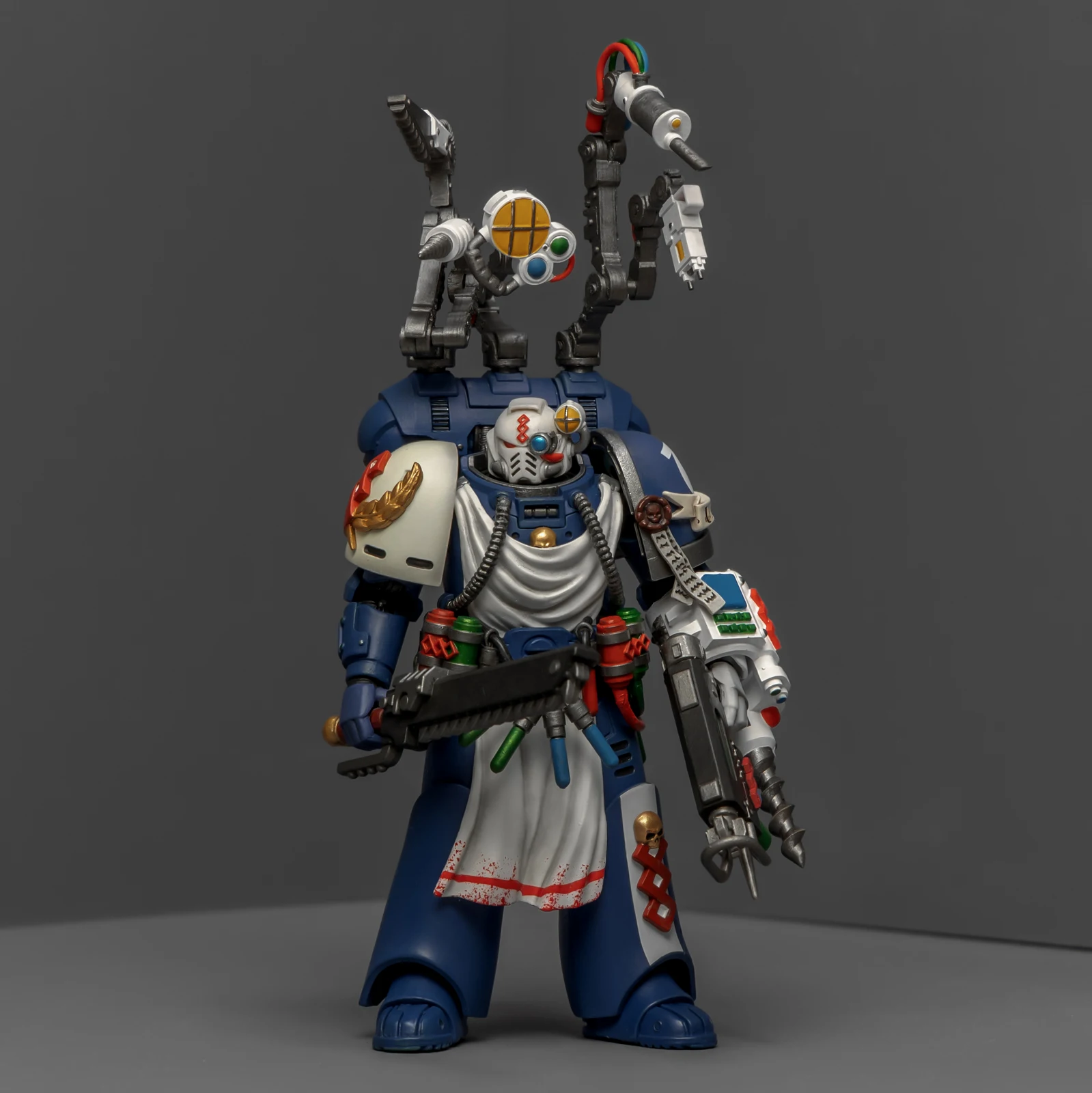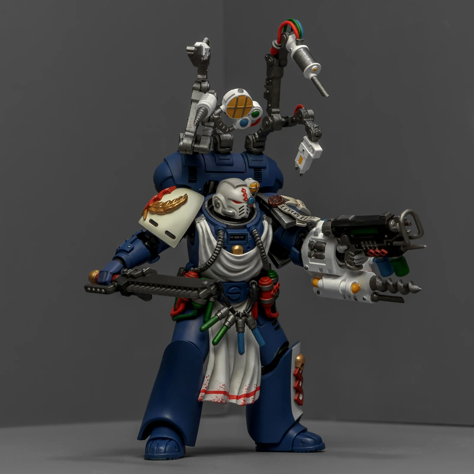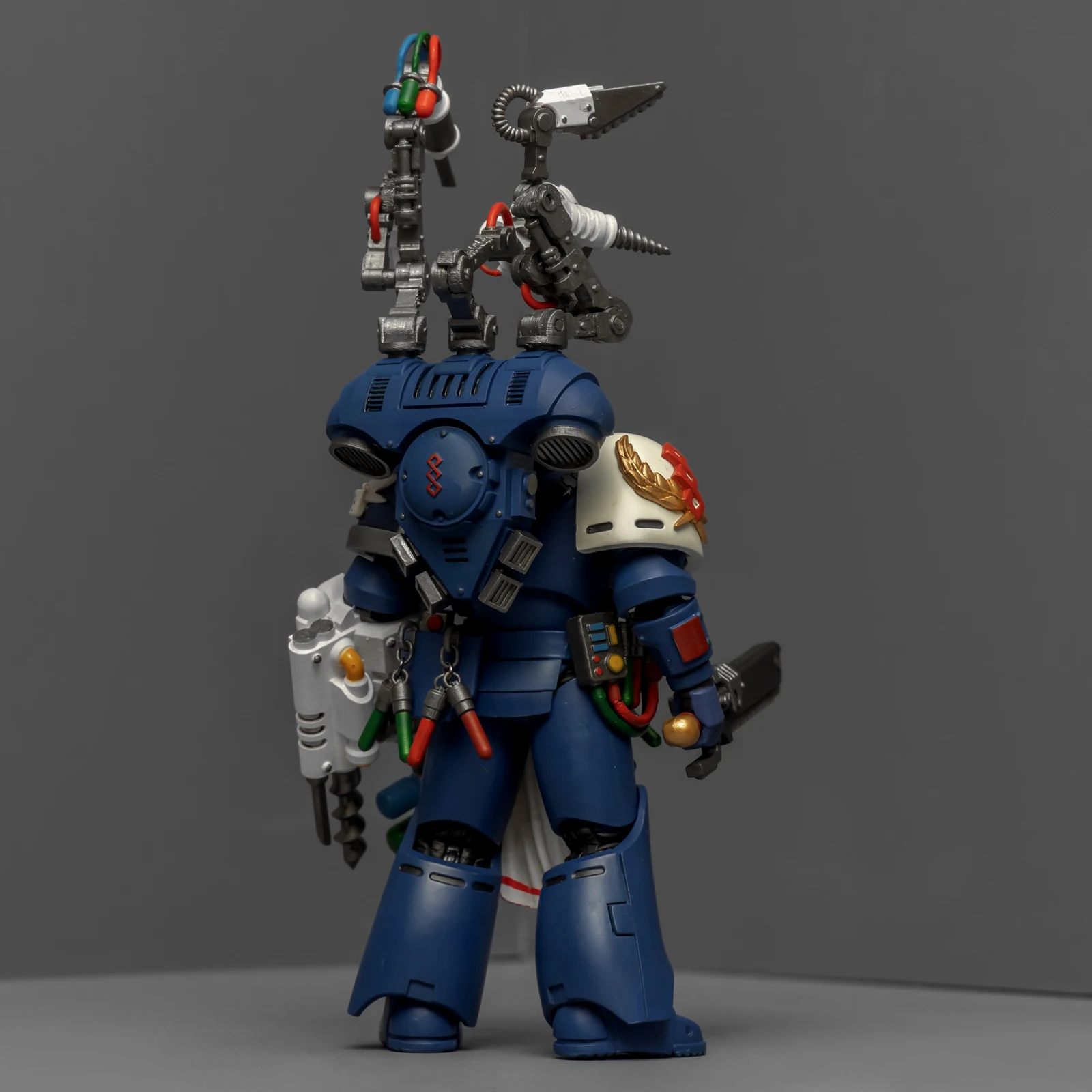 药剂师的改造稍微费了点功夫。我用了前阵子暗源出的荷鲁斯之子药剂师作为基础素体,把全身甲胄彻底重涂成了极限战士的风格,头雕则直接借用了圣血祭司的。为了让“医务工作者”的身份更专业,我另购了一整套打印改件:包括带医疗设备和机械臂的背包、药剂腰挂,还有左前臂的特种装备。配枪也是改件,之前做终结者药剂师的时候多做了一把,正好有点小,给这位用正适合。不过得吐槽一下,这个荷子药剂师的素体可动性确实一般,装上腰挂后可动更加受限,好在身材比例还算协调。