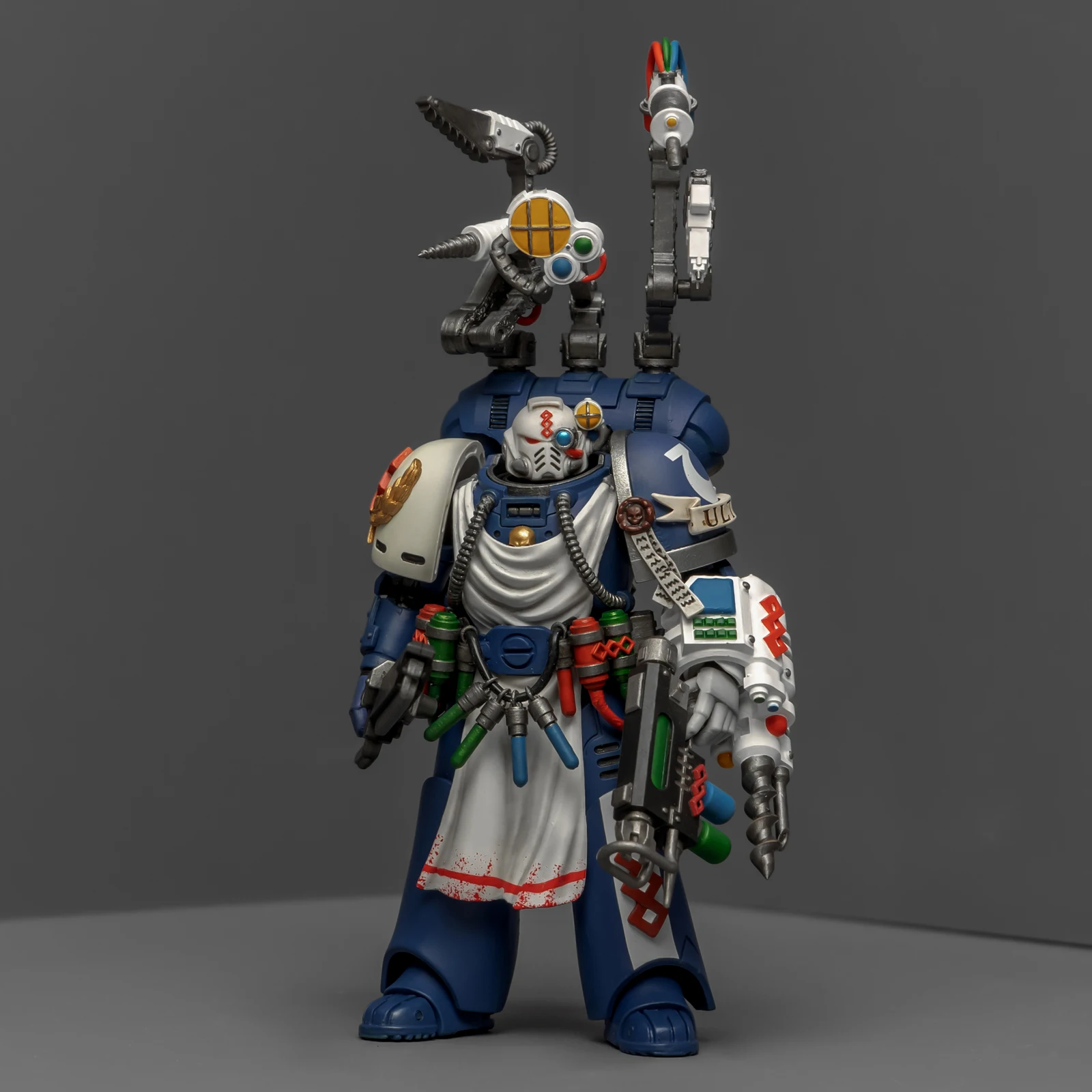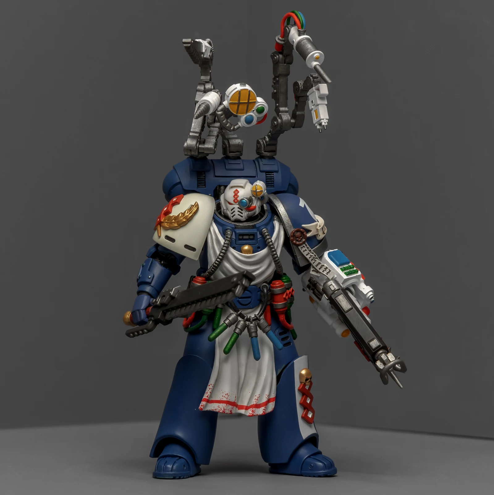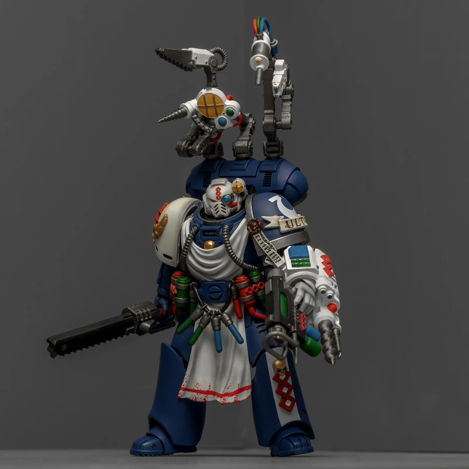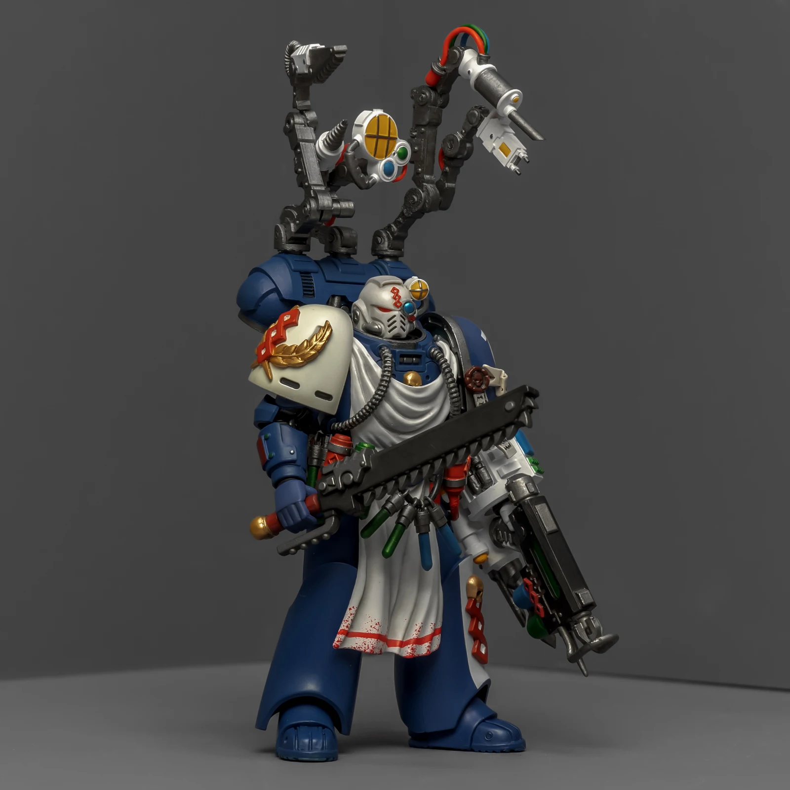 药剂师的改造稍微费了点功夫。我用了前阵子暗源出的荷鲁斯之子药剂师作为基础素体,把全身甲胄彻底重涂成了极限战士的风格,头雕则直接借用了圣血祭司的。为了让“医务工作者”的身份更专业,我另购了一整套打印改件:包括带医疗设备和机械臂的背包、药剂腰挂,还有左前臂的特种装备。配枪也是改件,之前做终结者药剂师的时候多做了一把,正好有点小,给这位用正适合。不过得吐槽一下,这个荷子药剂师的素体可动性确实一般,装上腰挂后可动更加受限,好在身材比例还算协调。