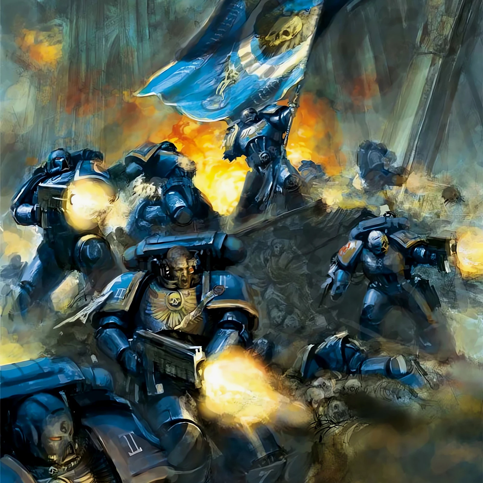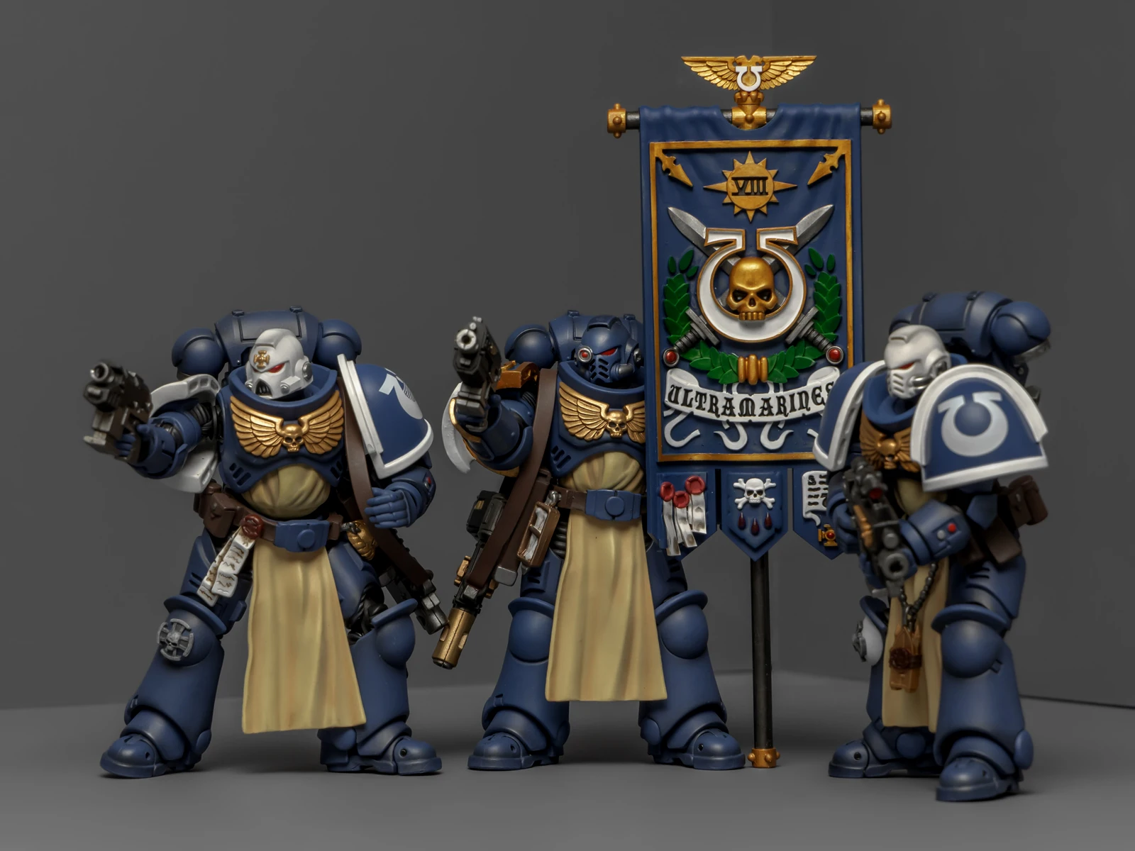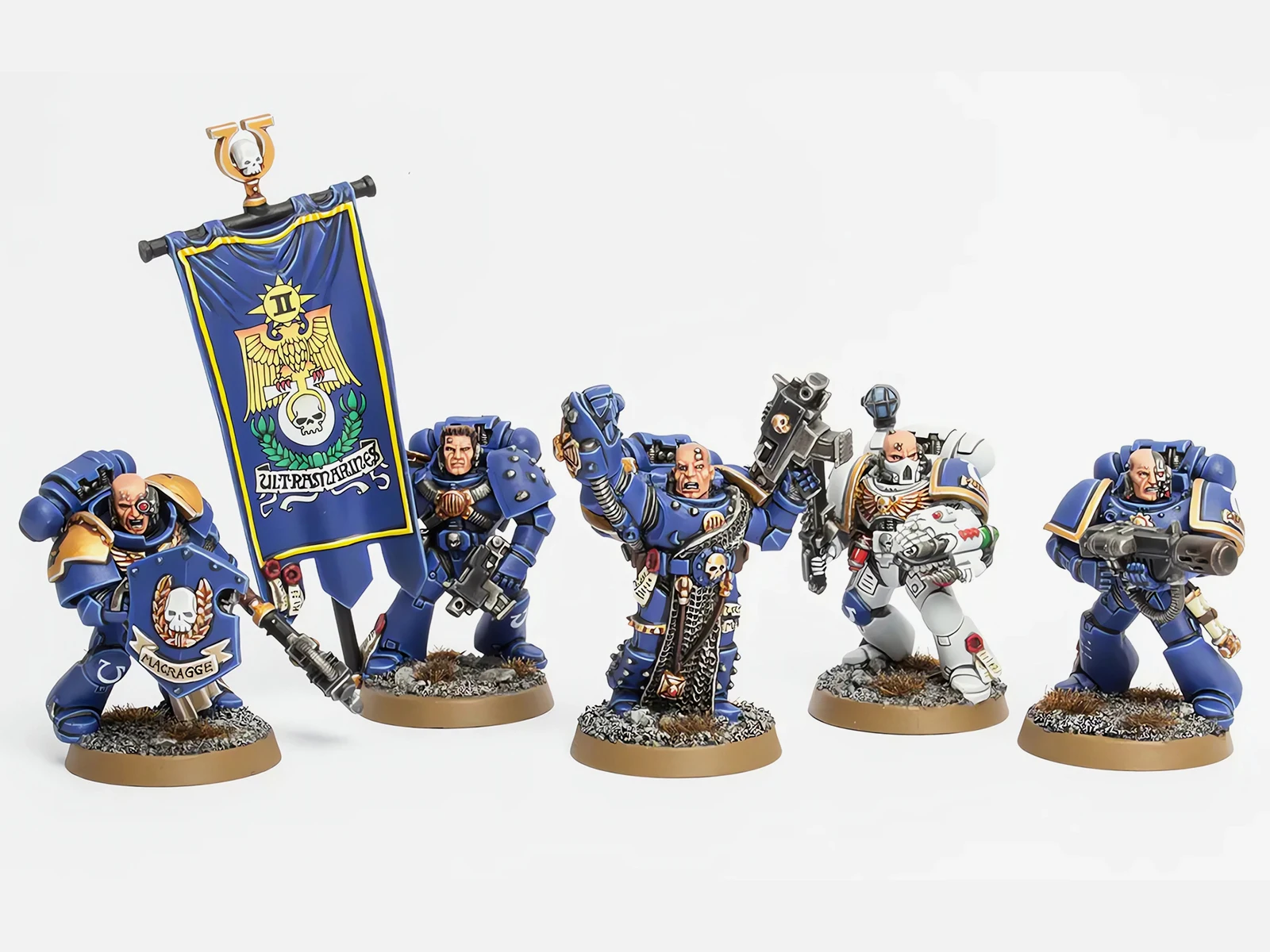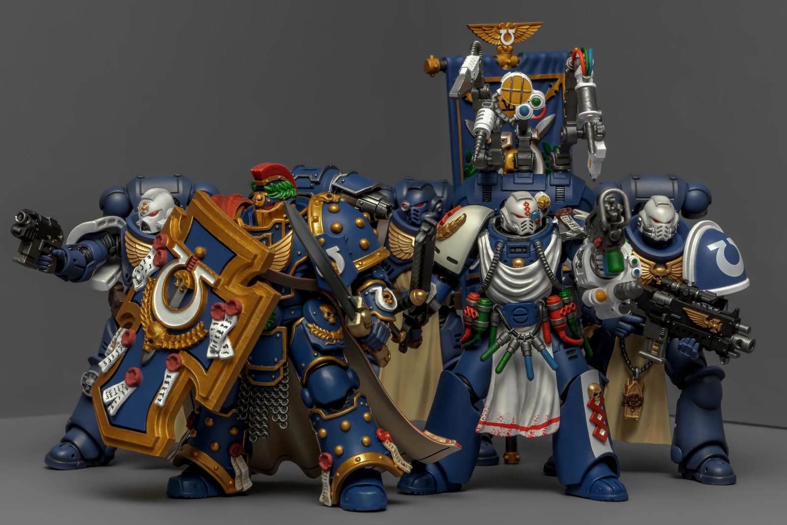 早年GW的战锤40K规则里有个“指挥小队”(Command Squad),配合连长行动,配置挺有意思:一名连队勇士、一名药剂师、一名旗手,再加上两个老兵。他们的主要职责是连长的贴身保镖,哪儿危险冲哪儿。最近手头没什么新的暗源极限战士好入,闲着也是闲着,翻规则书时瞧见这个单位,琢磨了一下,发现凑齐这五人组难度倒也不算大,索性动手整一队。
