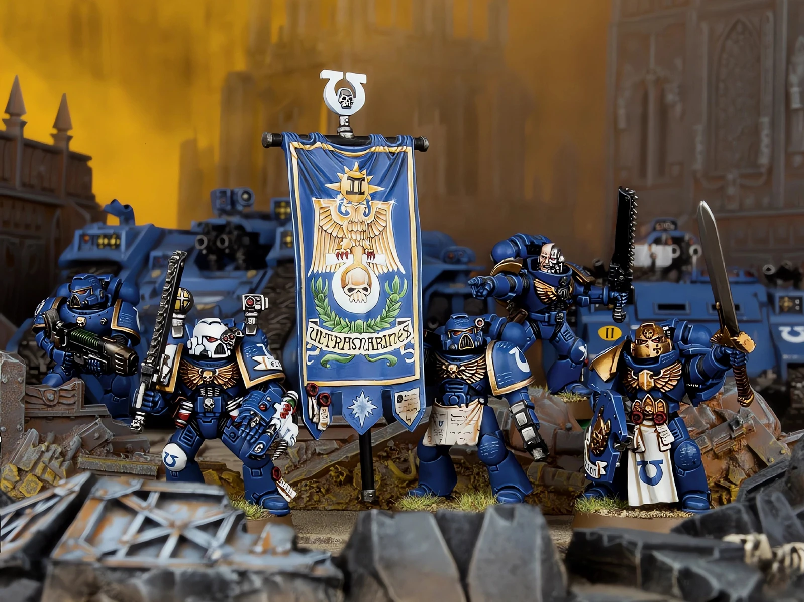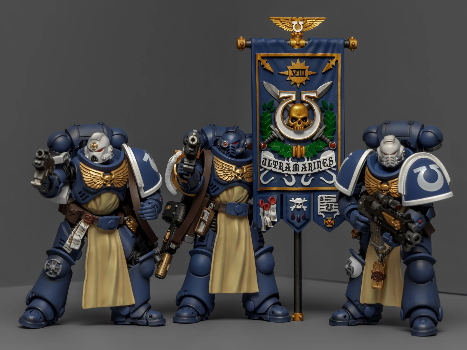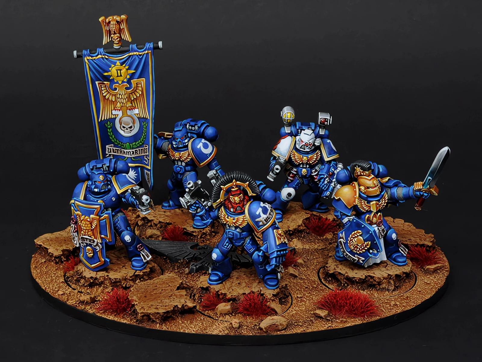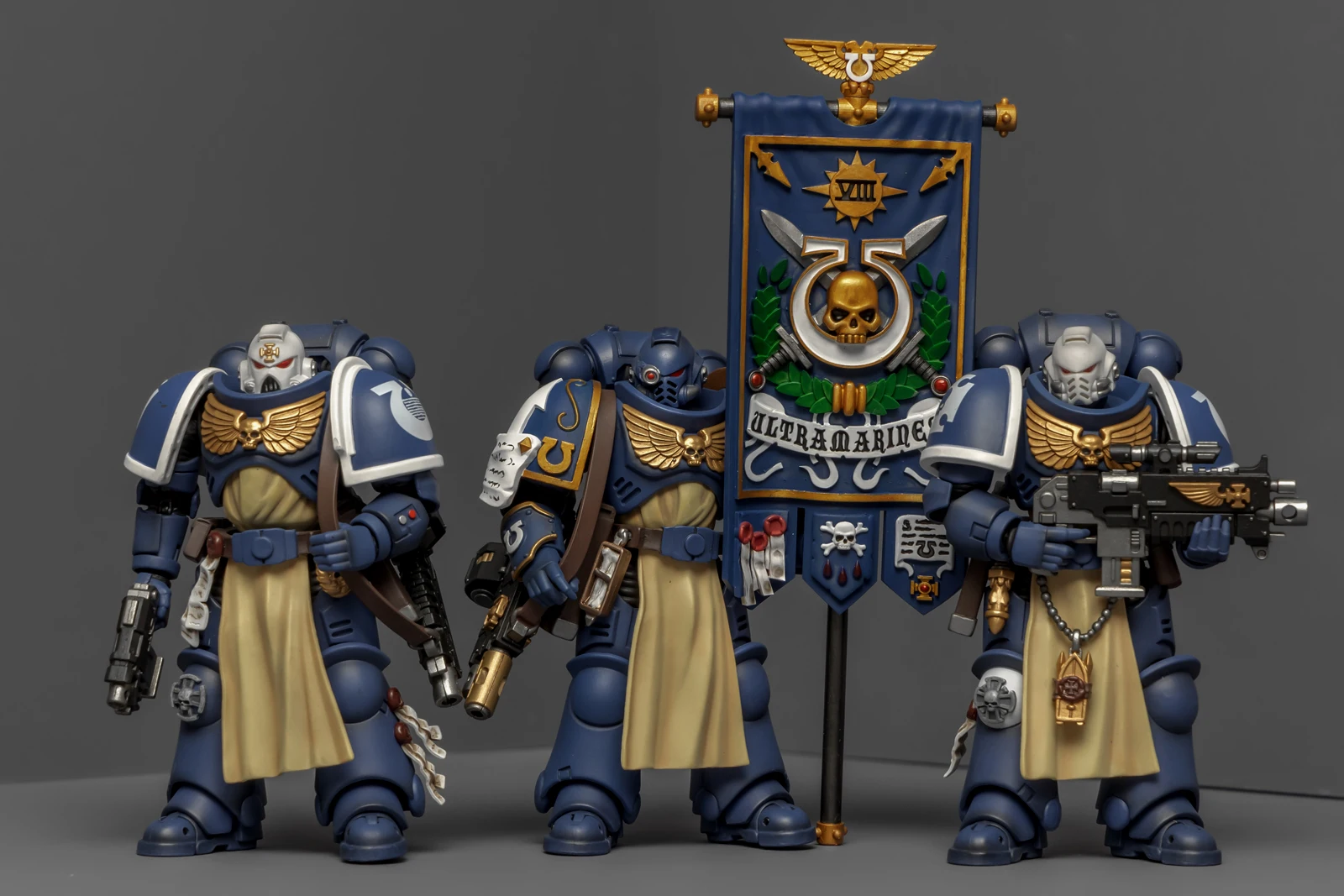 早年GW的战锤40K规则里有个“指挥小队”(Command Squad),配合连长行动,配置挺有意思:一名连队勇士、一名药剂师、一名旗手,再加上两个老兵。他们的主要职责是连长的贴身保镖,哪儿危险冲哪儿。最近手头没什么新的暗源极限战士好入,闲着也是闲着,翻规则书时瞧见这个单位,琢磨了一下,发现凑齐这五人组难度倒也不算大,索性动手整一队。