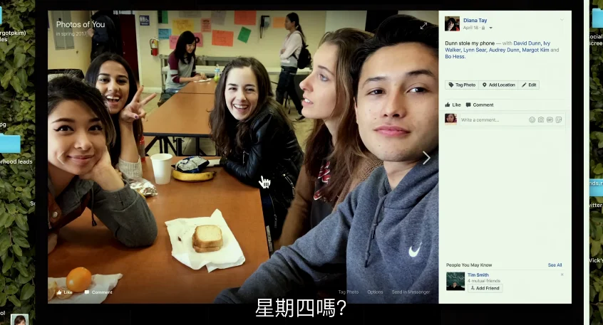 如果前半段,通过电脑记录女儿美好的童年时光,这看似温馨的话,从女儿失踪的那一刻开始,这个社交网络时代就在不断地吞噬着父亲、甚至我们所有人。影片看似简单的故事剧情,其实细细想来却从不那么简单——主创团队通过这部电影抛出了一个尖锐的问题:你在社交网络上的生活,真的是你的生活吗?你在不论脸书还是微博甚至微信上的好友,真的是你的好友吗?
