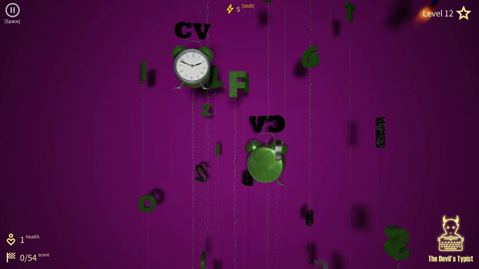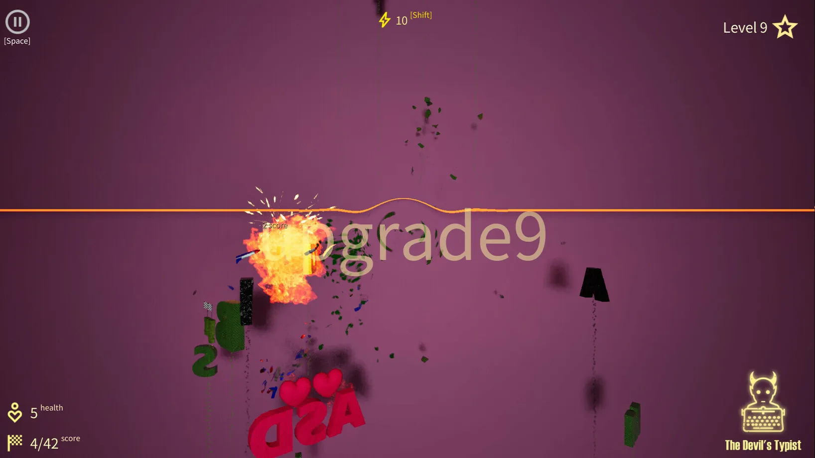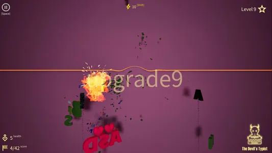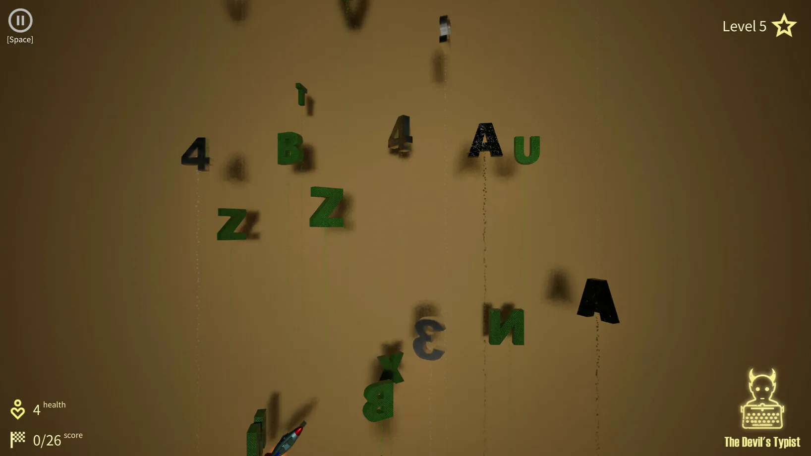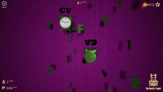 这一款键盘游戏,利用键盘上的大部分按键,根据屏幕上出现的字母进行消除。当玩家的“健康”值消耗完以后,会自动下降一个级别,当达成“分数”目标时会自动上升一个级别。游戏没有结束,可以无止境的进行下去,但是难度会越来越大。