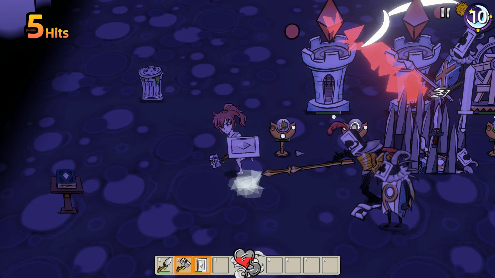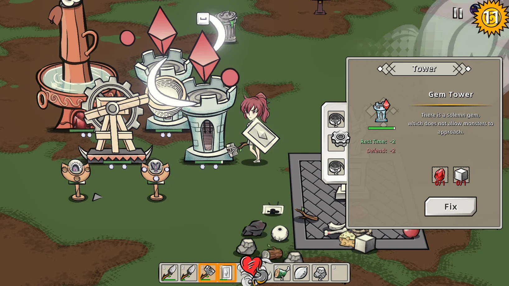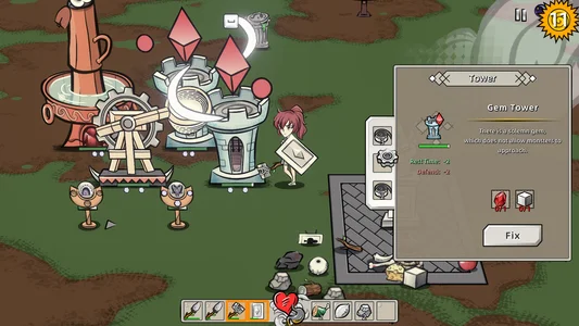 这是一款 2D 风格、生存+塔防+陷阱玩法的游戏。白天你需要尽快收集物资,建造防御塔或陷阱,抵御夜晚来袭的怪物。
