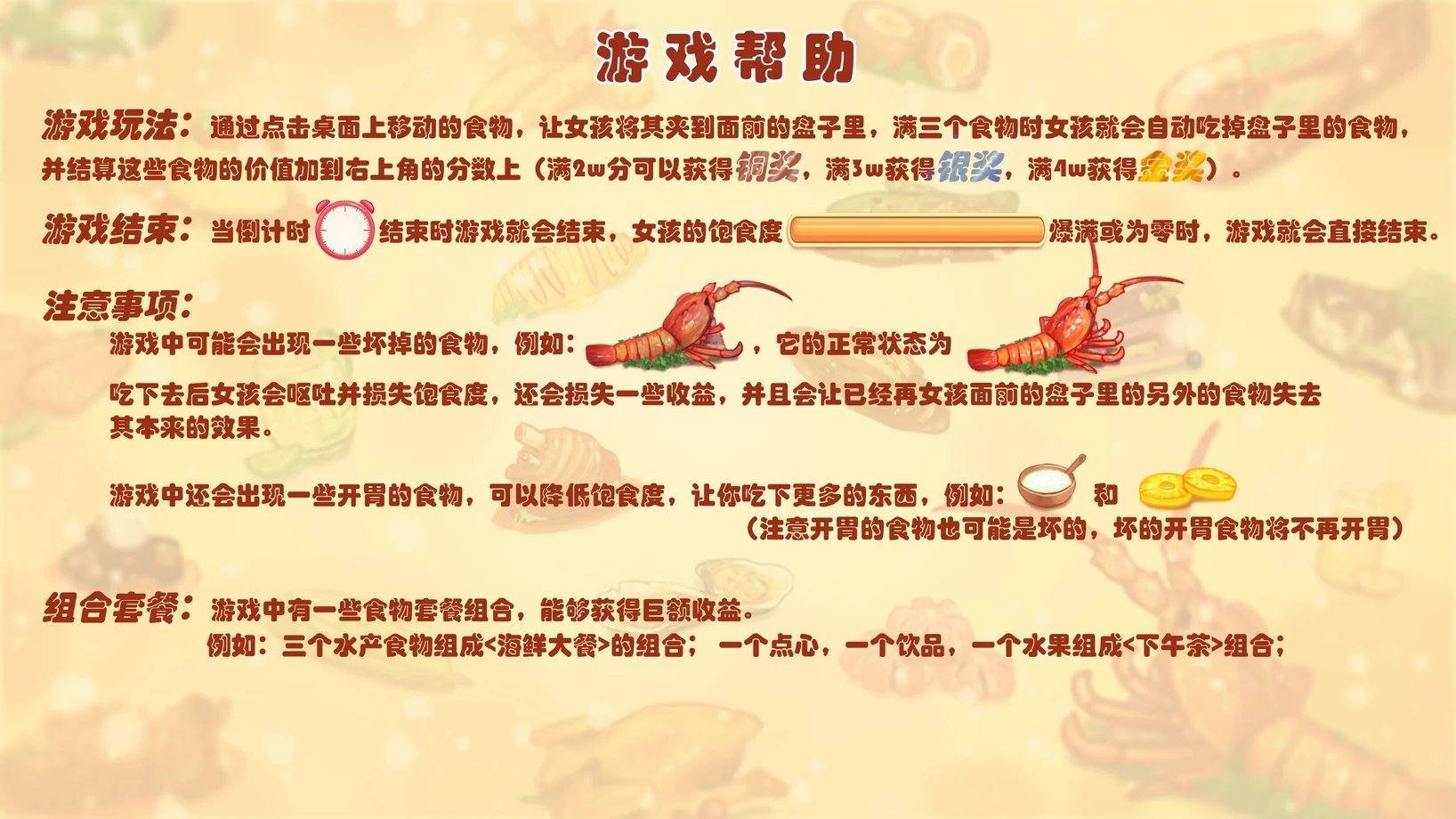 昨天你吃着自助还唱着歌,突然就拉肚子,根本就没赚门票钱。 今天你要一雪前耻,一定要让自助餐老板看看什么叫大胃王。 点击选择食物,大吃特吃! 别吃太多哦,不然会有副作用。 注意:请不要在现实中模仿。 在线试玩链接:https://fzfish.itch.io/eat-and-eat