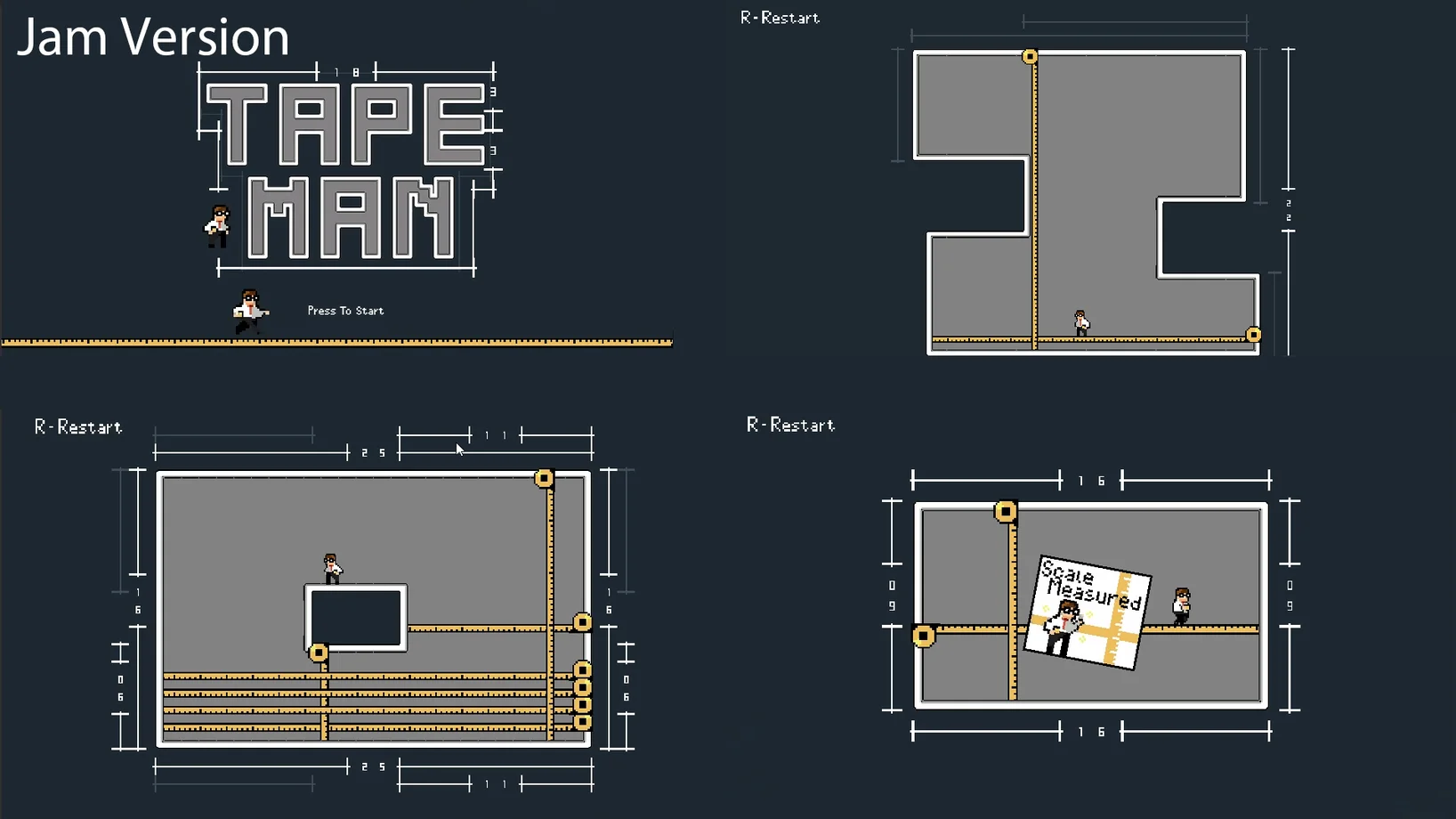 完整版制作中! 卷尺人是一个充满了“知识锁”的平台跳跃解谜游戏。巧妙利用你手中的卷尺,来探索一个由谜题组成的巨大的迷宫。你的卷尺既是平台,也是障碍,以及更多用法等你来发现。 steam页面: https://store.steampowered.com/app/4051290/_/ ------------------------------------------------ GMTK2024作品 控制: J/Z/鼠标左键 扔卷尺 WASD 或箭头键移动 空格键跳跃 R 重新启动。 Ctrl + Z 撤回操作