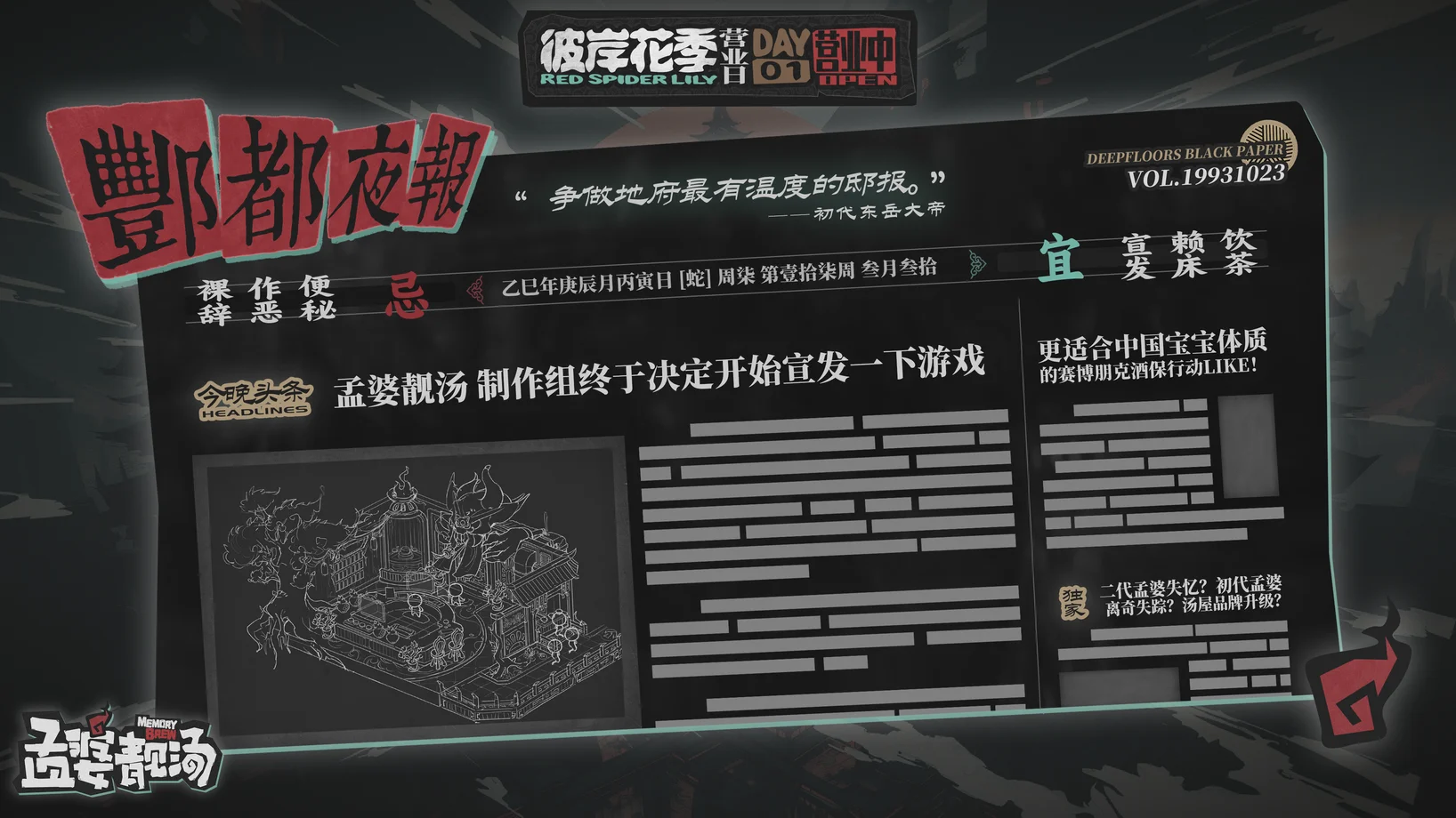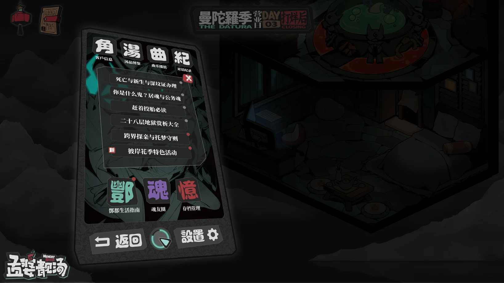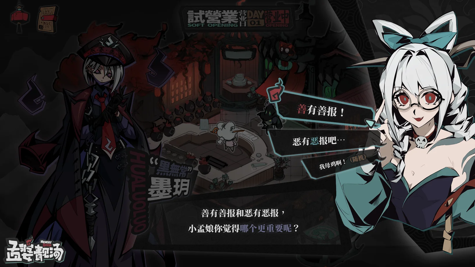 阴间地府朋克 × 老火汤模拟器 !关于“新一任孟婆刚上岗就失忆这件事儿”的调饮类视觉小说。黑色幽默的剧情设定、群魔乱舞的地府公务员、千奇八怪的失忆汤品、阴间朋克的美学风格,为你呈现地府百态~本店的宗旨是——没有回头客!
