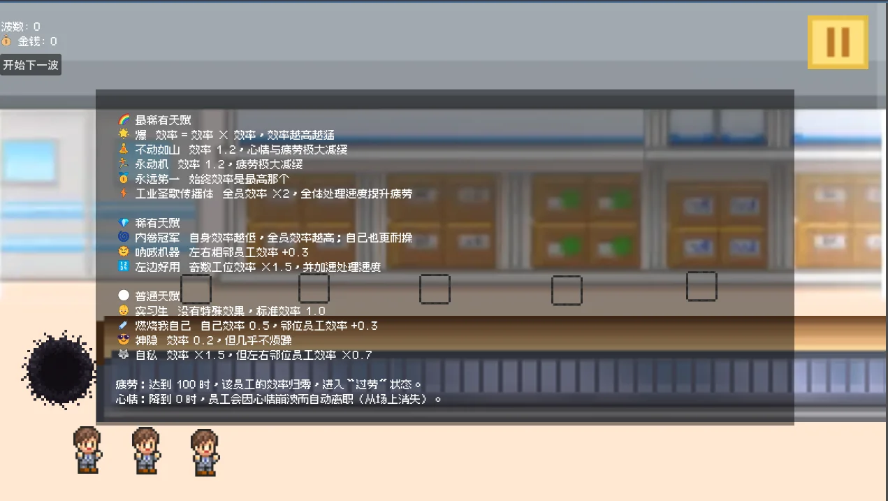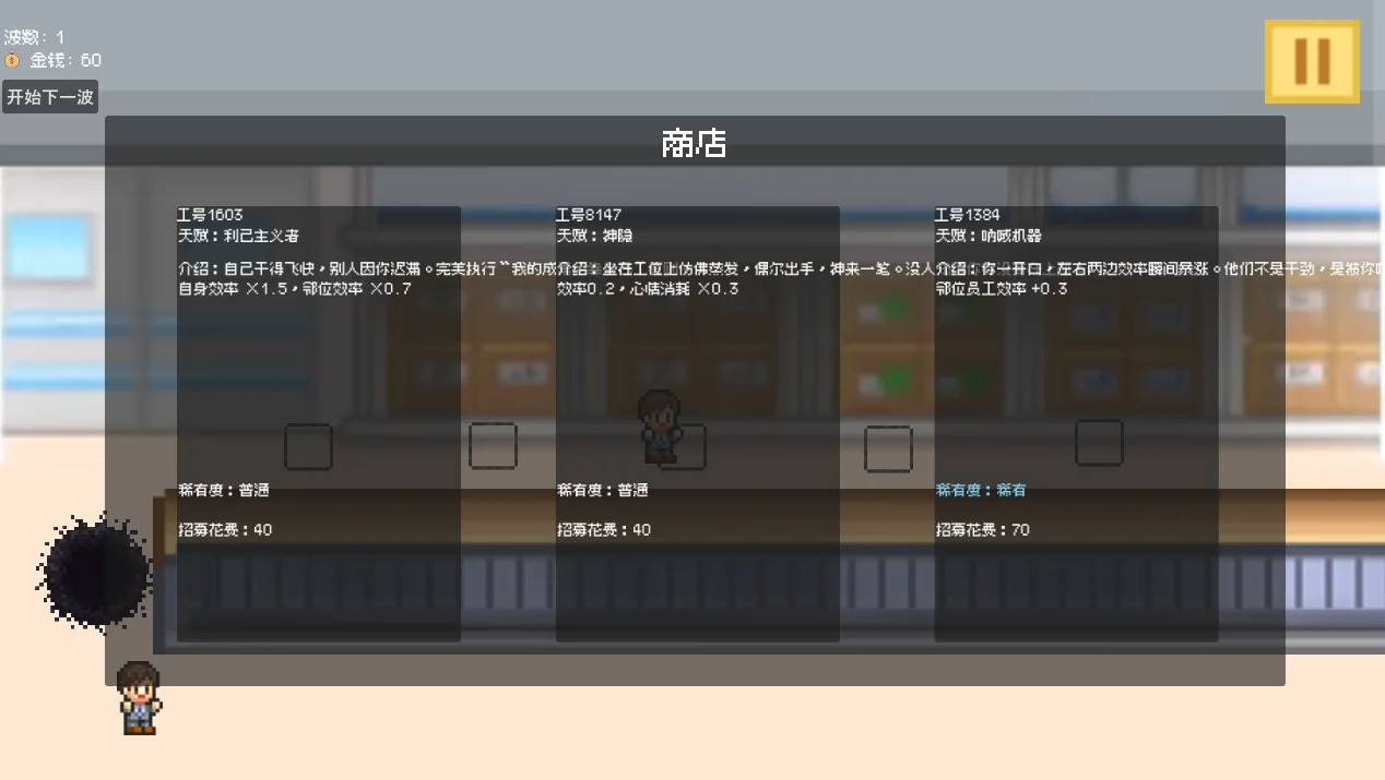 pixelCEO一款2.5D像素风策略模拟游戏,玩家需招募拥有不同天赋的员工,合理配置至流水线岗位,在有限资源下完成一波波产品处理任务。团队协作与奉献精神是制胜关键。