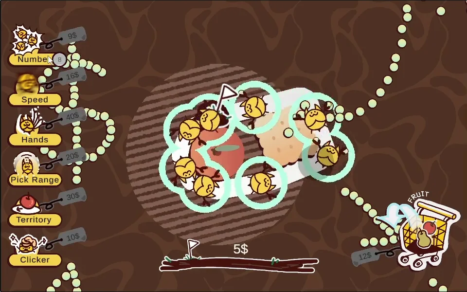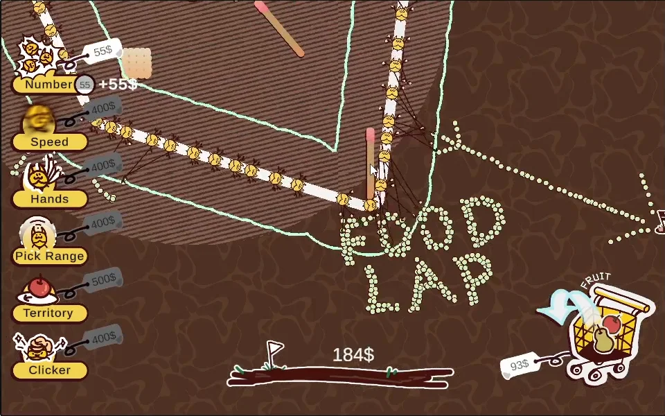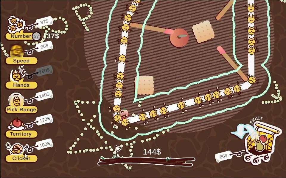 操作: 只需鼠标操作。 拖动即可移动镜头,滚动即可缩放。 游戏玩法: 点击水果即可爆出食物供小虫子拾取。 点击水果车即可将水果放入领地,扩大路线。 点击升级来加速赚钱! 用食物扩张你的领地,为小虫子找到终点!