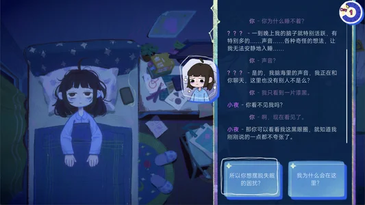 剧情讲述一位饱受失眠困扰的女孩——小夜,每当夜幕降临,她的大脑便开启喧闹的派对,而一些不良的睡眠习惯,更是让入睡难上加难。 她需要你的倾听,需要你为她排除那些不利于睡眠的杂念,引导她走出失眠的循环,最终,睡个好觉。 轻松诙谐的日常故事 小夜非常擅长和自己“开会”,而你,将成为她脑海中一个新来的、代表着“睡觉吧”的声音。 在陪伴小夜度过的一个个不眠夜里,你将透过零散的记忆片段,逐渐拼凑出她的过往,了解她的为人,并最终触及导致她失眠的*真正*原因。 游戏有多种结局 她或许会因过量服用安眠药而陷入危机,也可能在连续通宵后,倒在白天繁忙的工作中……这位眼圈重重的少女,能否等来一个安稳的睡眠?