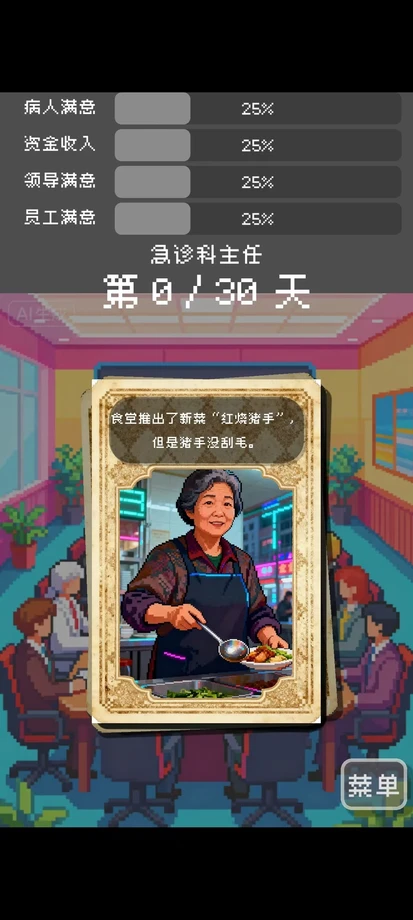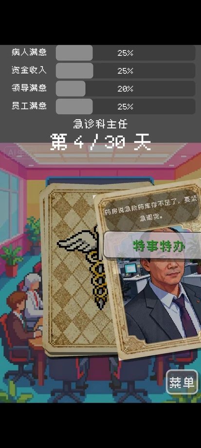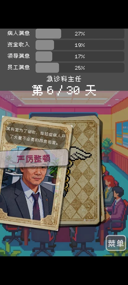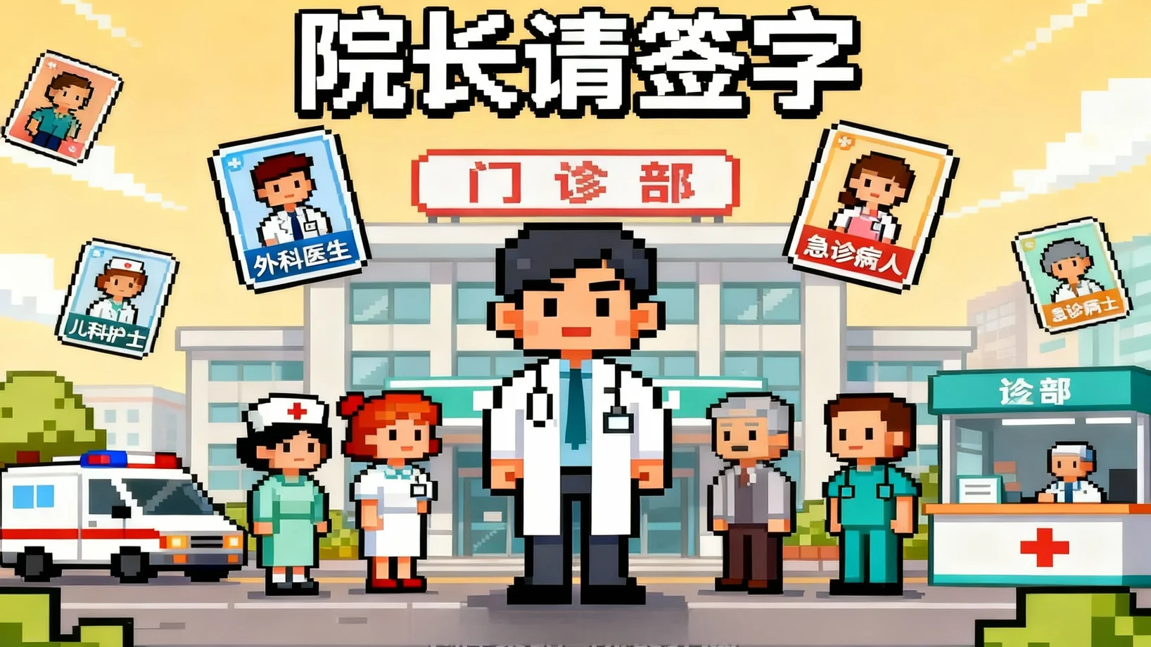 这是一款极繁像素风的职场生存模拟游戏。你将扮演一位中国公立医院的代理院长,通过类似《Reigns》的左右滑动卡牌玩法,在“救死扶伤”与“官场潜规则”的夹缝中做出艰难抉择。