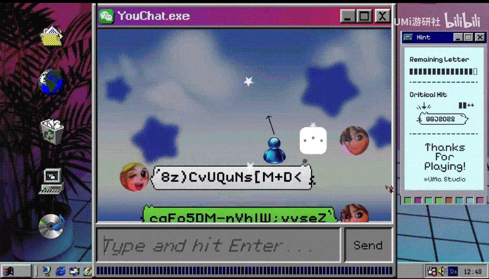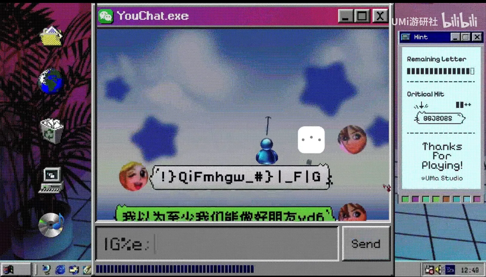 2025 Global Game Jam上海椰岛站作品。你需要打字创造平台,掌握时机发射信息气泡,接住小人,通过聊天记录还原事件的真相…… 玩法:任意键打字,回车键发送!注意可用的字符数有限,需要通过完美接住小人(落在气泡边缘处)来恢复!