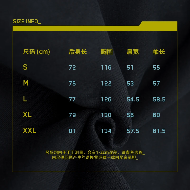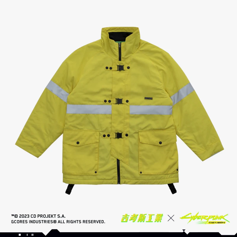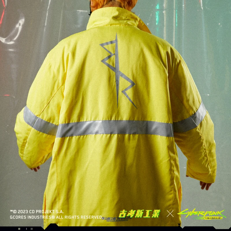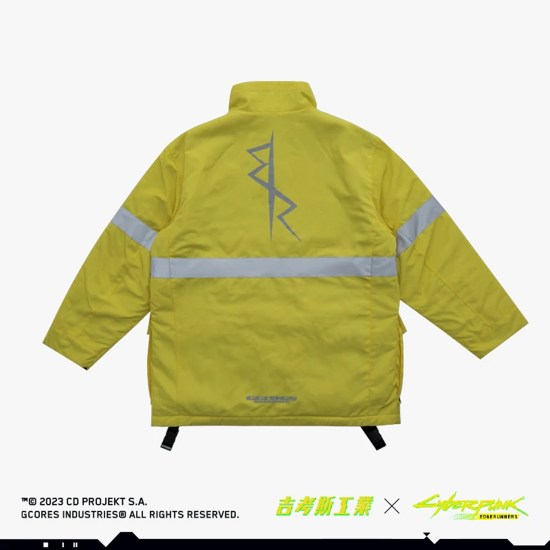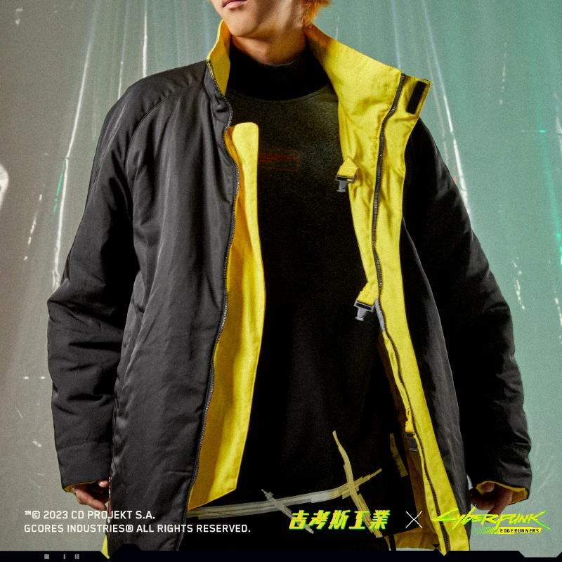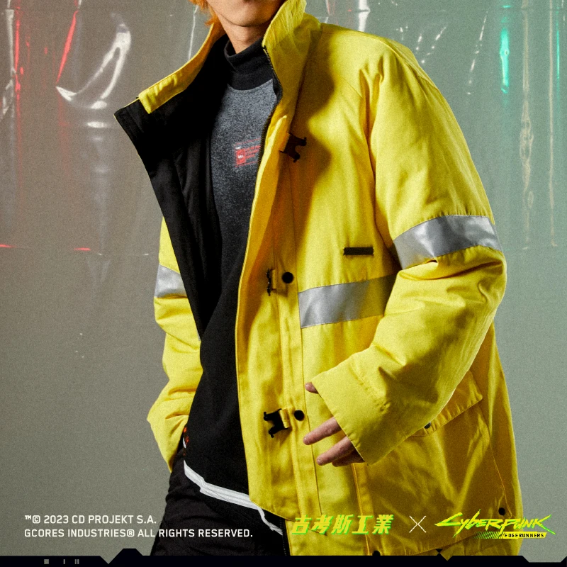 以《赛博朋克:边缘行者》中主人公大卫的同款夹克作为设计灵感,在原外套的基础之上进行二次设计,更加贴近「救援队」的夹克风格,同时还增加了反光条的细节处理,门襟处选用特制防护卡扣,更显质感,选用了与动画中同样的亮黄色作为服装主色调。 -可双面穿着,另一面为黑色面料,并搭配精致的反光印花,低调又不失趣味 -常规休闲版型 -特别开模定制的联名金属牌