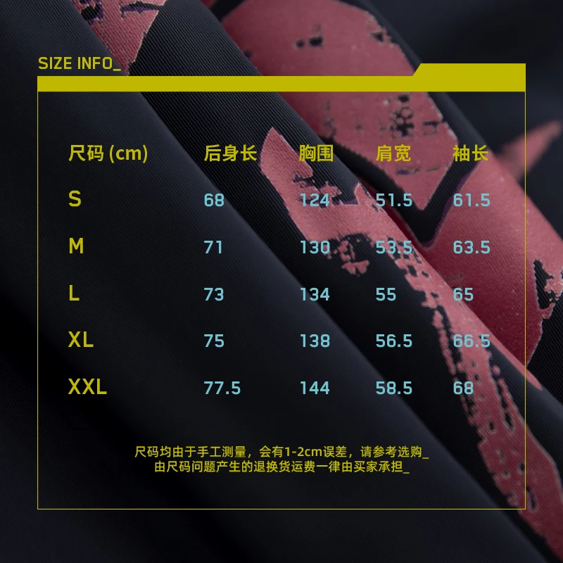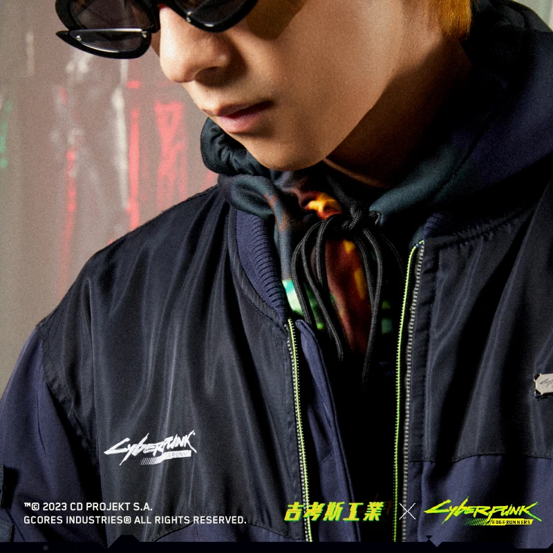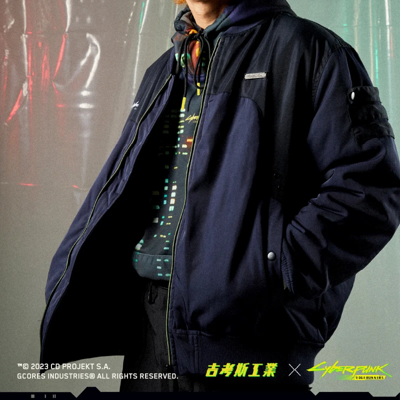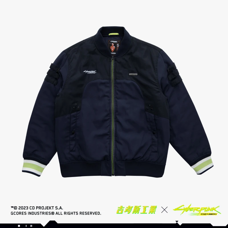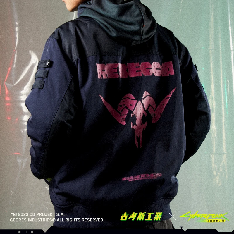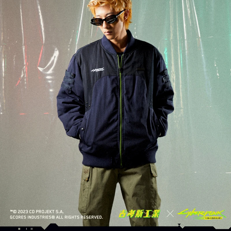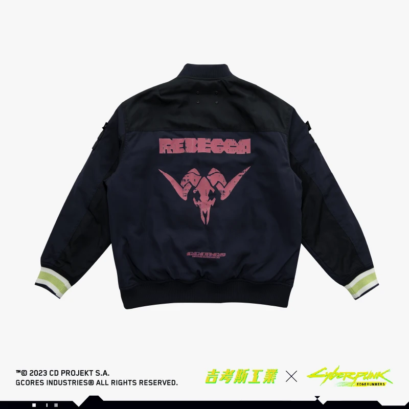 瑞贝卡主题夹棉棒球服,此款设计灵感来源于《赛博朋克:边缘行者》瑞贝卡穿着的大号棒球夹克。服装背后超级醒目的印花logo,出自动画中瑞贝卡身上的纹身图案。拉链处及螺纹袖口的荧光色撞色设计也还原了动画中的服饰配色设计。 -常规休闲版型 -特别开模定制的联名金属牌