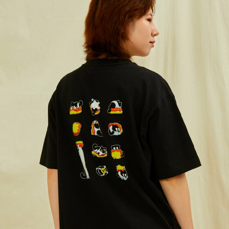 全方面展现CATO黄油猫魅力的时候到了!猫猫和吐司的完美组合图案共同聚集在一件T恤上,你可以看到懒懒趴在黄油吐司上的猫咪、安心蜷缩在吐司旁的猫咪、努力高举吐司的猫咪以及纯粹但诱人的一块黄油吐司等等,多重印花图案发射最高级别CATO可爱魅力! - 百分比棉,克重210g - 背后为数码印花图案,呈现Cato的各种可爱形态 - 前胸印有CATO经典标识,左下角缝有联名织标 - 深色衣物建议单独洗涤
