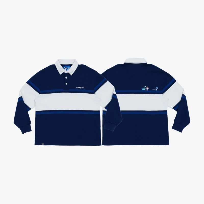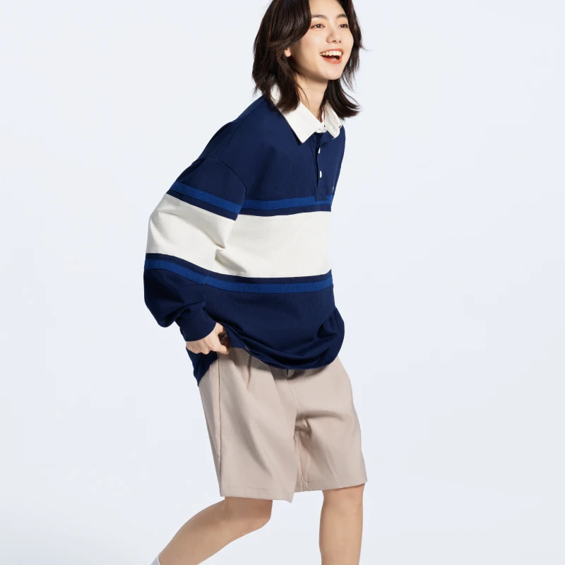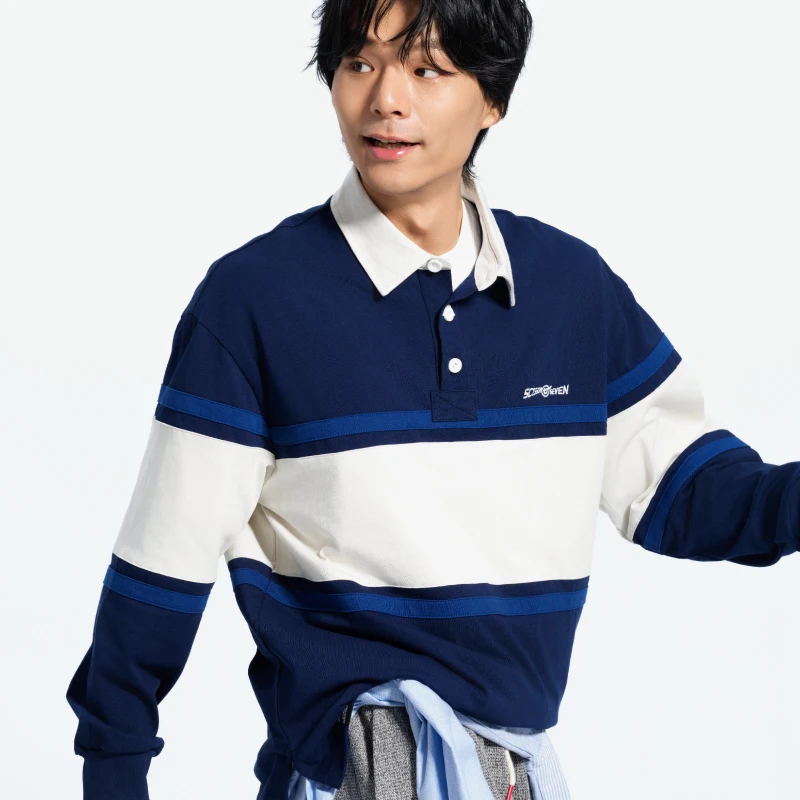 面料采用290g精梳棉混纺,21针双纱编织形成清晰骨位纹,经酵素洗处理使纱线更加有膨松度,穿着更加舒适、透气、吸汗,春季首选。 前胸采用高密绣花logo工艺。款式上采用多色撞色拼接的工艺,让宽大的条纹横跨前胸并延续到袖筒上,视觉上比满条纹的款式更简洁耐看。 版型整体剪裁宽松,米白色的翻领和定制纽扣,可单穿也可内搭衬衫、T恤等,营造更具深层次的Preppy style。 下摆添加了专属设计阿七合作装饰标识,更加有趣味。 主角四人奔跑移动时的动态也进行像素化处理,配合款式的拼接部分增加趣味性。
