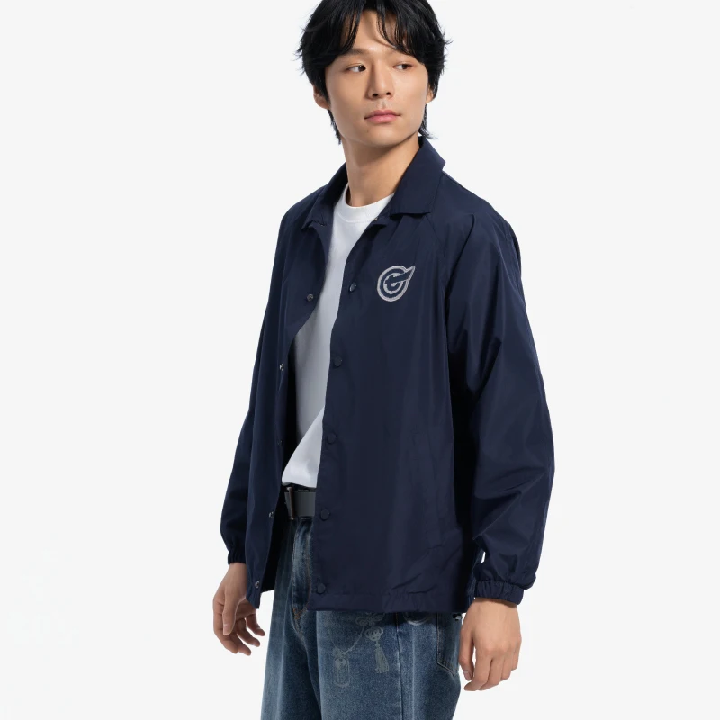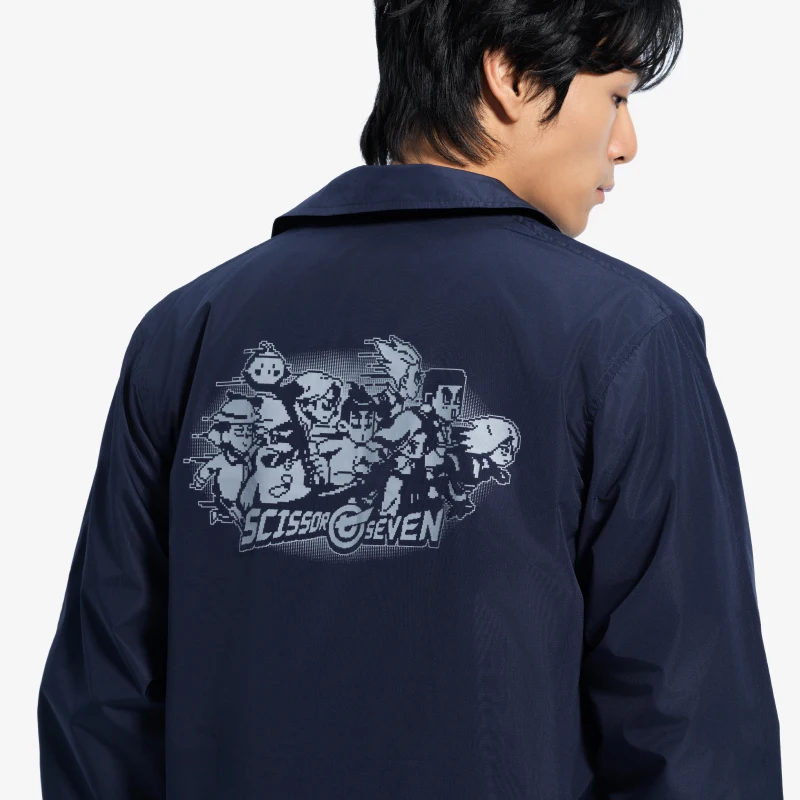 经久不衰的时尚经典教练夹克采用300T春亚纺面料,质地柔软且富有筋骨感,表面呈现哑光与微缎面交织的细腻纹理。 花灰色调通过深浅纱线混纺工艺,打造低调耐看的层次感。 版型以宽松剪裁为基础,前片运用插肩袖设计更多活动量,厚片用正肩,更有型,将立体裁片与平面裁片创新组合,形成自然褶皱与流动线条。 翻领设计搭配顺色四合扣门襟,兼顾实用性与简约美感。双侧插手袋,袖口松紧带可调节围度,下摆抽绳实现收放自如的廓形切换。 套头帽衫采用隐藏式走线工艺,抽绳末端包裹定制硅胶扣防止滑脱。 “全角色集结”主题后背印花采用满版工艺进行视觉呈现,通过提取游戏原作与动画剧集中的核心角色形象,以多角色动态拼合构图形成视觉张力,构筑出跨越次元界限的沉浸式叙事氛围。