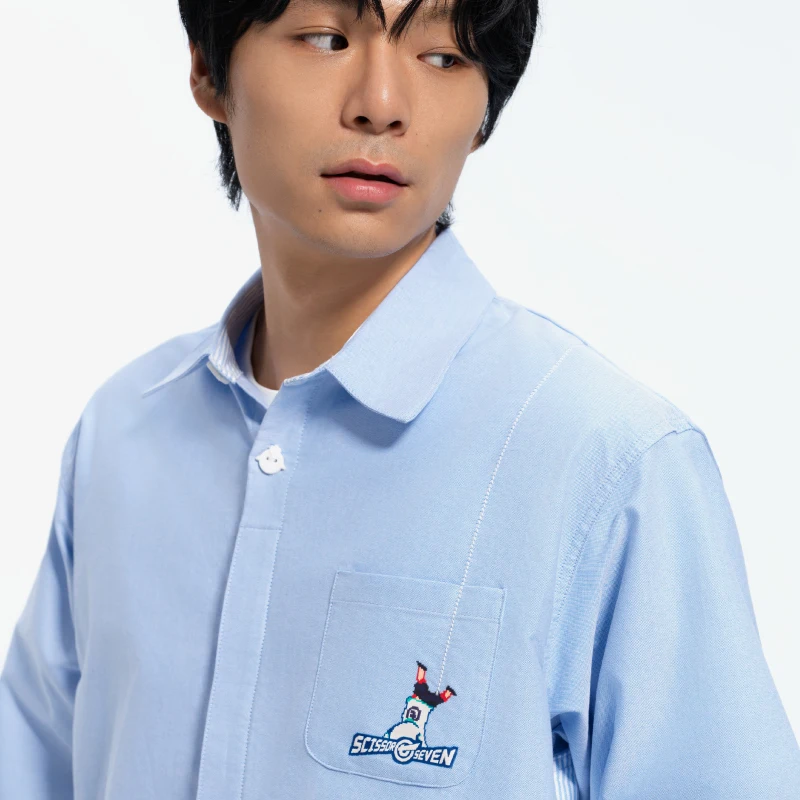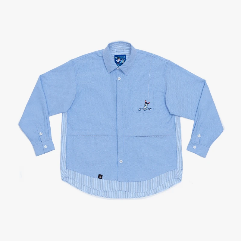 长袖衬衫面料采用双色牛津纺,通过深浅灰竖条纹拼接打造假两件层次感。前身运用数字印花与贴布绣复合工艺。 鸡小飞携阿七逃离的场景图案被解构成几何像素块,前胸采用0.2mm镂空锁链绣连接前后片图案,形成二维与三维交织的空间感。 前两颗门襟扣定制小鸡形状树脂纽扣,突出独特设计语言。 版型在传统衬衫基础上增加8%松量,落肩剪裁配合圆弧形下摆,后背加入2cm活褶提升活动余量。 内侧假两件结构通过本布包边工艺衔接,领座隐藏式插片确保立挺度,袖口反卷设计可露出格纹内衬。