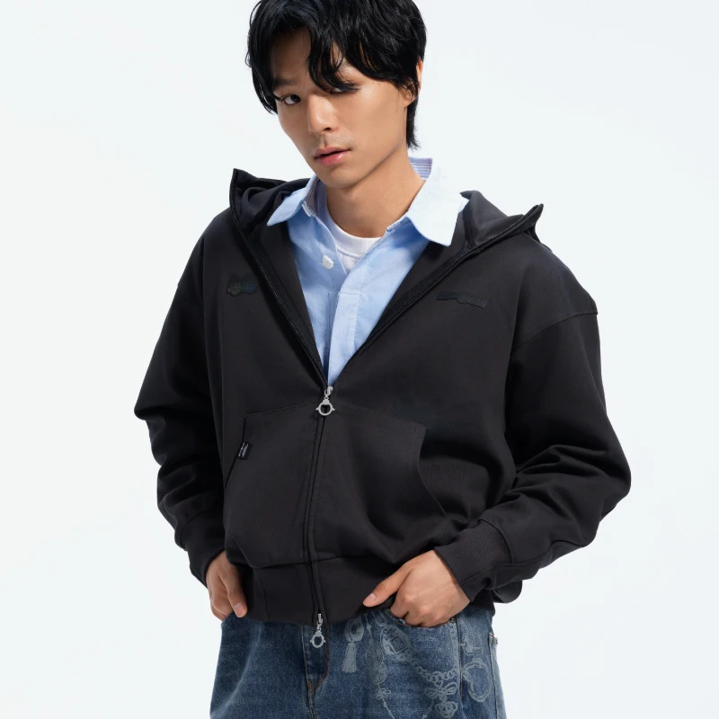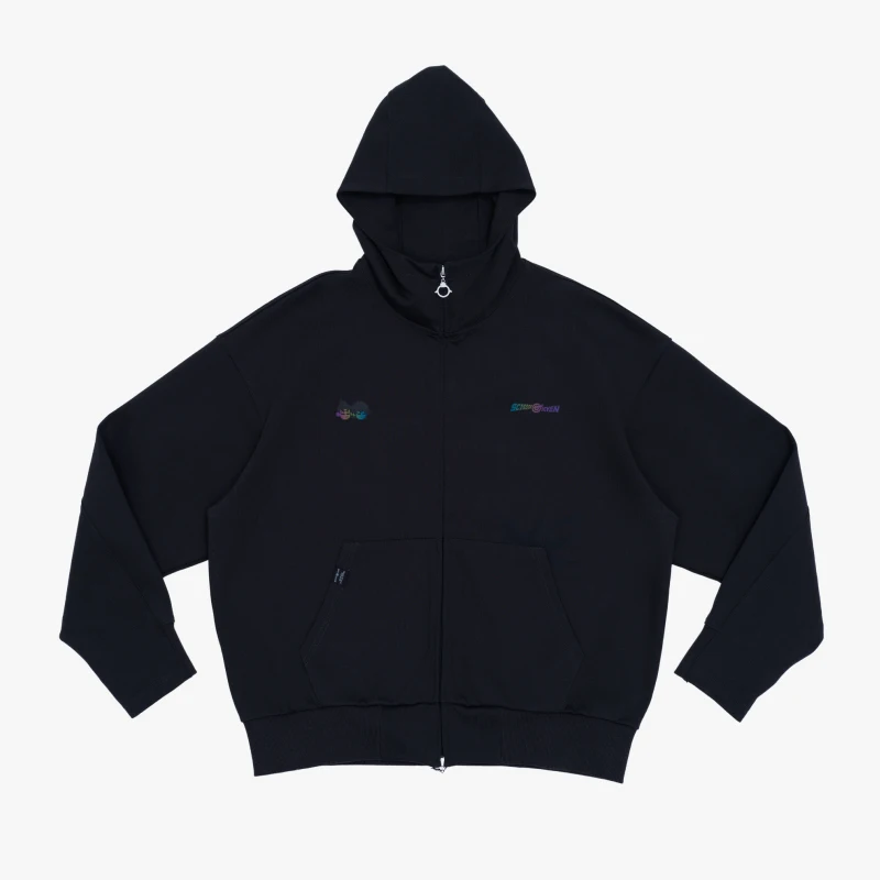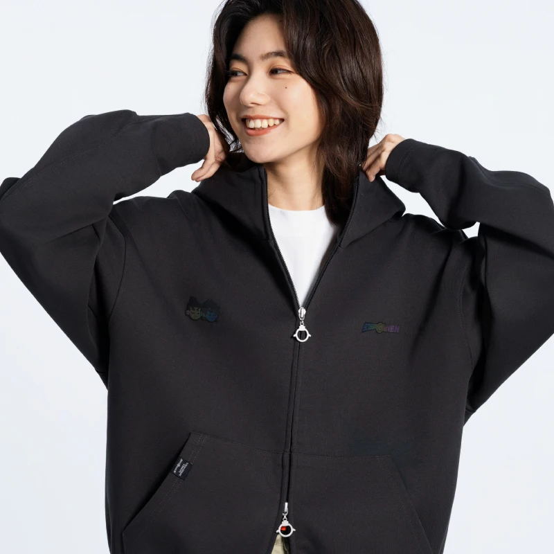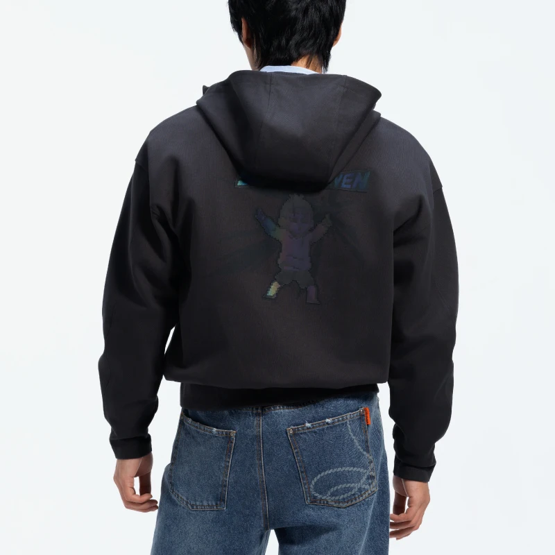 隆重介绍——针织外套所采用的独特彩色光变工艺。 在后背结合阿七的标志动作上,我们采用三层工艺复合叠加,水印+激光超纤底材+炫彩反光膜,随视线转动产生不颜色的虹彩效应,凸显系列自由、有趣的设定。 拉链头采用锌合金压铸开模,IP限定鸡小飞形象,体现满满的细节。 款式版型上,立体袖笼增加更多活动余量,螺纹袖口创采用了弹性记忆螺纹,超长保持形态,久用不变型。 双分割帽型,更多空间,不勒不紧绷。