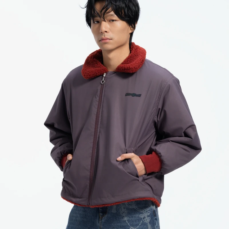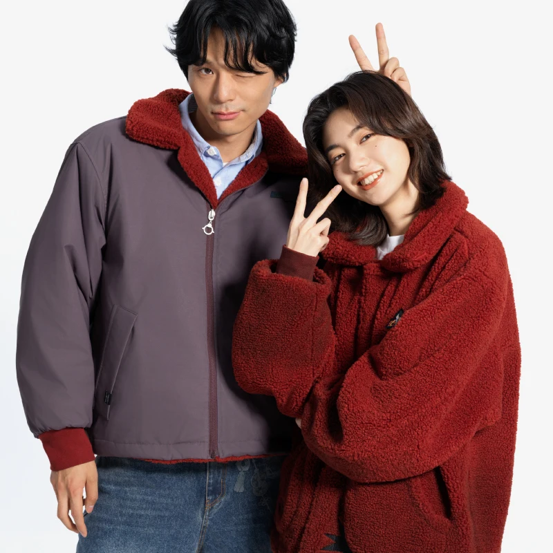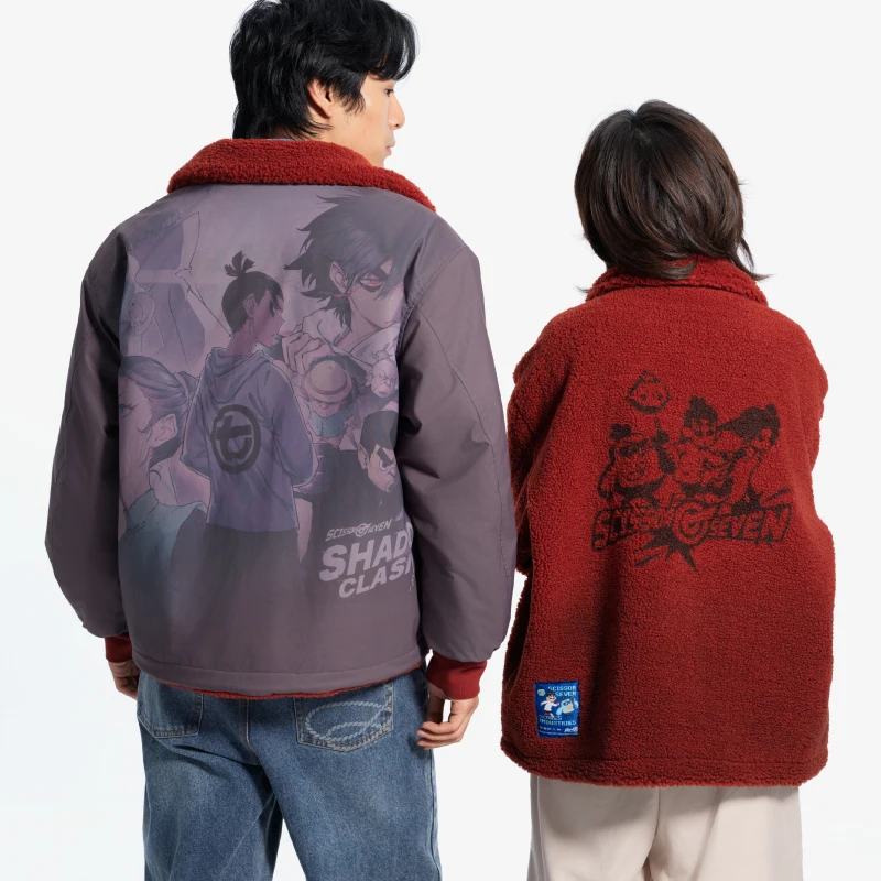 我们想要打破常规的束缚,用不对称的门襟设计来展现自由不羁的感觉。 外侧聚酯面采用做旧花灰三防涂层,轻松应对日常意外,添加了静电处理也让穿着不会有带电的尴尬。 内里的羊羔绒面进行了渐变喷涂特效,整体低调却不失沉闷。 图案双面图案上选择了《伍六七》的美术以及像素化主角们的形象,配超大尺寸比例印花图案,搭配以四散的爆炸花纹来平衡视觉更加实穿。 版型宽松舒适,翻领设计也更显可爱。
