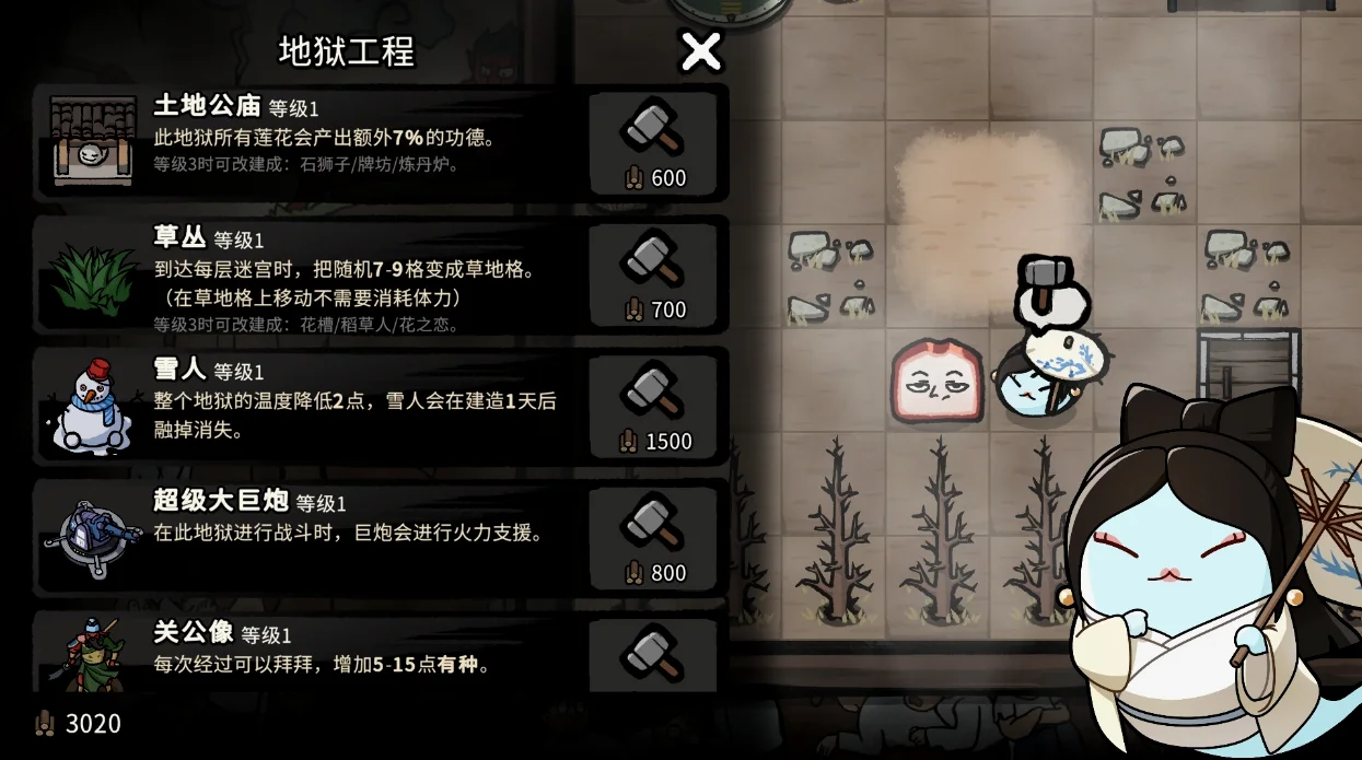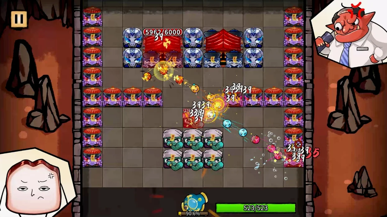 游戏的战斗部分则是采用“打弹珠”的游戏方式,在这个关卡里我们需要依靠主角叉烧兄手上的“灵力大炮”释放各种弹珠,击溃所有来犯的各式可爱的小鬼怪。弹珠有各种形式,在我们探索楼层升级的时候能获得选择,鬼怪也都有着自己的各种机制,怎么在这之间取得优势平衡就靠大伙自己对这无厘头的机制进行理解了!这里提供一个小技巧:多以横向打俩边进行多次弹反,这样能造成的伤害是最大化的,直线向上只会造成各种弹丢。